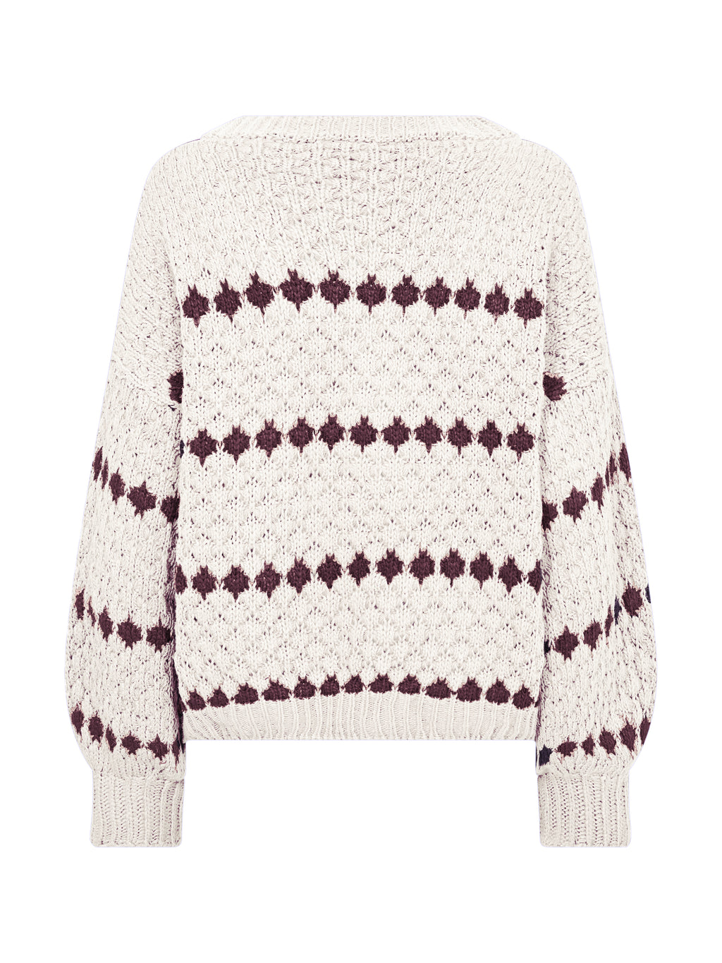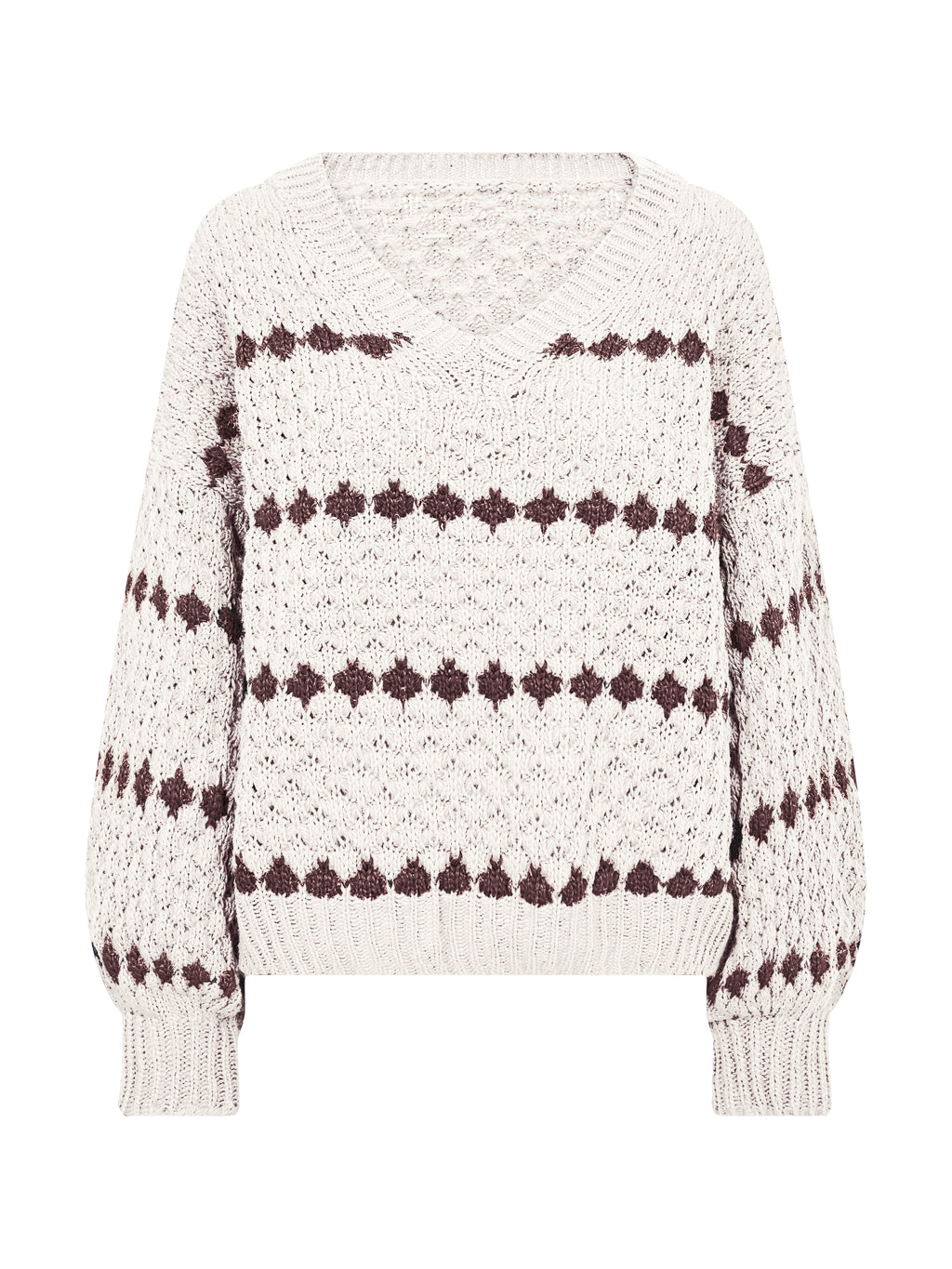 De trui heeft mooie details en een klassieke uitstraling. Het heeft een v-hals, lange mouwen en een patroongebreid ontwerp met strepen, wat karakter geeft aan de trui. De pasvorm is normaal met ribboord onderaan en bij de mouwen, wat het uiterlijk op een eenvoudige manier afrondt.