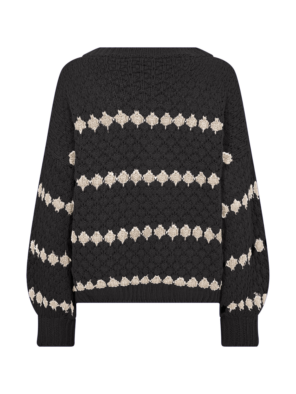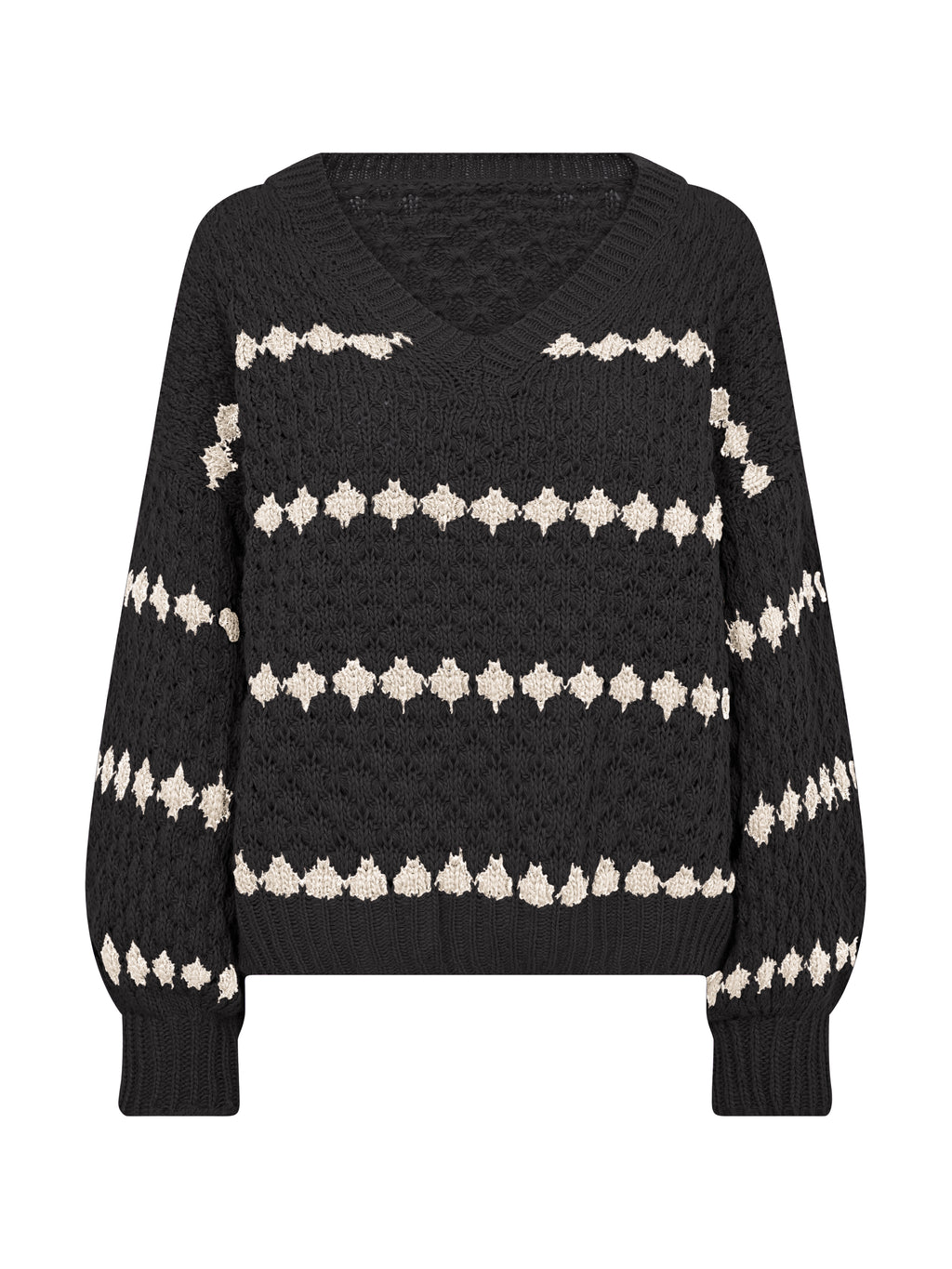 De trui heeft mooie details en een klassieke uitstraling. Het heeft een v-hals, lange mouwen en een patroongebreid ontwerp met strepen, wat karakter geeft aan de trui. De pasvorm is normaal met ribboord onderaan en bij de mouwen, wat het uiterlijk op een eenvoudige manier afrondt.