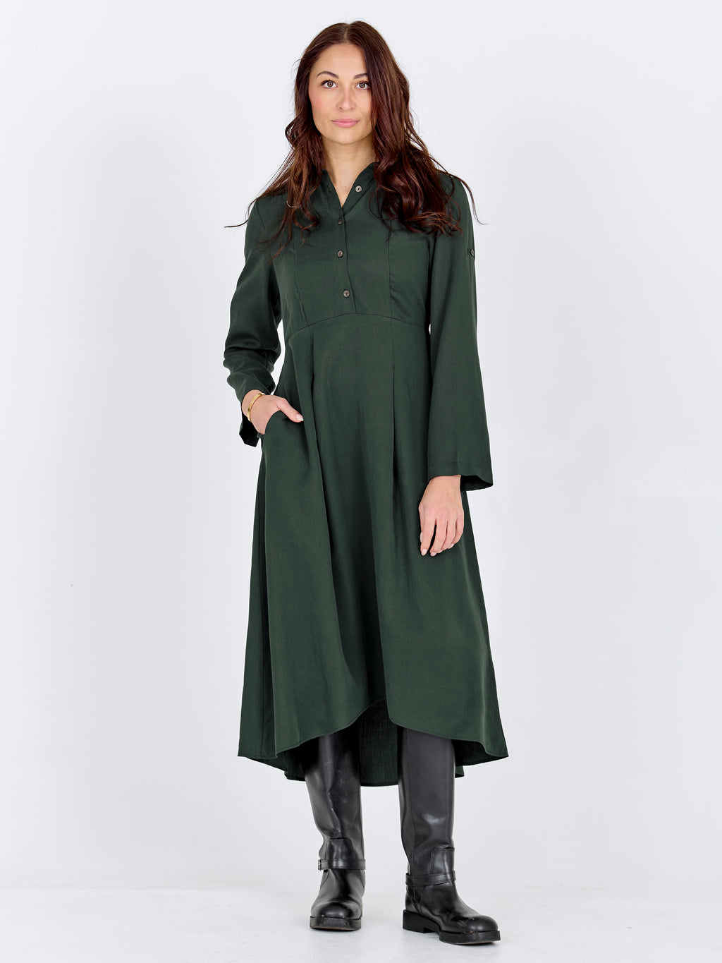 Deze jurk heeft een eenvoudige en tijdloze uitstraling met zijn overhemdkraag, knoopsluiting en strakke lijnen. Aan de voorkant heeft het mooie plooien die zorgen voor een lichte val in de rok, terwijl de elastiek aan de achterkant zorgt voor een comfortabele en goed passende pasvorm. De lange mouwen maken het ontwerp compleet en maken de jurk ideaal voor zowel alledaags gebruik als meer formele gelegenheden. Style het met laarzen voor een moderne look of met platte schoenen voor een meer ontspannen uitstraling.