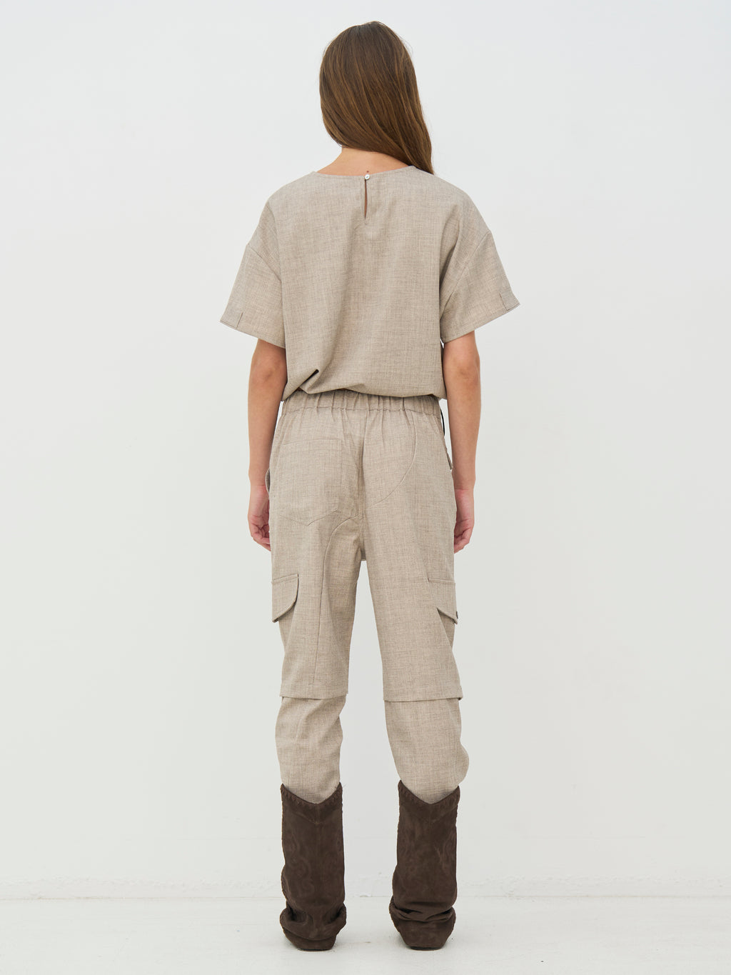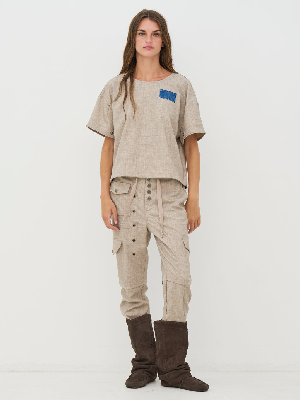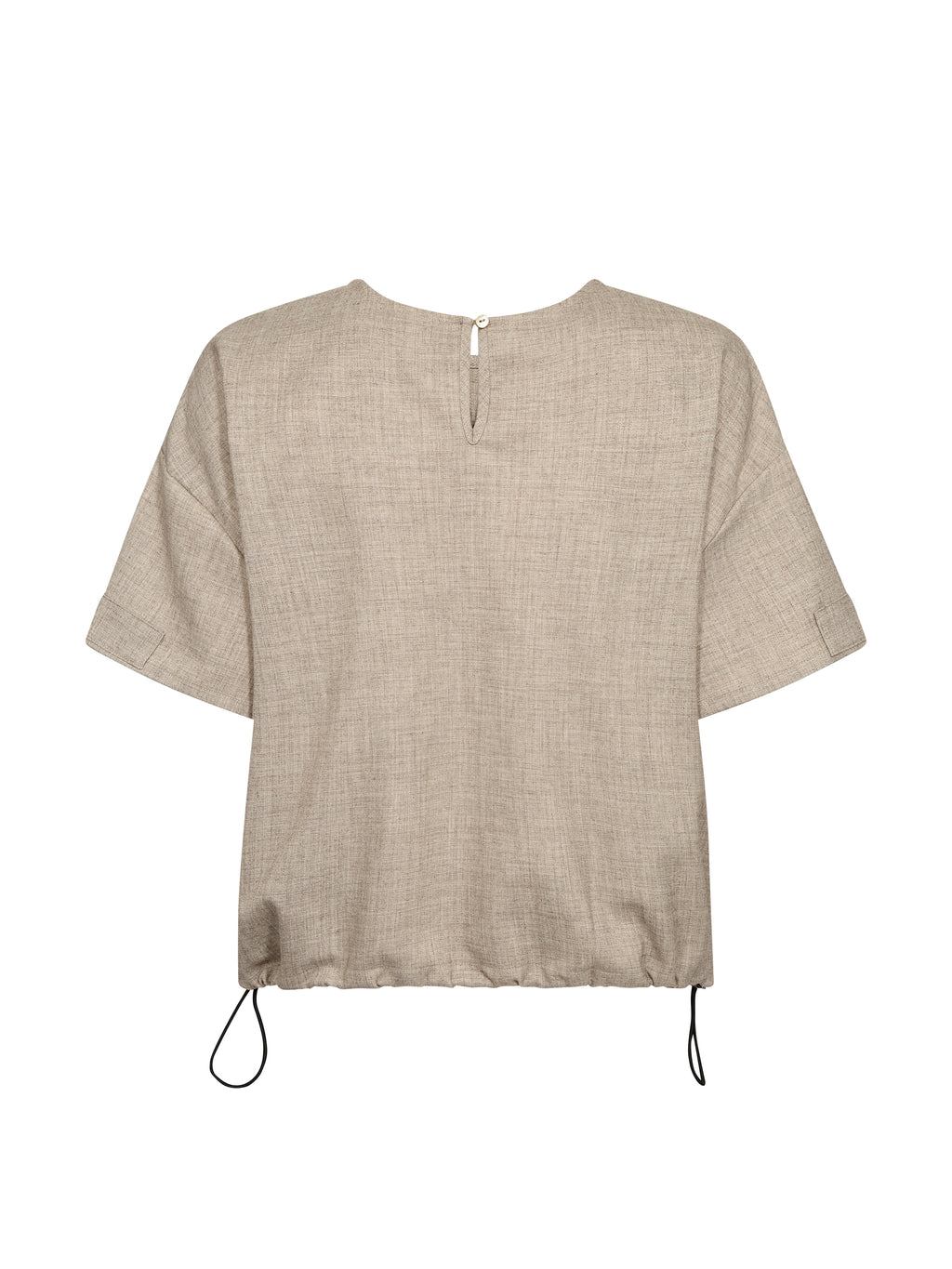 Deze top heeft een eenvoudig en modern ontwerp met korte mouwen en een relaxte pasvorm. Aan de voorkant wordt het geheel benadrukt door een klein contrastdetail dat voor een twist zorgt. De mouwen hebben knoopdetails en onderaan kan de pasvorm worden aangepast met de kleine touwtjes, zodat de blouse zowel los of iets strakker gedragen kan worden. Aan de achterkant sluit hij met een kleine knoop in de nek. Stijl hem met de bijpassende broek voor een complete set of met jeans voor een coole alledaagse look.