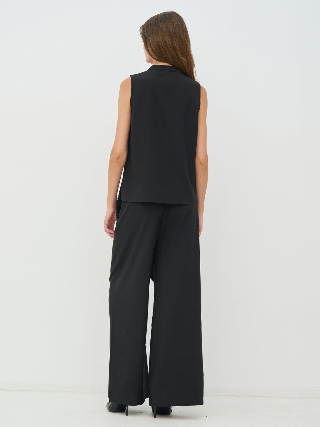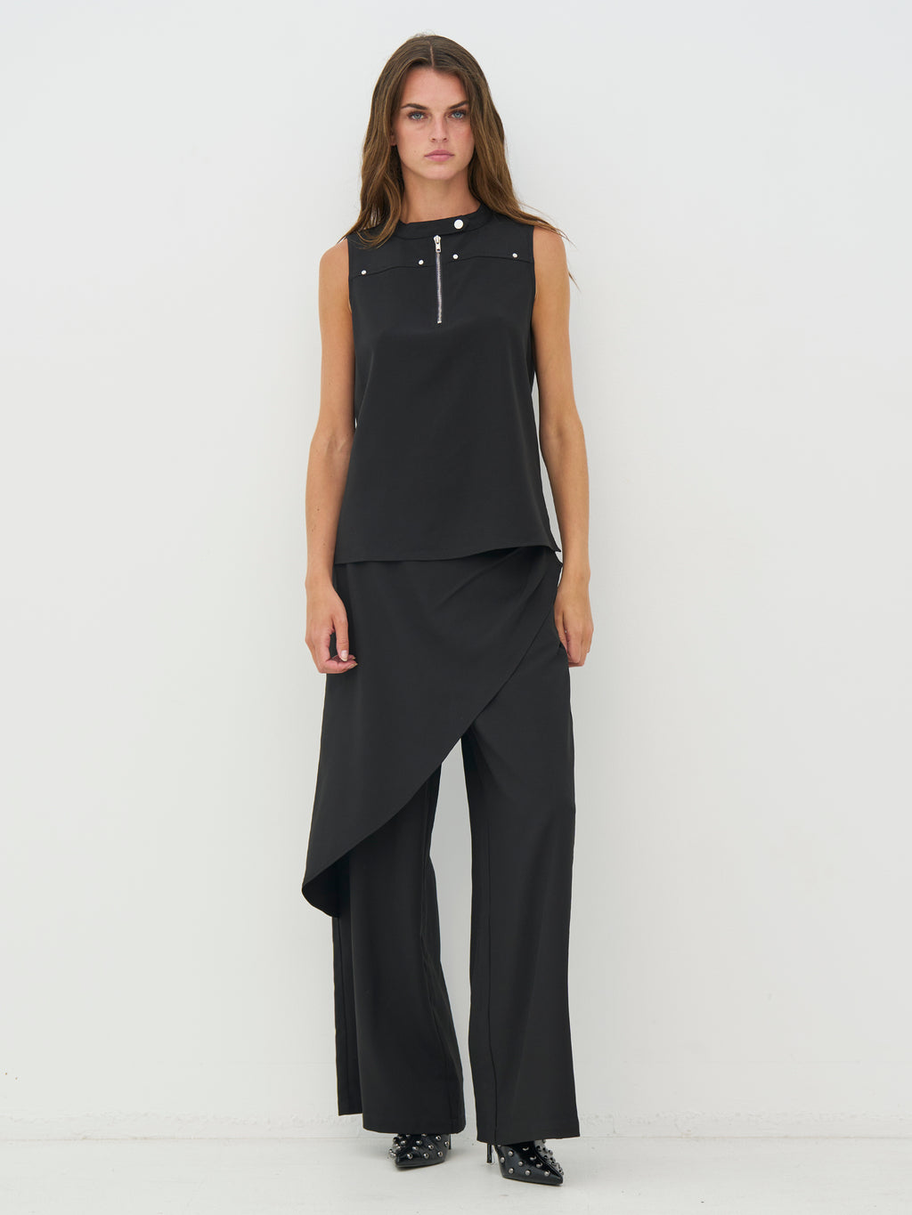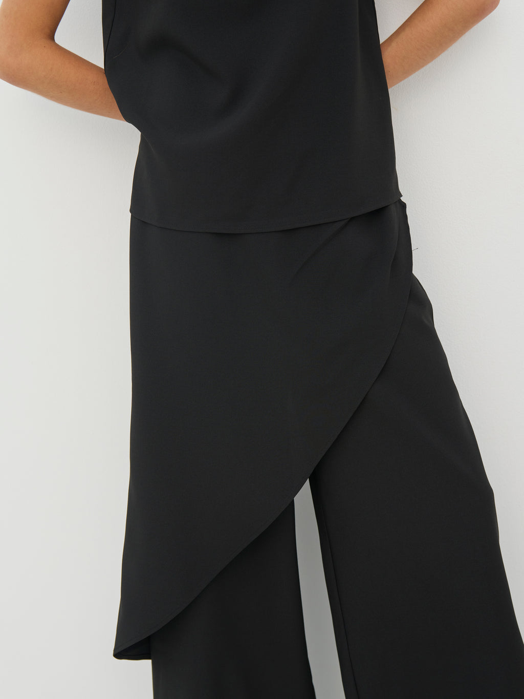 Deze broek combineert een klassiek, wijdbeens ontwerp met een elegant detail aan de voorkant van de rok, waardoor een unieke en vloeiende uitstraling ontstaat. Het voorpand creëert de illusie van een asymmetrische rok, terwijl de achterkant eruitziet als een traditionele broek met strakke lijnen. De pasvorm is relaxed en comfortabel, waardoor ze ideaal zijn voor zowel dagelijks gebruik als voor meer formele gelegenheden. Combineer ze met een simpele top voor een minimalistische look of met het bijpassende bovenstuk voor een complete set.