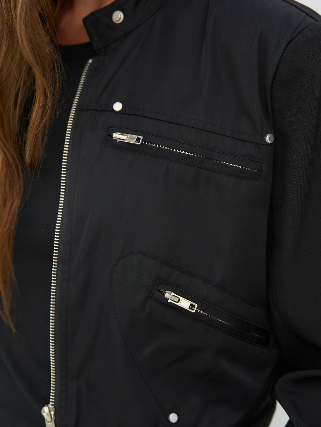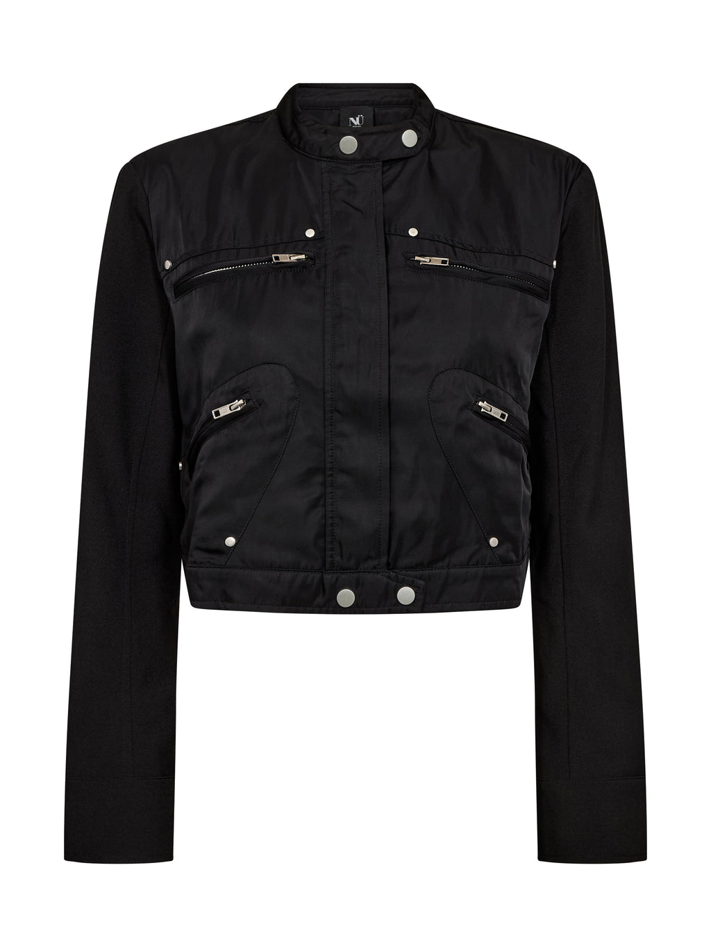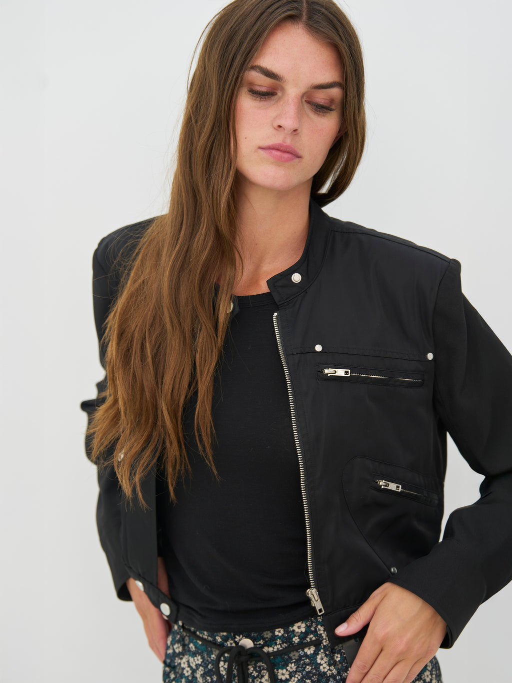 Deze jas heeft een moderne, coole uitstraling met zijn korte lengte en de combinatie van matte en glanzende materialen. Aan de voorkant heeft het meerdere ritsen en drukknopen die zowel functie als karakter toevoegen aan het ontwerp. De hoge kraag met drukknoop geeft een scherpe uitstraling, terwijl de lange mouwen de look op een klassieke manier afronden. Aan de achterkant blijft de jas eenvoudig met strakke lijnen. Style het over een top, jurk of lichte trui voor een stijlvolle alledaagse look met een twist.