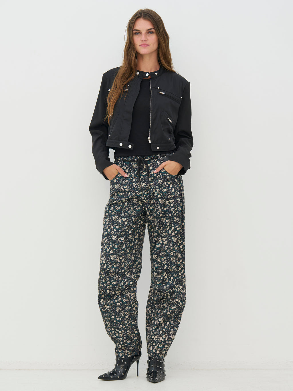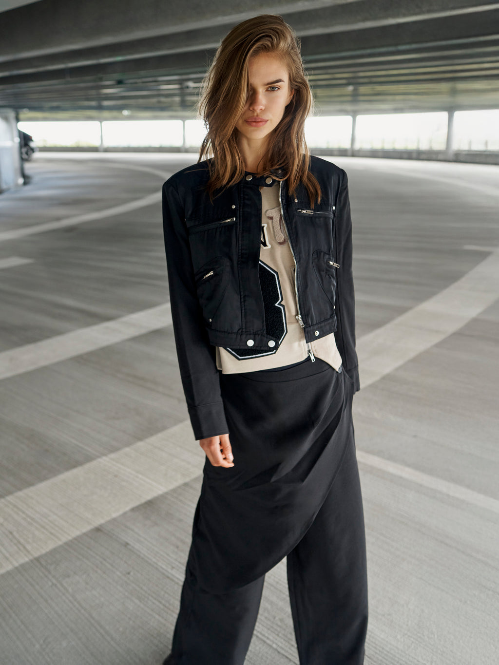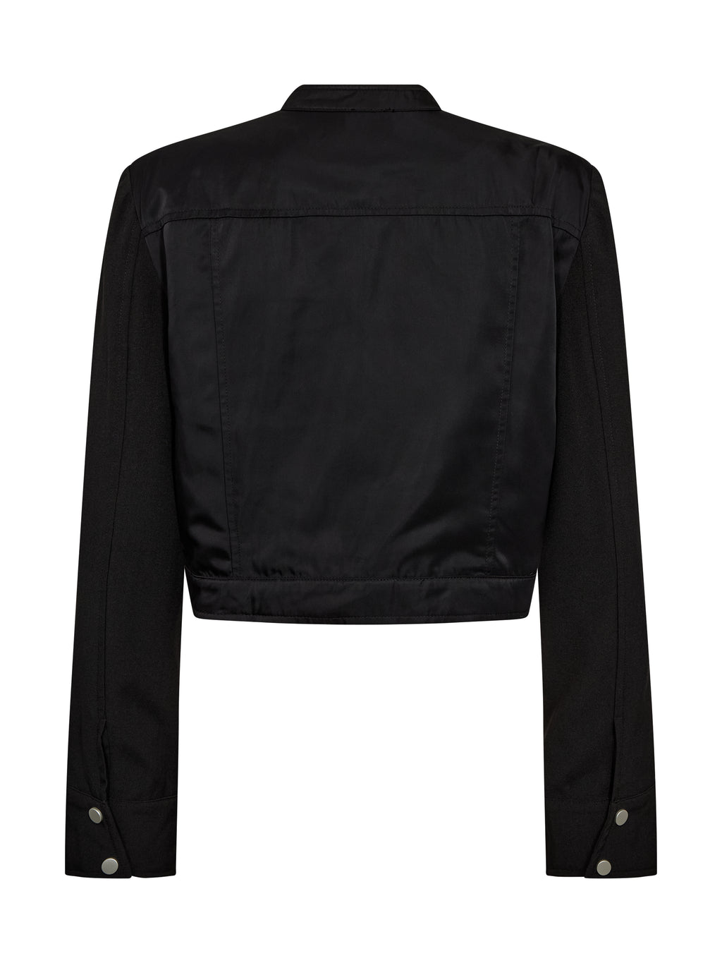 Deze jas heeft een moderne, coole uitstraling met zijn korte lengte en de combinatie van matte en glanzende materialen. Aan de voorkant heeft het meerdere ritsen en drukknopen die zowel functie als karakter toevoegen aan het ontwerp. De hoge kraag met drukknoop geeft een scherpe uitstraling, terwijl de lange mouwen de look op een klassieke manier afronden. Aan de achterkant blijft de jas eenvoudig met strakke lijnen. Style het over een top, jurk of lichte trui voor een stijlvolle alledaagse look met een twist.