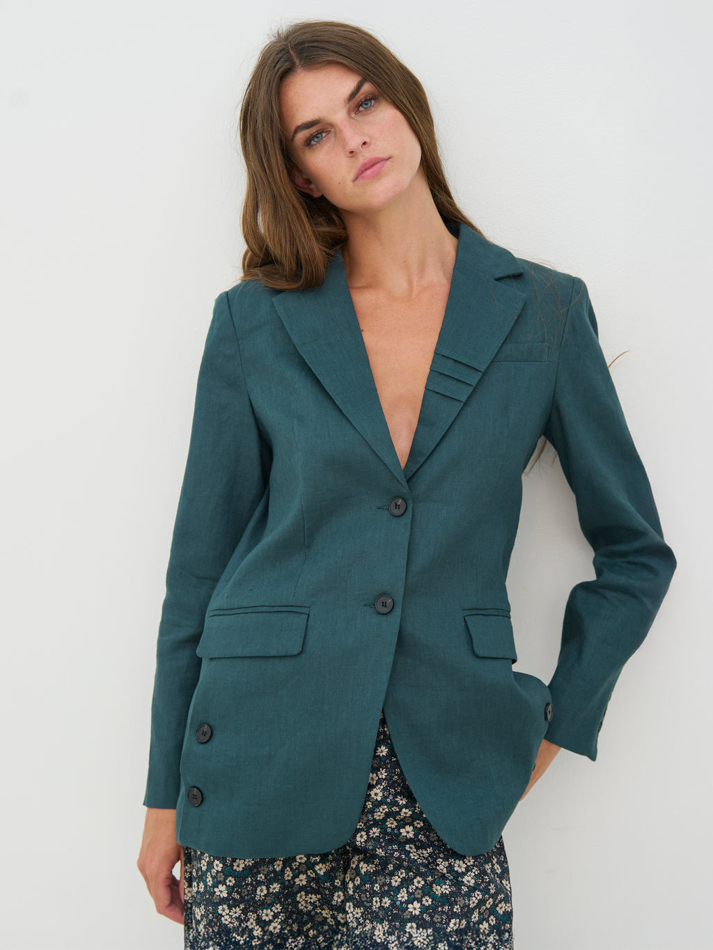 Deze blazer heeft een klassieke en nette uitstraling met een licht vrouwelijke snit. Het is ontworpen met reverskraag en knoopsluiting aan de voorkant, wat een tijdloze uitstraling geeft, terwijl de subtiele details bij de kraag wat extra karakter toevoegen. Aan de voorkant heeft de blazer klepzakken, en aan de achterkant is de uitstraling eenvoudig en schoon, zodat de silhouet mooi uitkomt. De pasvorm maakt het gemakkelijk om hem zowel gesloten als open te dragen.