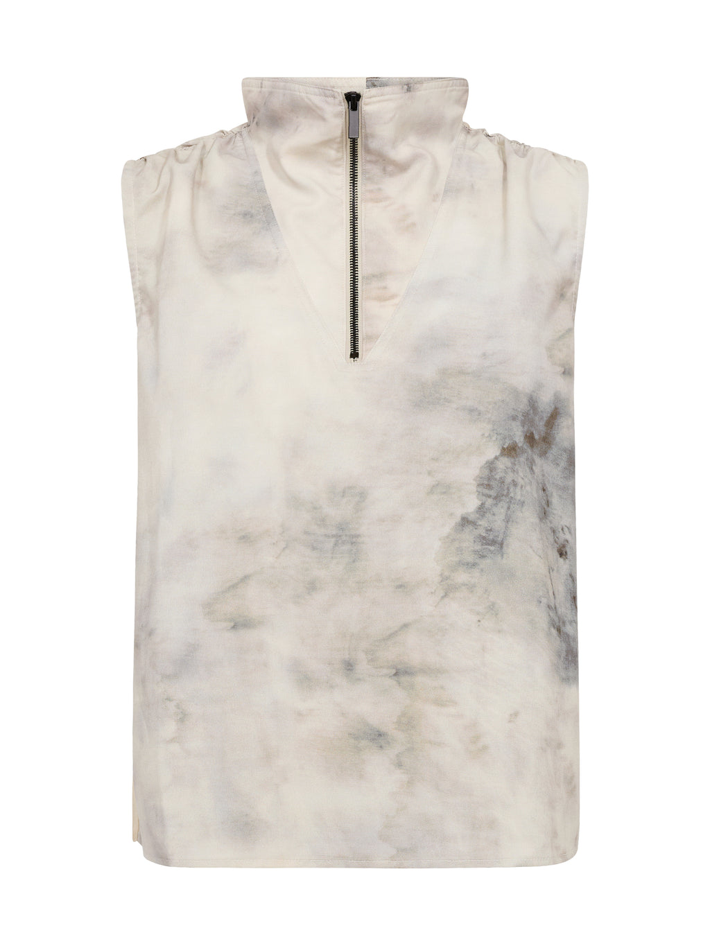 Deze top heeft een relaxte en moderne uitstraling met een rechte pasvorm en een hoge kraag die aan de voorkant wordt gesloten met een korte rits. De voorkant is rustig gehouden, terwijl de snit bij de hals een mooie V-vorm creëert die subtiel stoerheid toevoegt. De stof valt zacht en maakt de top comfortabel om te dragen, en de achterkant is eenvoudig en zonder details. Draag hem samen met de bijpassende broek voor een complete set, of style hem met jeans of shorts voor een relaxte alledaagse look.