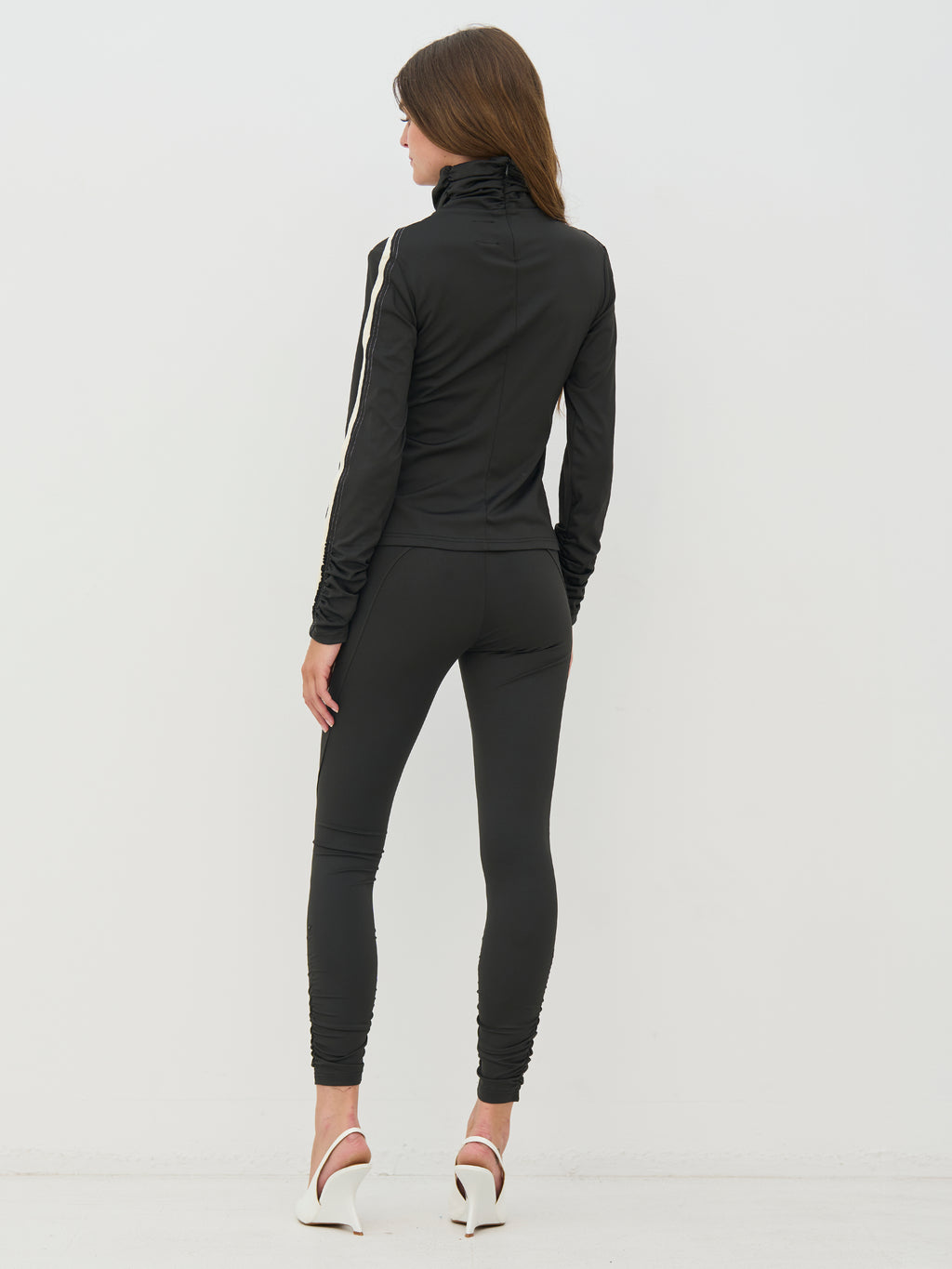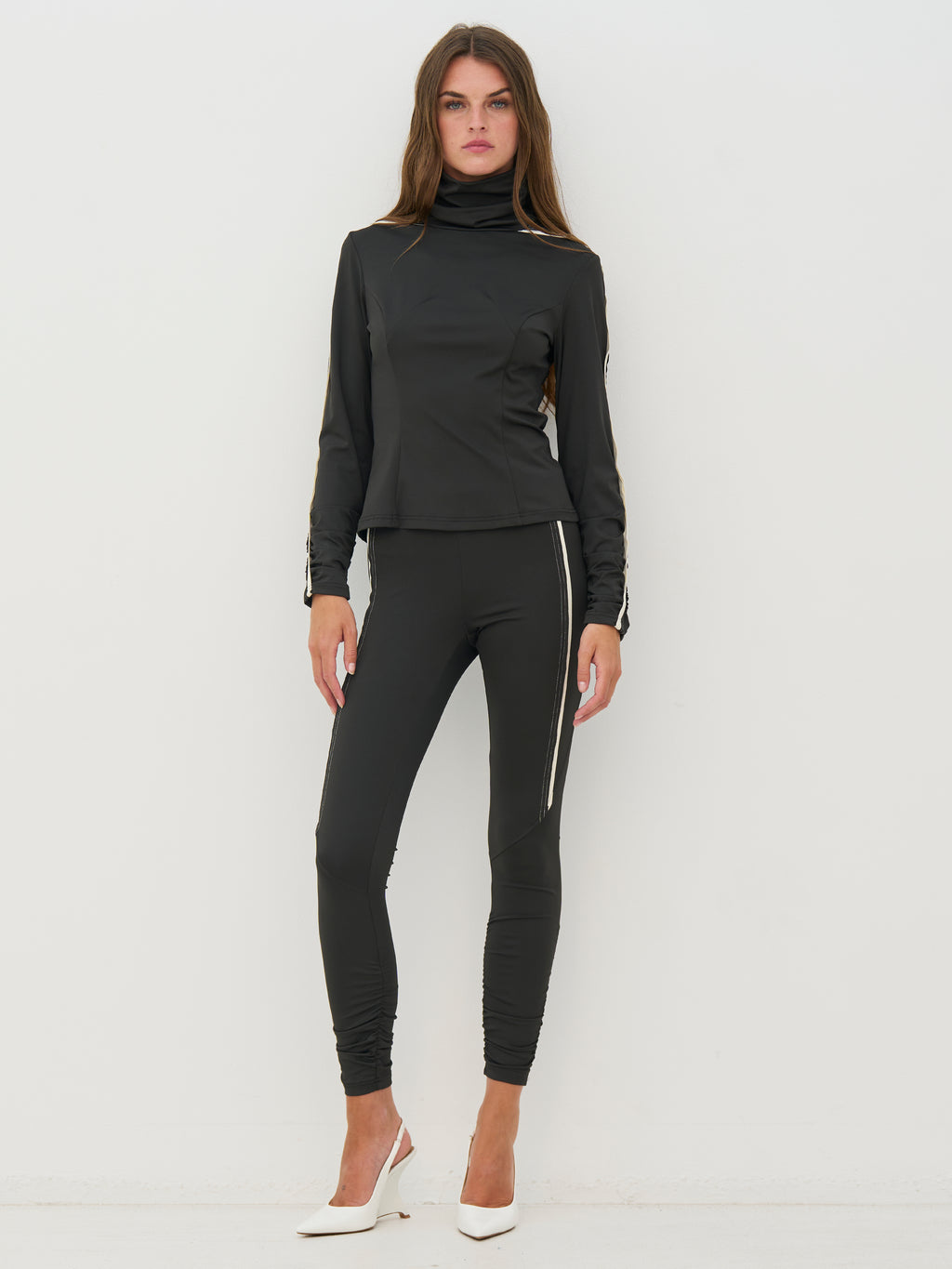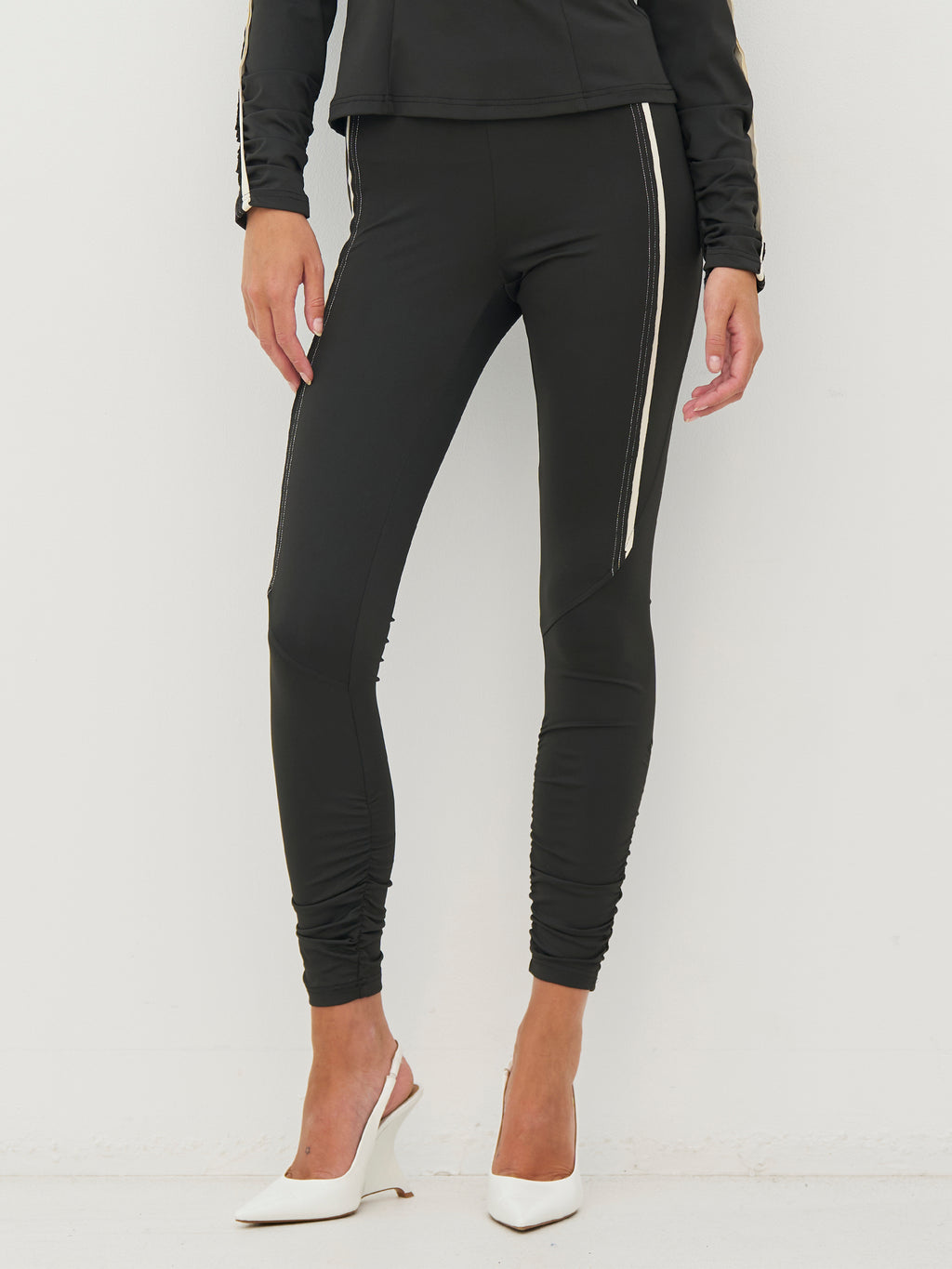 De leggings hebben een eenvoudig en nauwsluitend ontwerp met strakke lijnen en een comfortabele pasvorm. Langs de zijkanten is een subtiele detail te vinden, die een moderne uitstraling geeft, terwijl de benen worden afgerond met lichte ruches bij de enkels. De achterkant is glad en heel eenvoudig gehouden. Style de leggings met een lange blouse, een zachte trui of het bijpassende bovenstuk voor een samenhangende en goed afgestemde look.