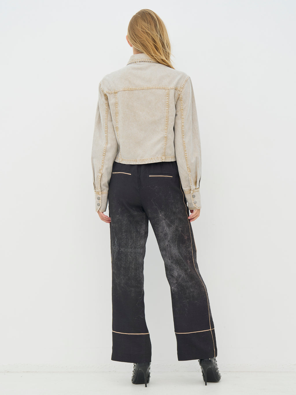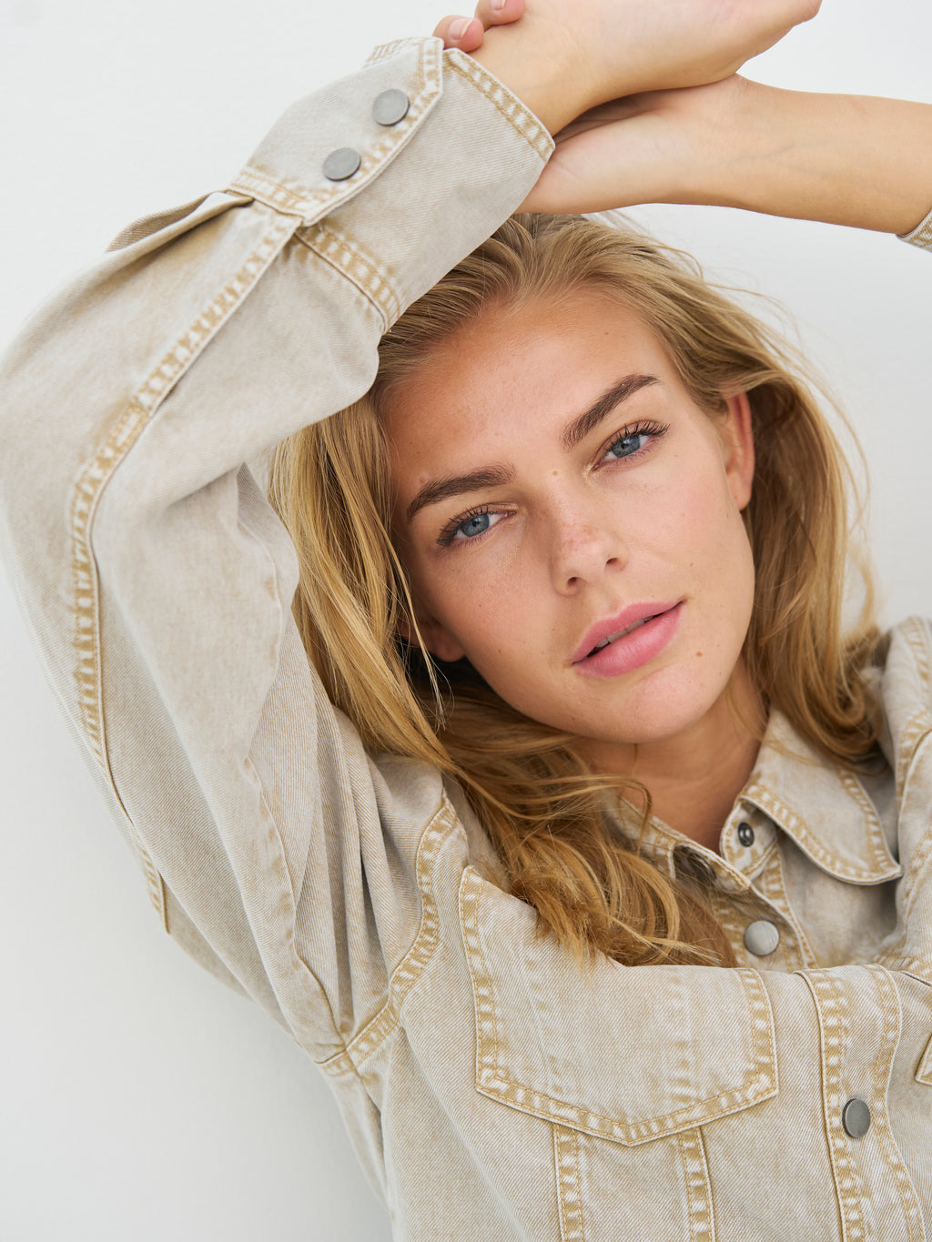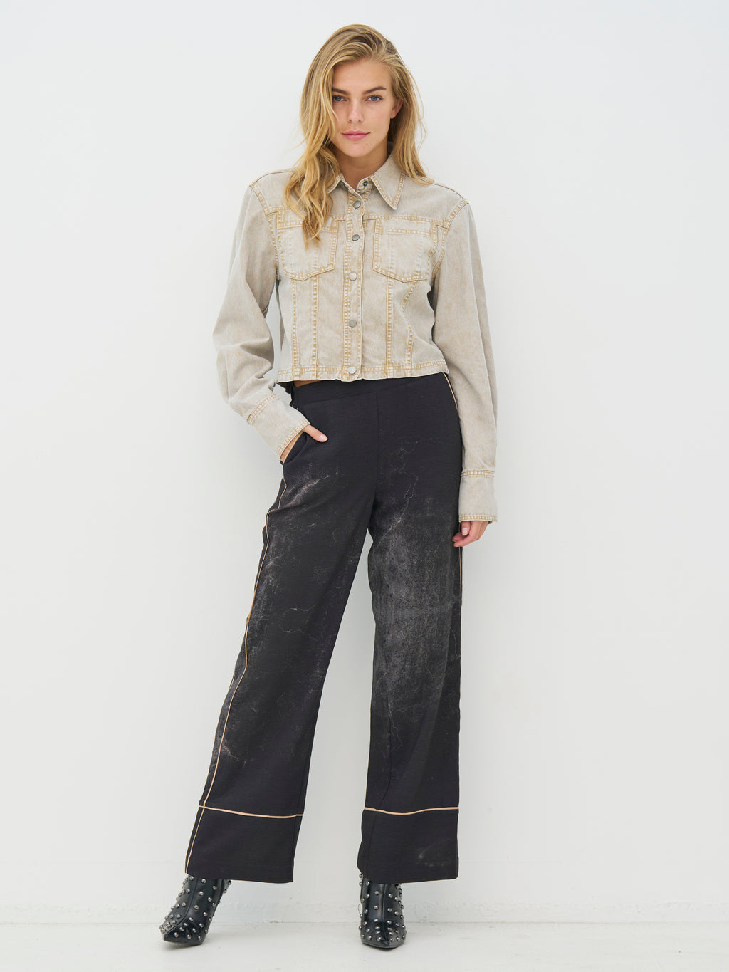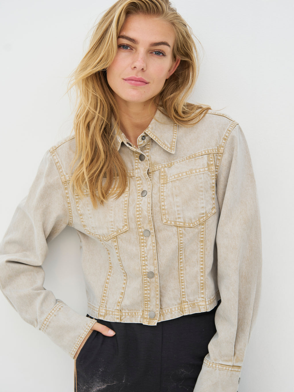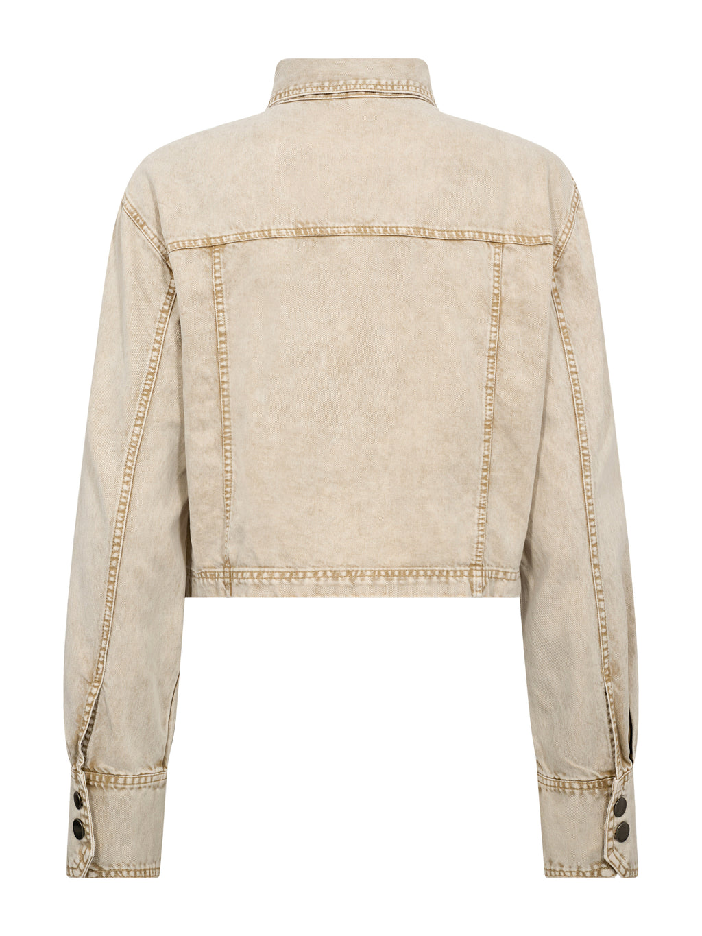 Deze korte spijkerjas heeft een ruwe en tijdloze uitstraling met een klassieke kraag en knoopsluiting aan de voorkant. De zichtbare stiksels en borstzakken geven de jas een duidelijke denimlook, terwijl de korte lengte zorgt voor een scherpere silhouet. De mouwen zijn lang met manchetten, en aan de achterkant is het ontwerp eenvoudig en schoon. De jas is gemakkelijk te stylen zowel dicht als open – draag hem over een jurk, met een hoge taillebroek of als een extra laag voor elke dag.