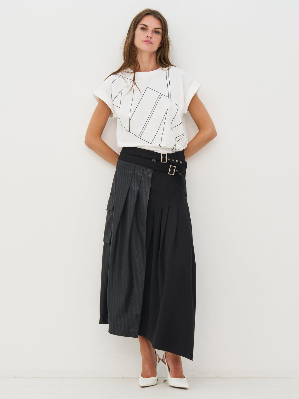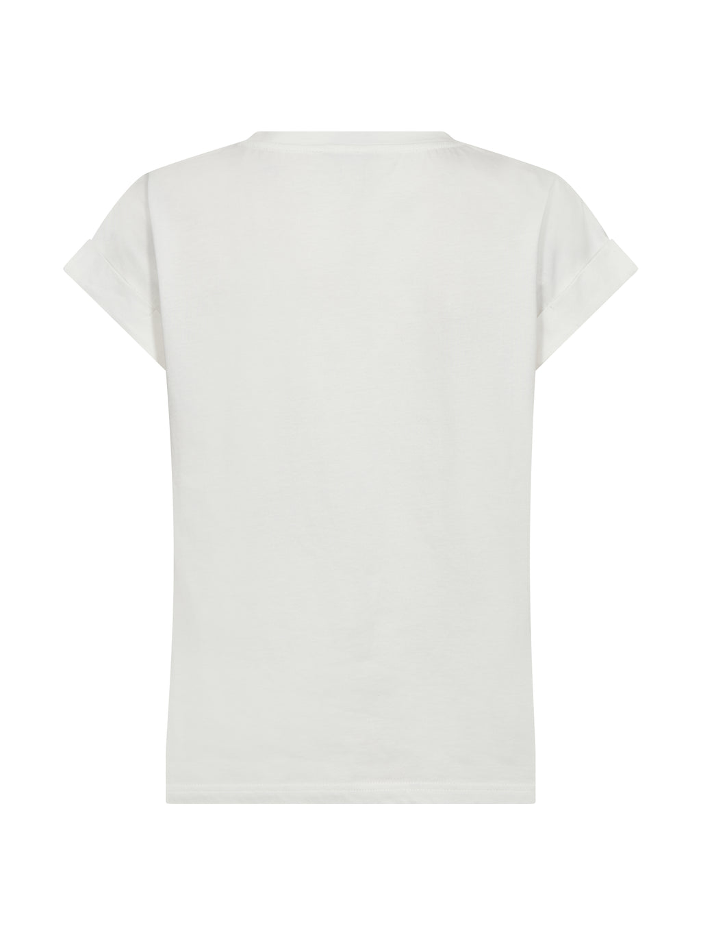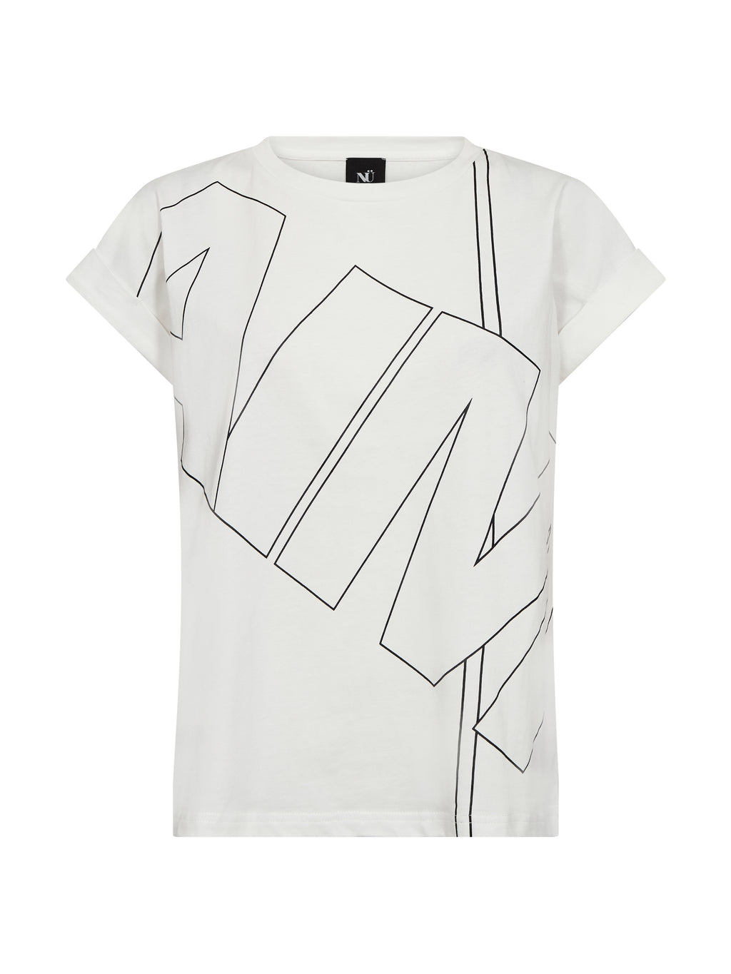 Dit T-shirt heeft een eenvoudige en stoere uitstraling met een ronde hals en korte mouwen met lichte omslag. De witte print aan de voorkant geeft een duidelijke visuele uitdrukking, terwijl de achterkant heel eenvoudig en kalm is. De pasvorm is recht en comfortabel, waardoor de T-shirt gemakkelijk dagelijks te dragen is. Draag het met broek of rok voor een ontspannen look, of style het onder een blazer voor een meer samengestelde uitstraling.