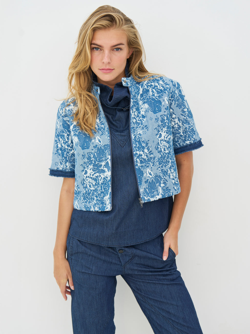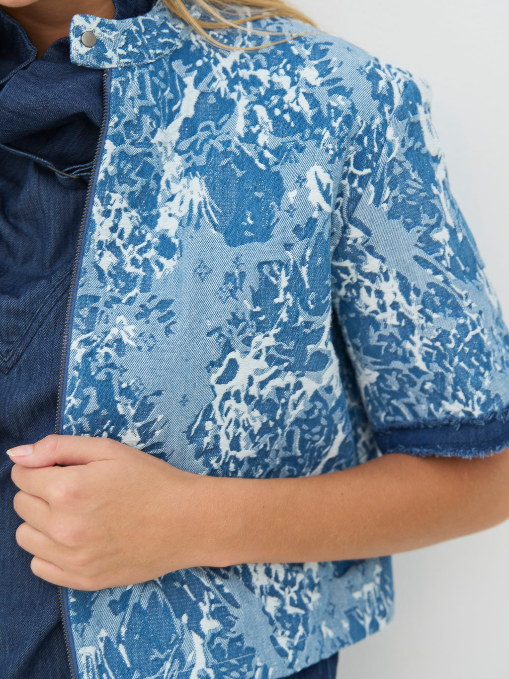 Deze jas heeft een korte en moderne snit met korte mouwen en een doorlopende rits aan de voorkant. Het print geeft de jas een statement uitdrukking, terwijl de ruwe afwerking bij de mouwen een edgy touch toevoegt. Aan de voorkant is het ontwerp eenvoudig en gemakkelijk te stylen. De jas werkt goed als een lichte laag en is makkelijk te combineren met zowel jeans, broeken of over een jurk voor dagelijks gebruik.