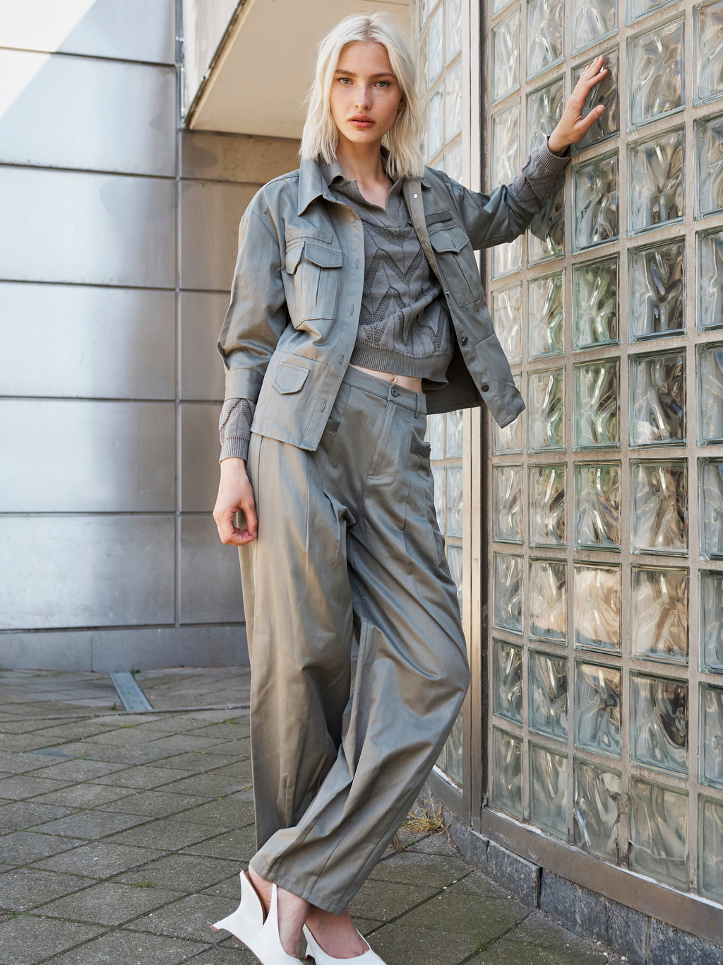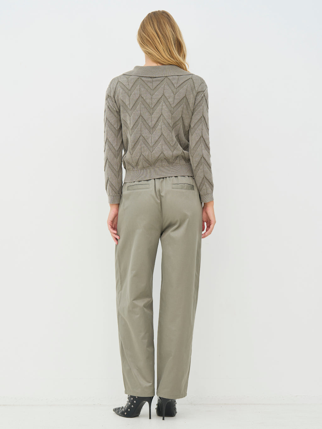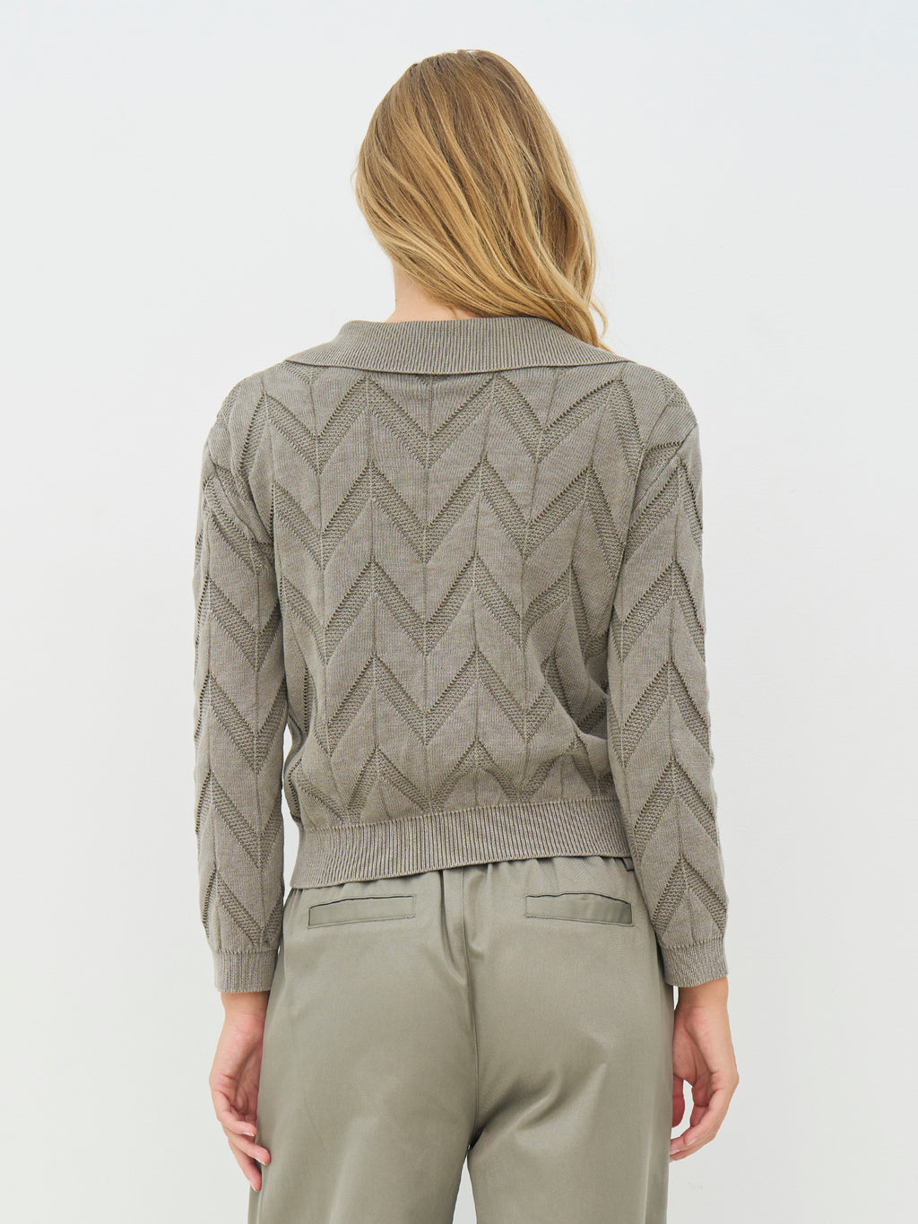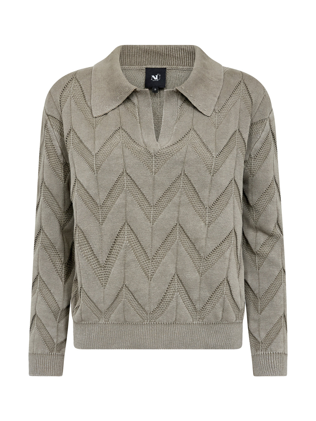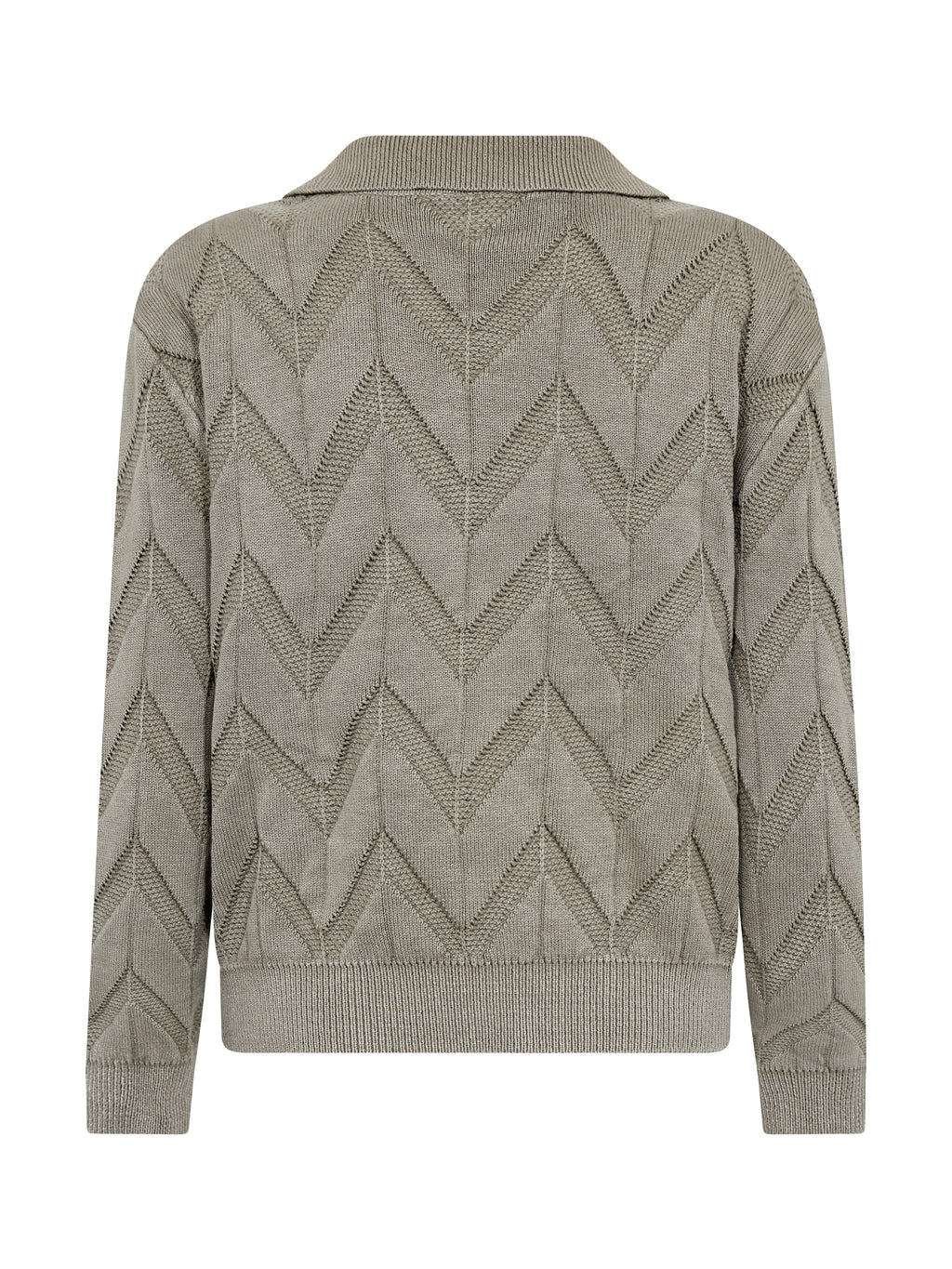 Deze gebreide trui heeft een ontspannen en vrouwelijke uitstraling met lange mouwen en een polokraag, die een lichte twist geeft aan de klassieke snit. De voorkant heeft een korte V-halsuitsnijding, terwijl het doorlopende zigzagpatroon structuur en levendigheid toevoegt aan het ontwerp. De achterkant volgt hetzelfde patroon. Style de trui met een klassieke broek of een rok voor een alledaagse look die zowel gekleed als ontspannen aanvoelt.