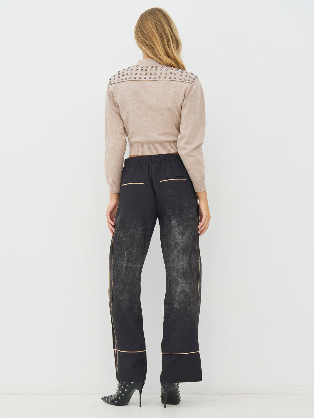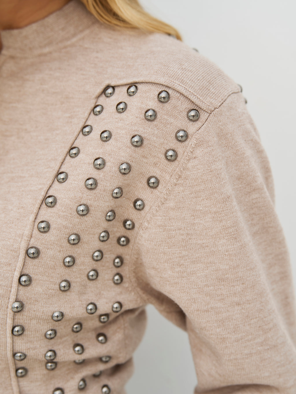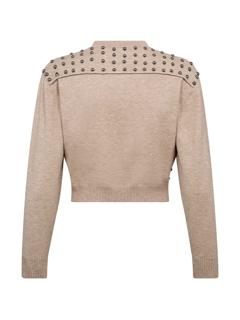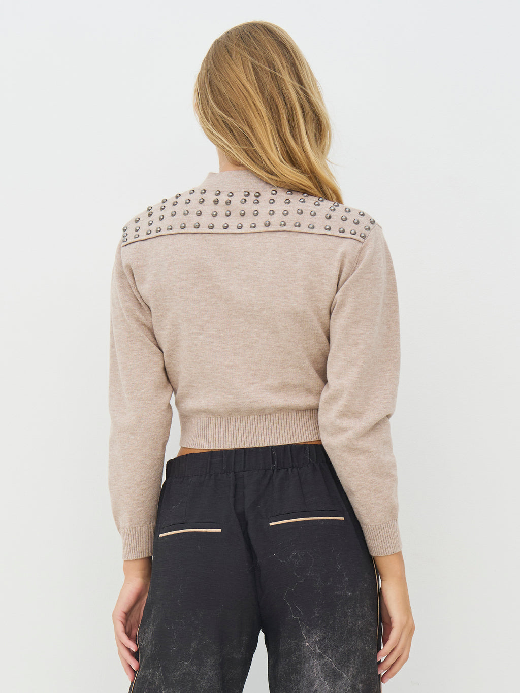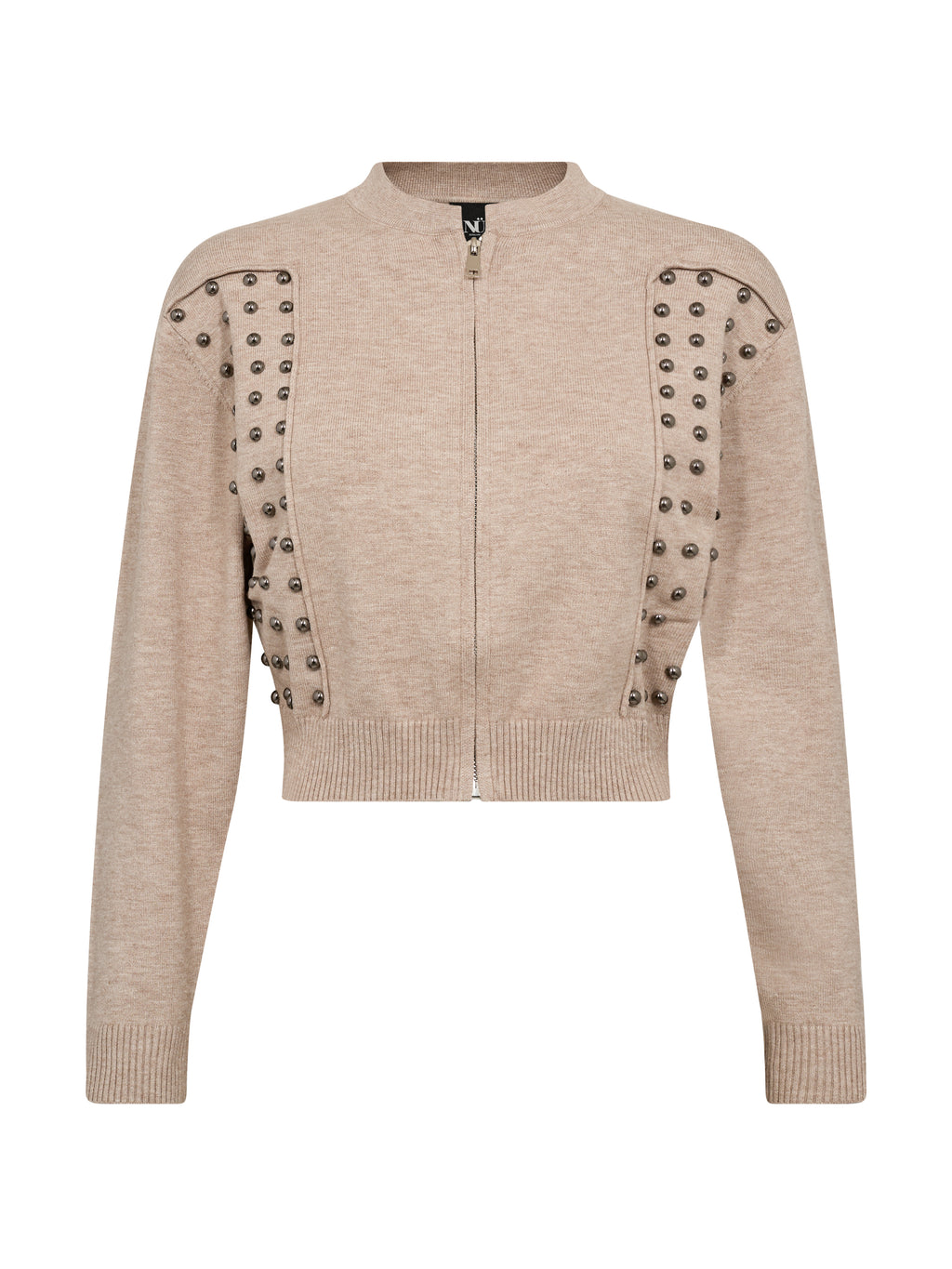 Deze cardigan heeft een korte en aansluitende snit met lange mouwen en een ronde hals. Aan de voorkant sluit hij met een rits, terwijl decoratieve studs aan de zijkanten een opvallende uitstraling geven. De achterkant is ontworpen met studs over de schouders, wat extra karakter toevoegt en een prachtig geheel vormt. Style de cardigan over een eenvoudige top of jurk, of gebruik hem als een gelaagde look voor dagelijks gebruik.
