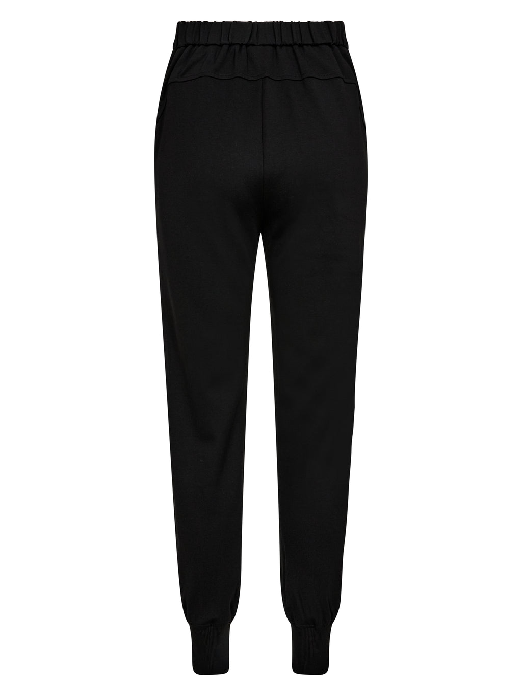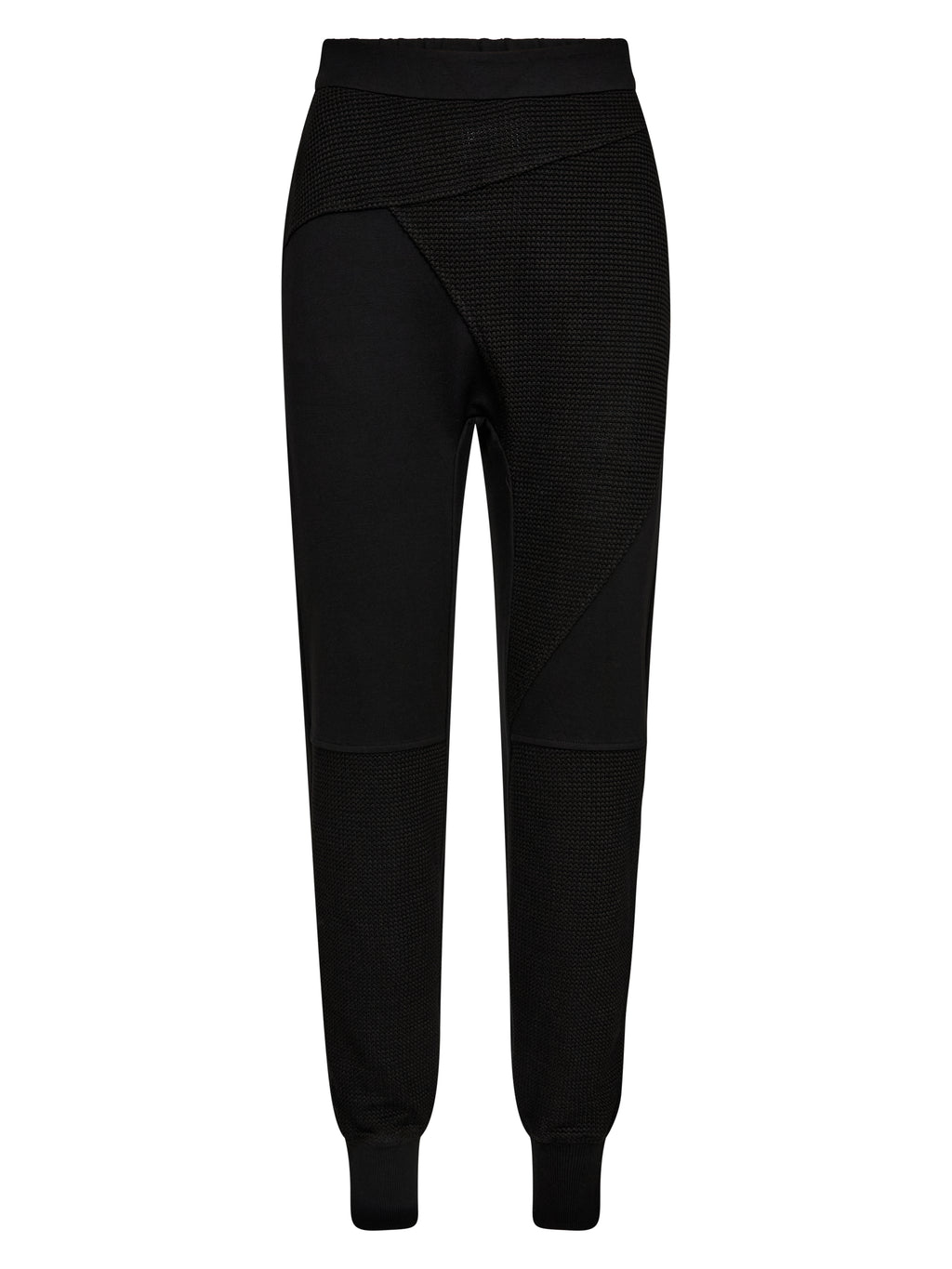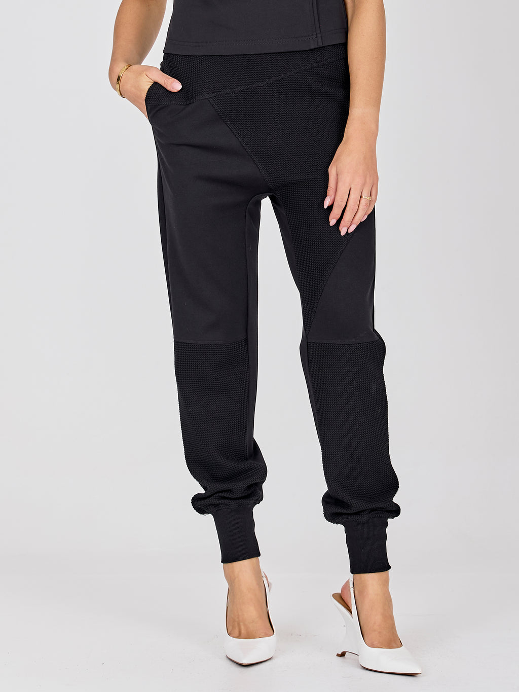 Deze broek heeft een relaxte, maar opvallende uitstraling met een smalle pasvorm die zachtjes bij de enkels samenkomt. De voorkant is verdeeld in contrasterende materialen en schuine lijnen, wat een ruwe en moderne uitstraling geeft, terwijl de zakken praktisch aan de zijkant zijn geplaatst. De achterkant is eenvoudiger met elastiek in de taille, waardoor het comfort de hele dag behouden blijft. De broek is geschikt voor zowel casual als meer ontspannen gelegenheden. Stijl het met een eenvoudige top of trui voor een coole en veelzijdige look.