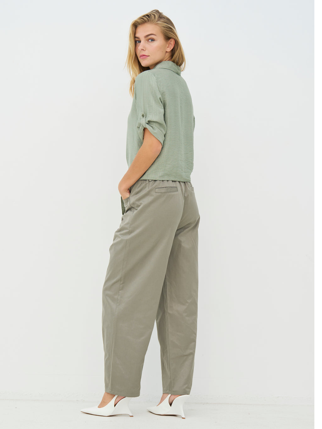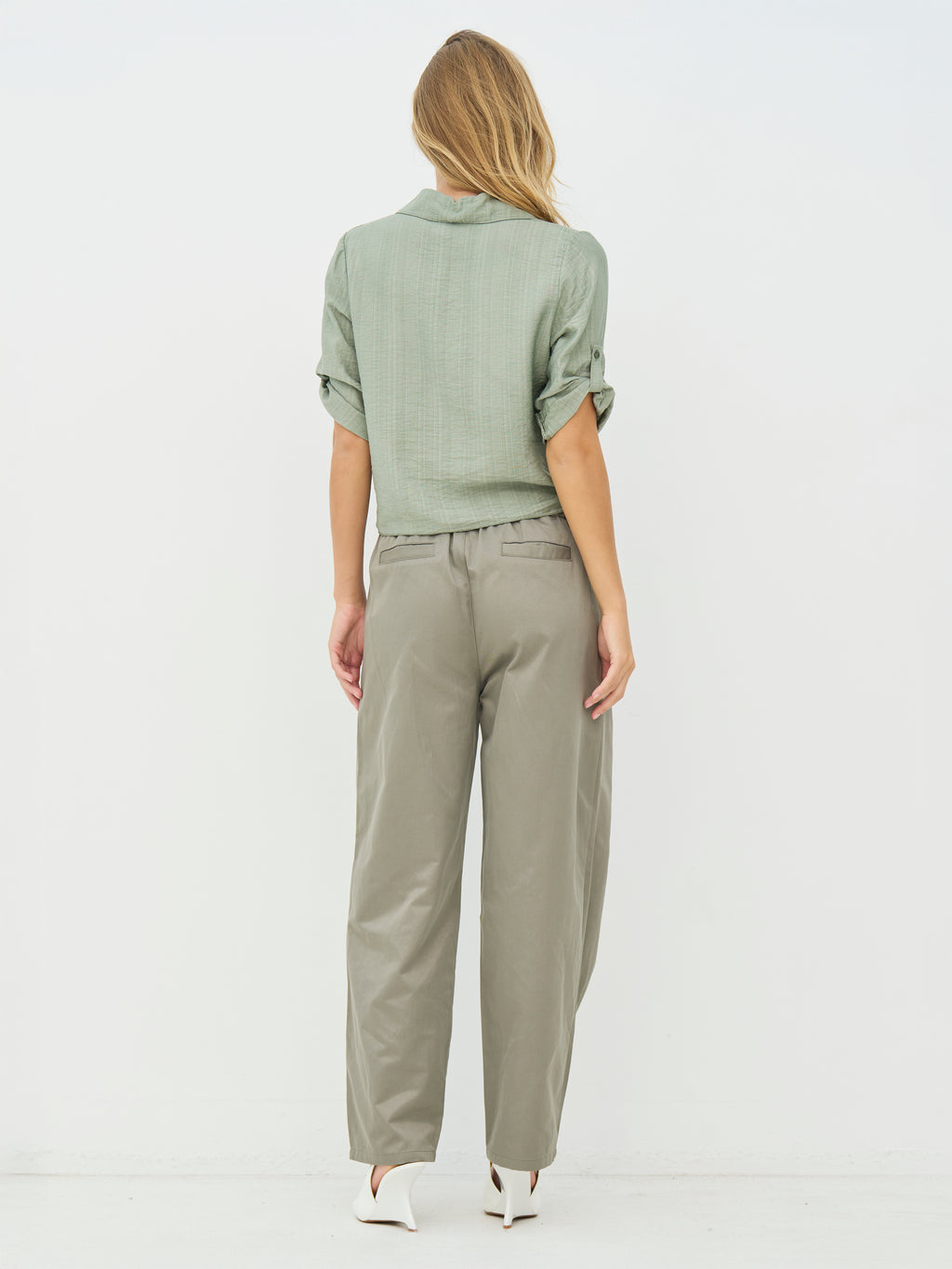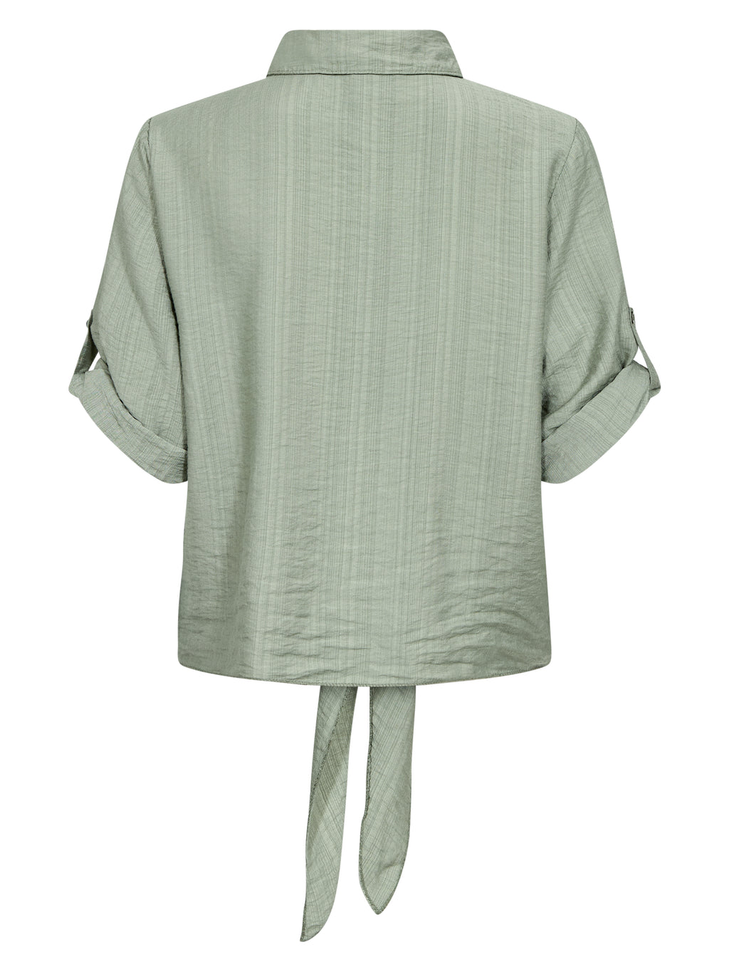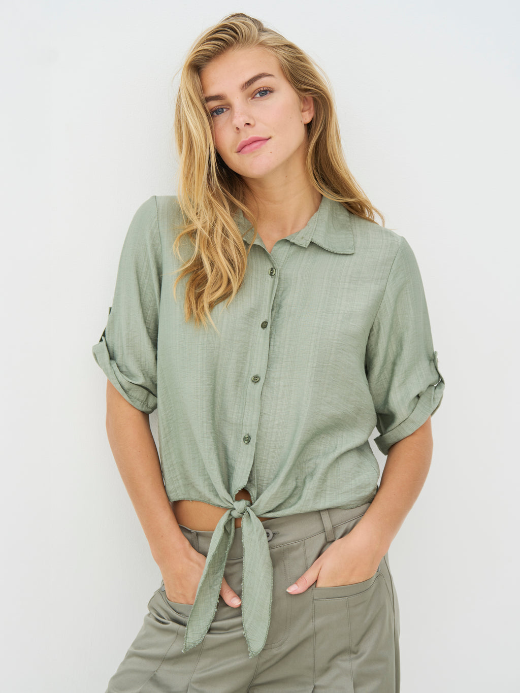 Dit shirt heeft een lichte en ontspannen uitstraling met korte mouwen die opgerold en vastgemaakt kunnen worden met een lus. Aan de voorkant sluit het met knopen en eindigt met een decoratief strikdetail voor een vrouwelijke touch. De achterkant is eenvoudig en recht gesneden. Combineer het shirt met losse broeken, een rok of shorts voor een relaxte alledaagse look, of draag het open over een simpele top op warme dagen.