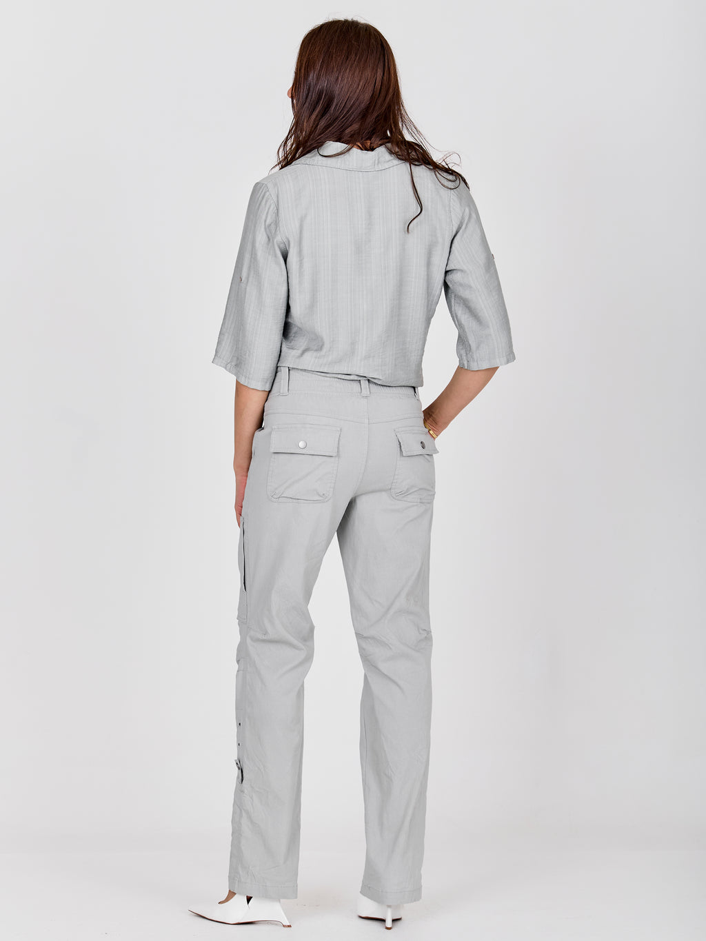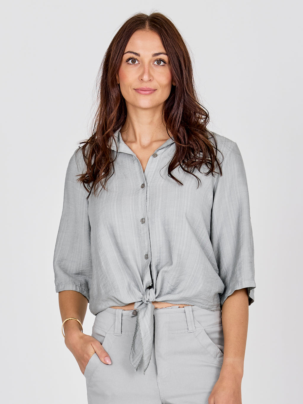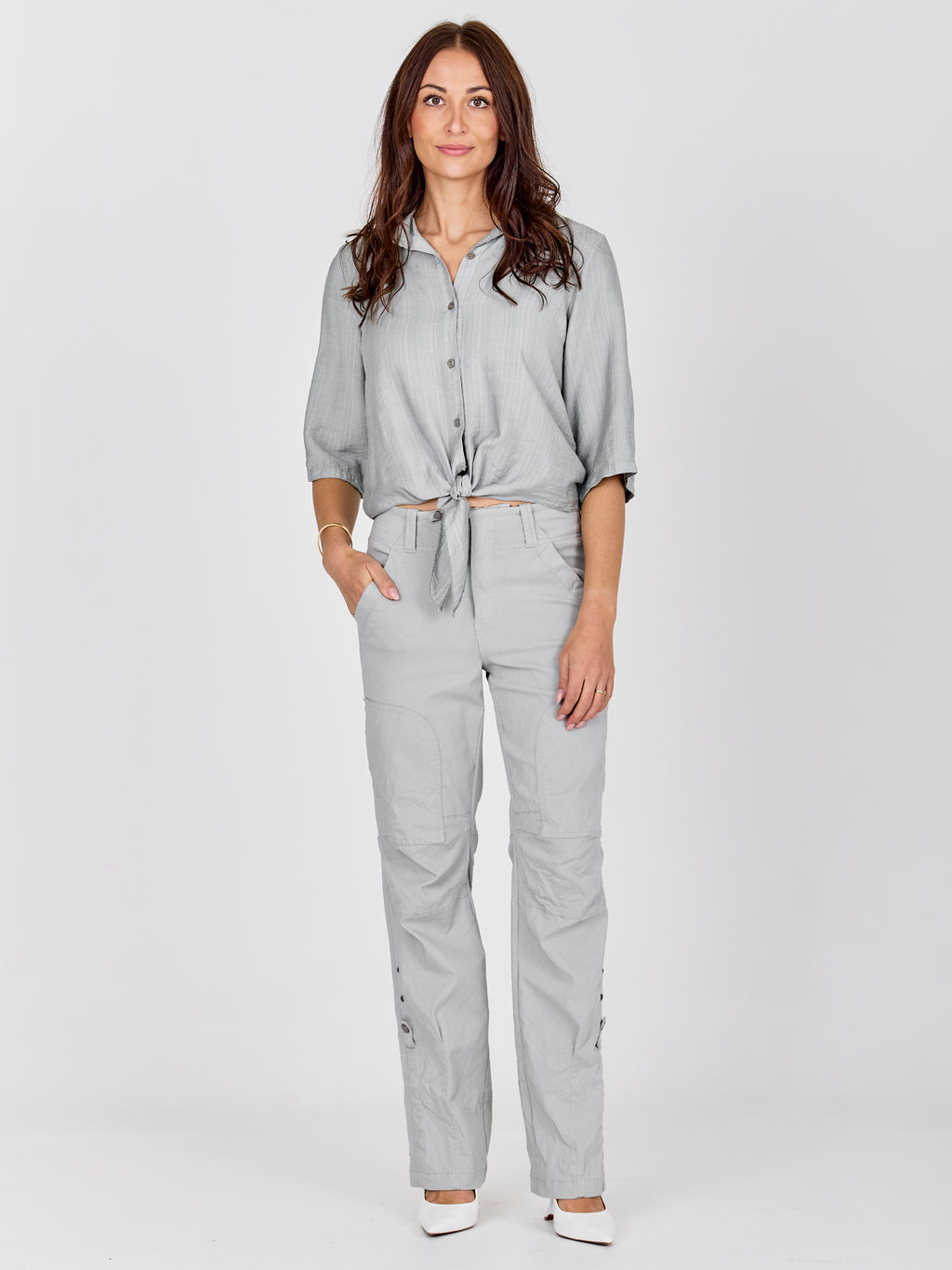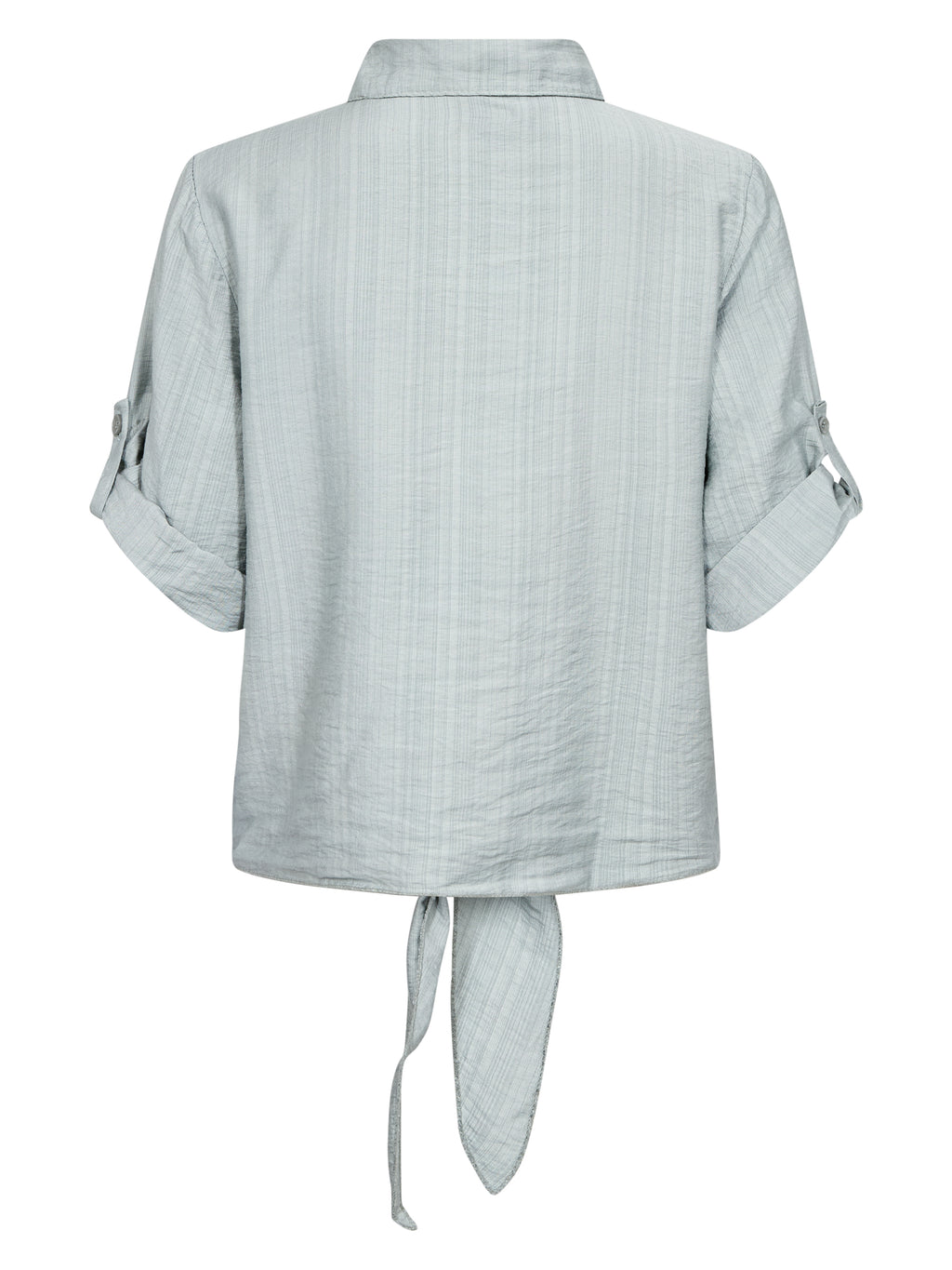 Dit shirt heeft een lichte en ontspannen uitstraling met korte mouwen die opgerold en vastgemaakt kunnen worden met een lus. Aan de voorkant sluit het met knopen en eindigt met een decoratief strikdetail voor een vrouwelijke touch. De achterkant is eenvoudig en recht gesneden. Combineer het shirt met losse broeken, een rok of shorts voor een relaxte alledaagse look, of draag het open over een simpele top op warme dagen.