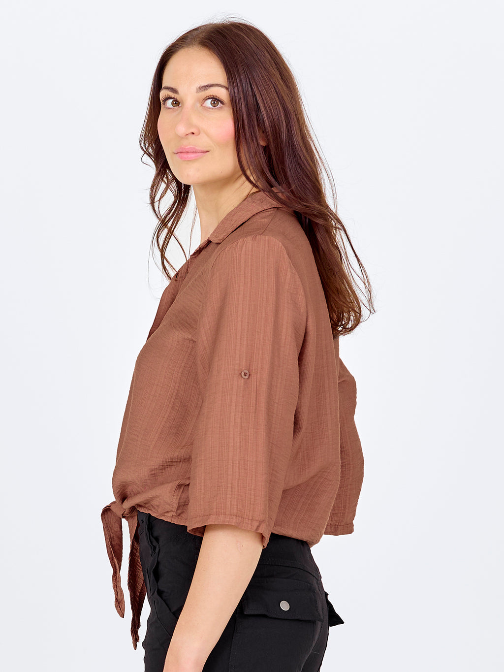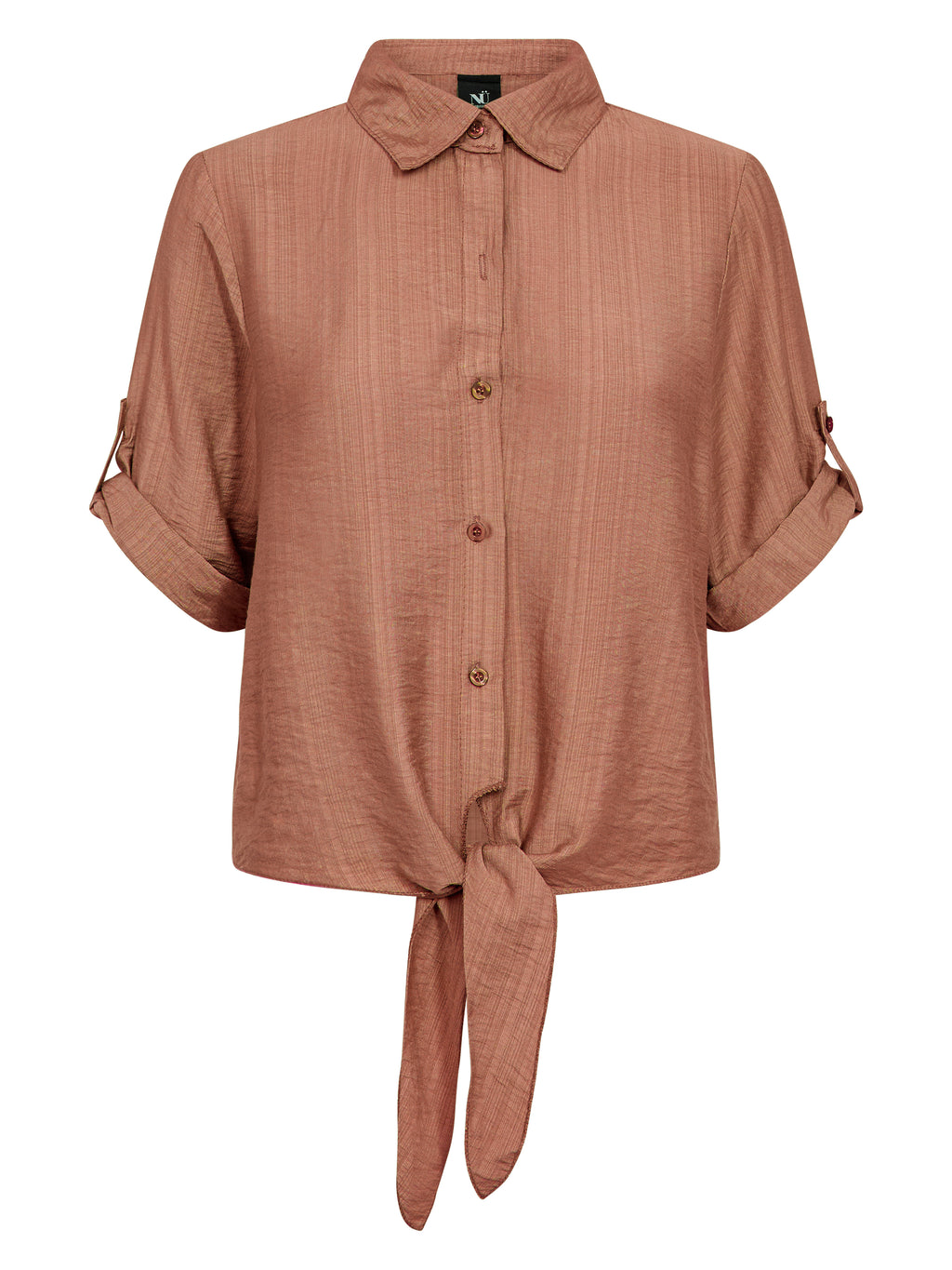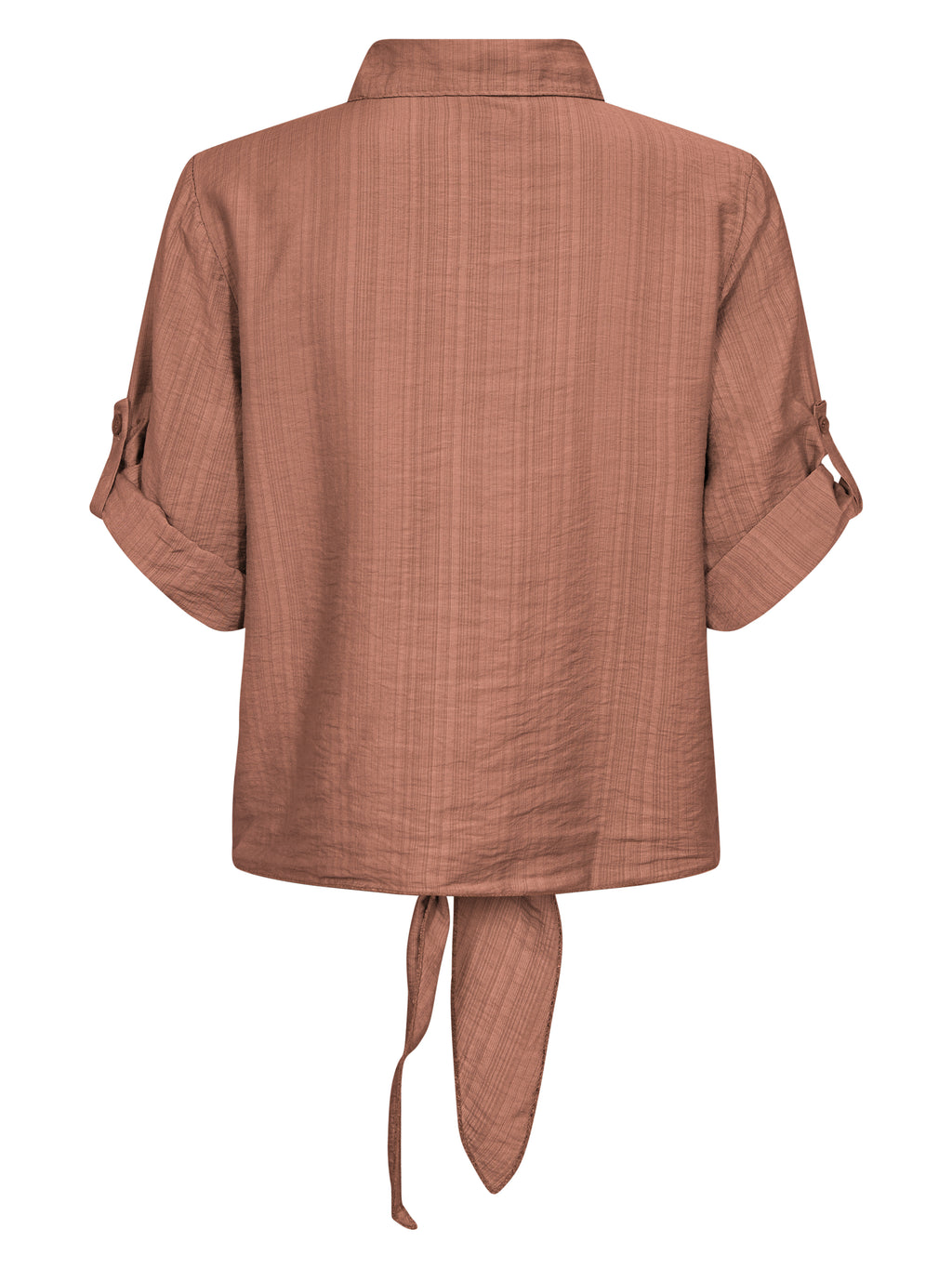 Dit shirt heeft een lichte en ontspannen uitstraling met korte mouwen die opgerold en vastgemaakt kunnen worden met een lus. Aan de voorkant sluit het met knopen en eindigt met een decoratief strikdetail voor een vrouwelijke touch. De achterkant is eenvoudig en recht gesneden. Combineer het shirt met losse broeken, een rok of shorts voor een relaxte alledaagse look, of draag het open over een simpele top op warme dagen.