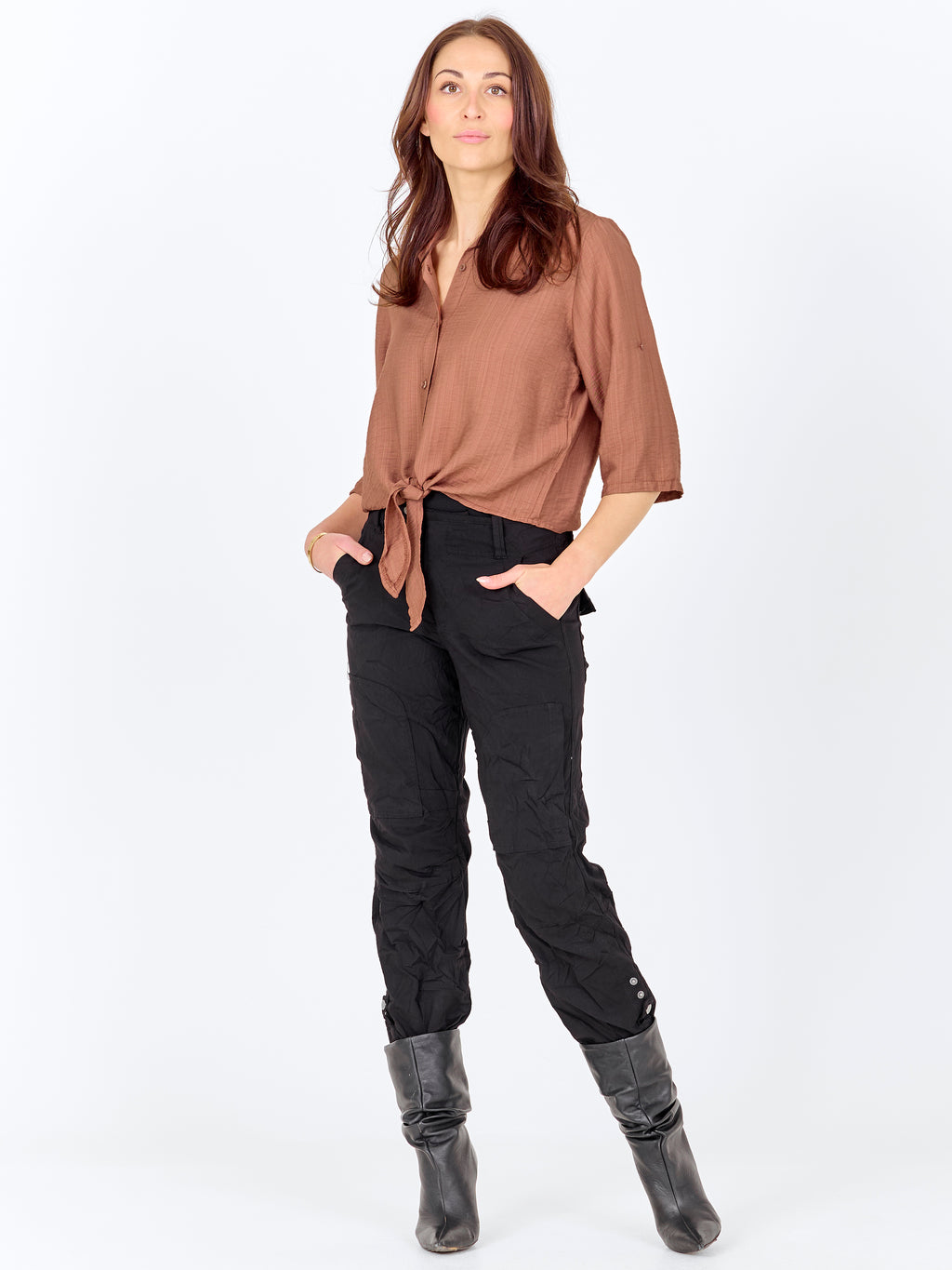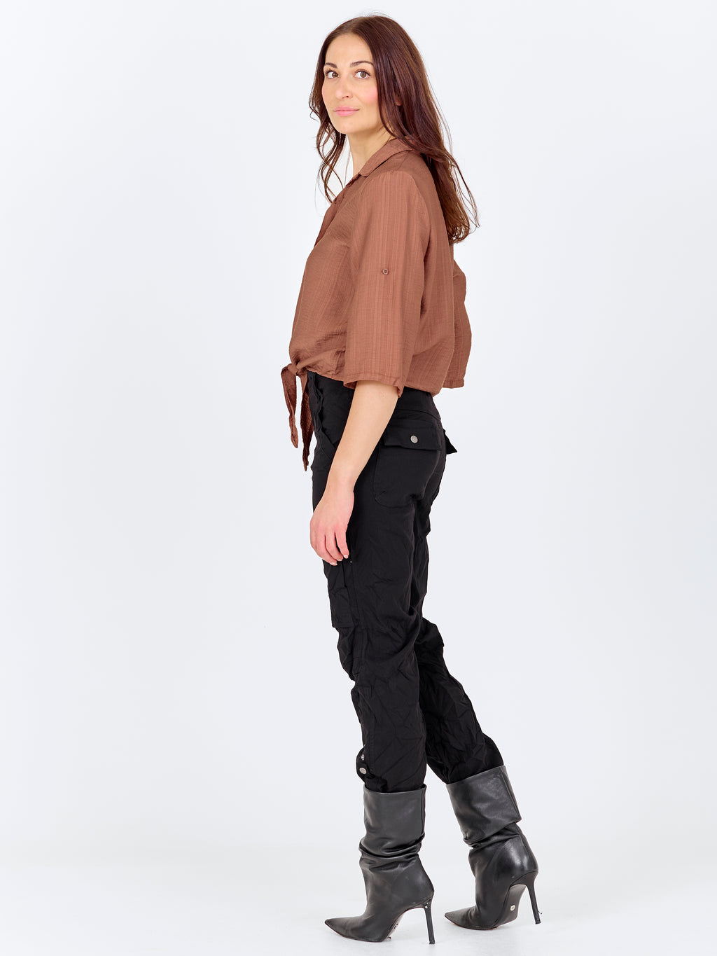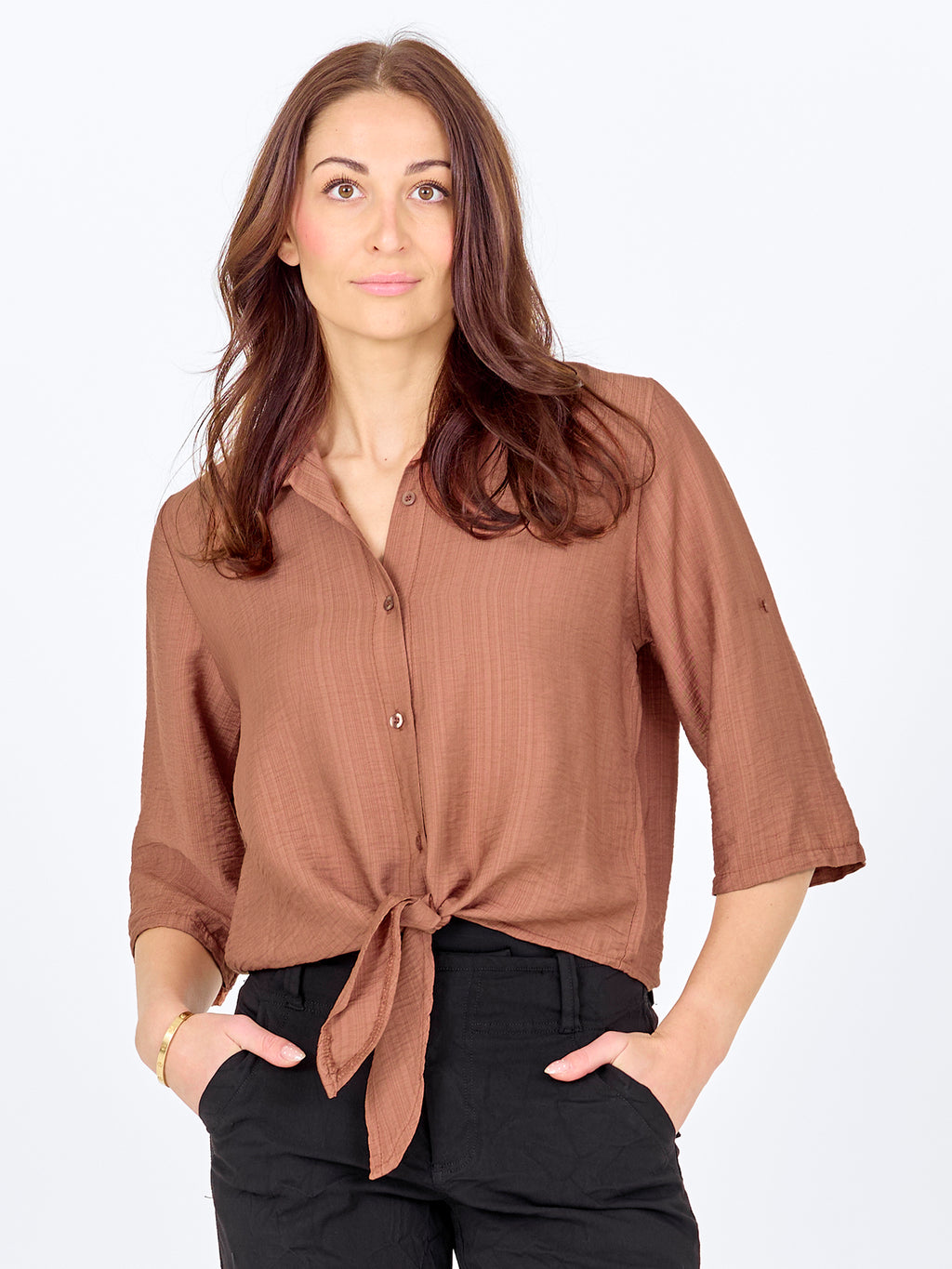 Dit shirt heeft een lichte en ontspannen uitstraling met korte mouwen die opgerold en vastgemaakt kunnen worden met een lus. Aan de voorkant sluit het met knopen en eindigt met een decoratief strikdetail voor een vrouwelijke touch. De achterkant is eenvoudig en recht gesneden. Combineer het shirt met losse broeken, een rok of shorts voor een relaxte alledaagse look, of draag het open over een simpele top op warme dagen.