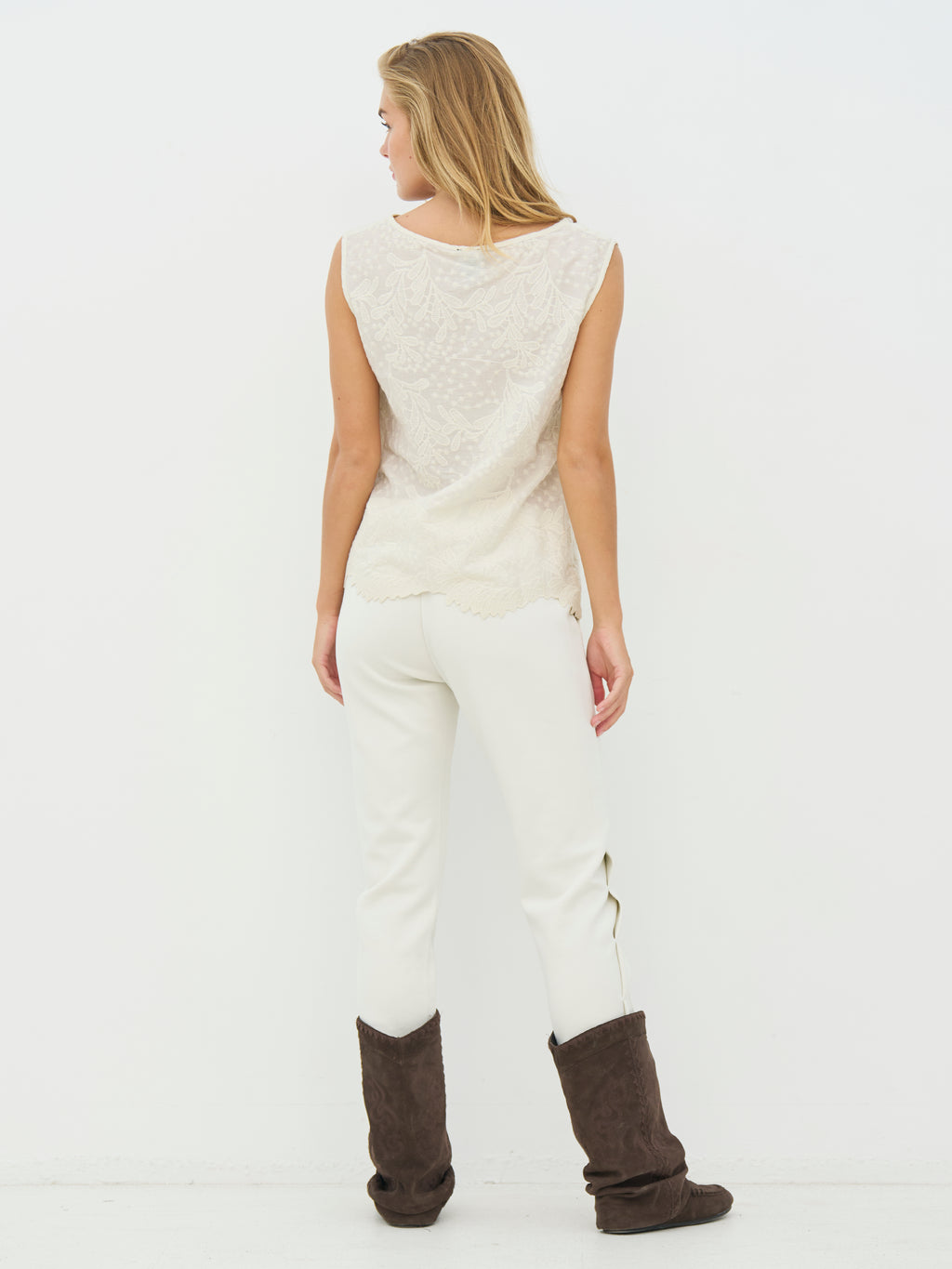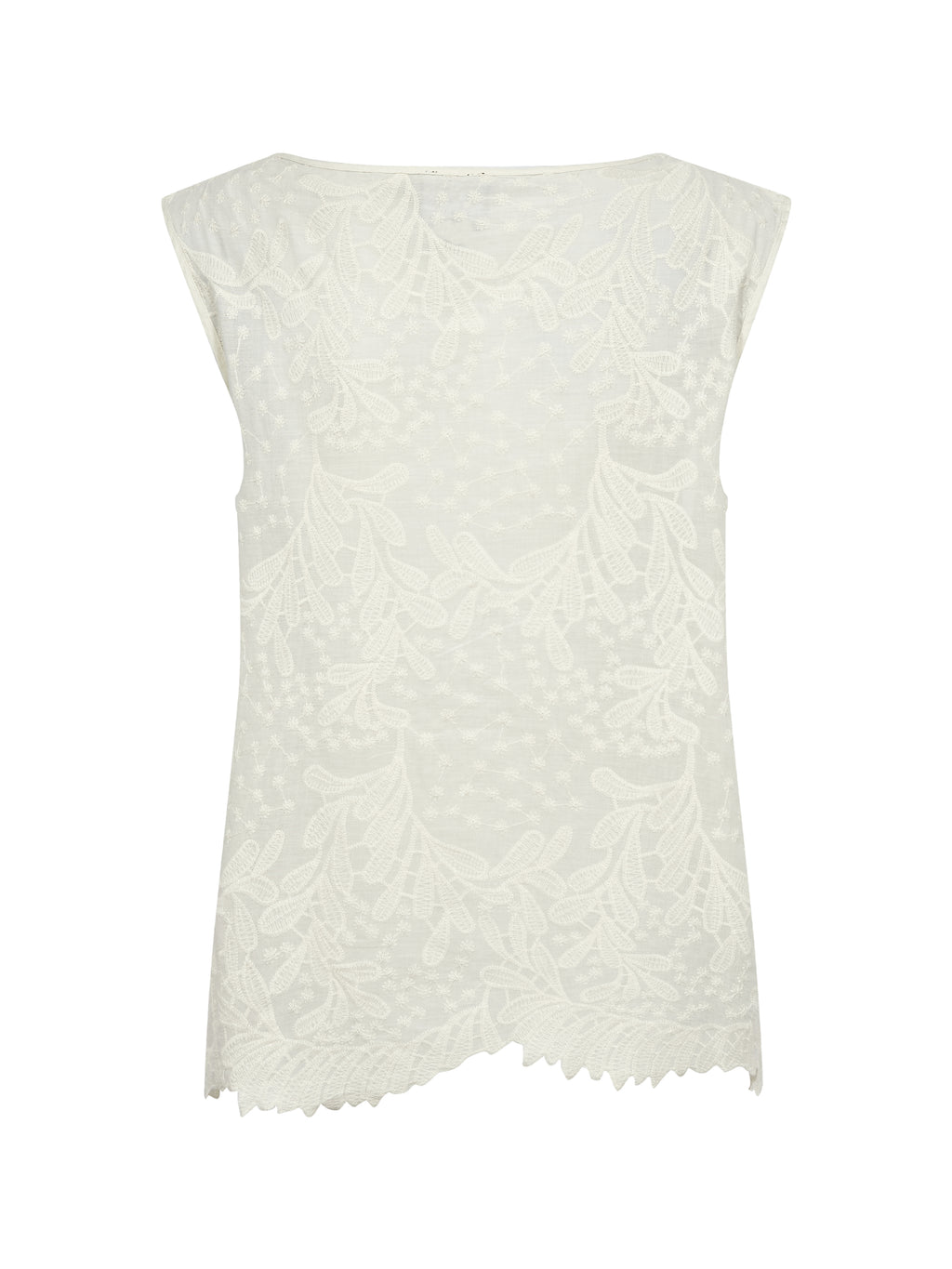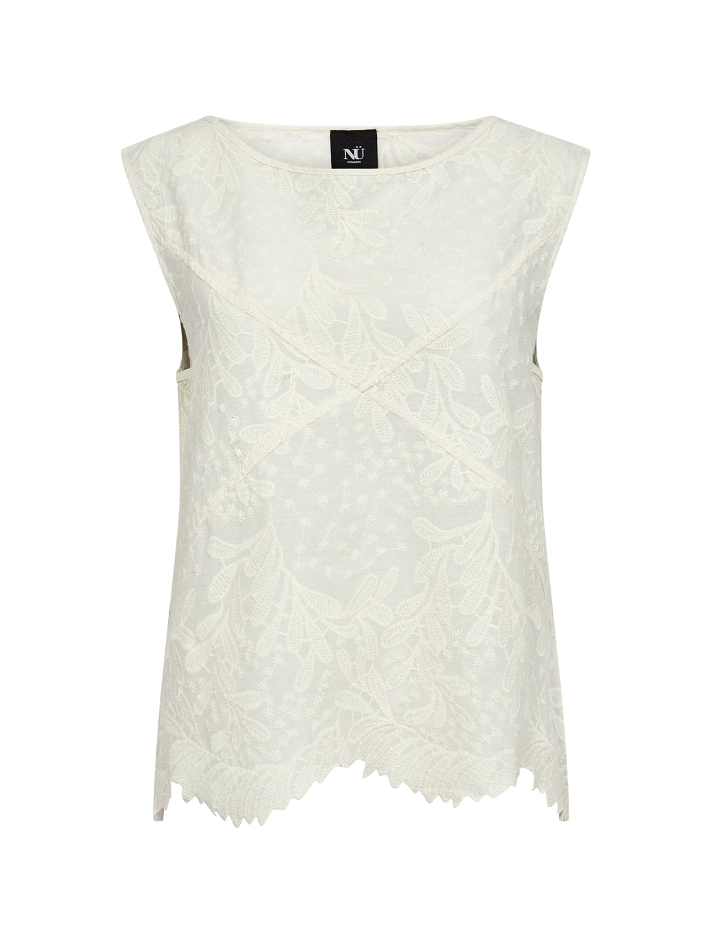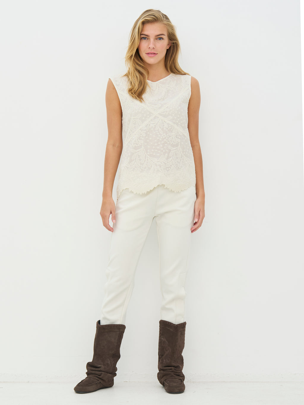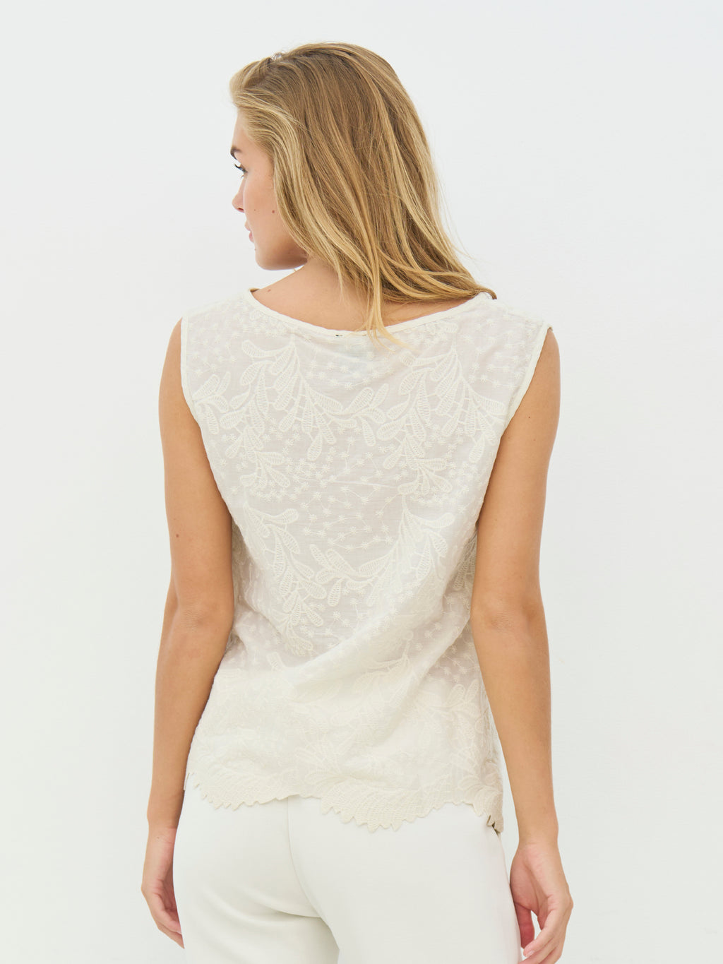 Deze top heeft een eenvoudige en vrouwelijke uitstraling met een lichte, rechte pasvorm. De mouwloze snit zorgt voor een strakke look, terwijl de onderkant discreet spel aan de silhouet toevoegt. De top valt zacht langs het lichaam en is gemakkelijk zowel alleen als samen met de bijpassende stukken te stylen voor een complete uitstraling.