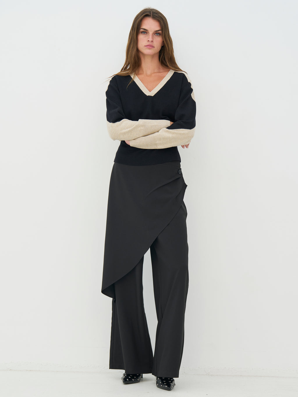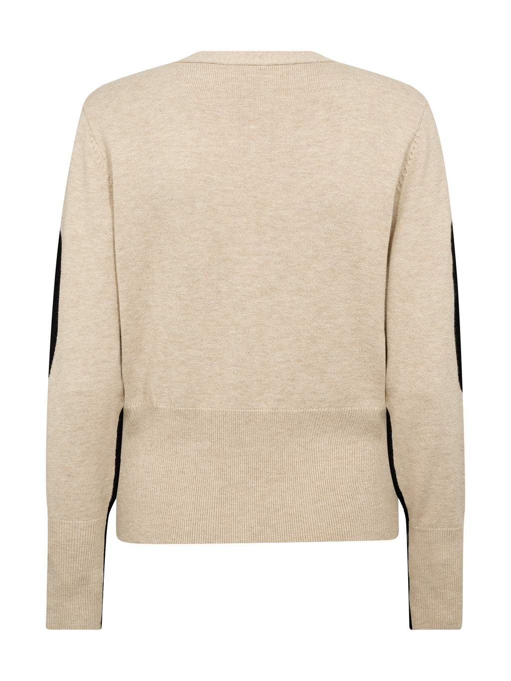 Deze gebreide trui heeft een eenvoudige maar opvallende uitstraling met contrastpanels die het ontwerp een grafisch speelselement geven. De trui heeft een klassieke V-hals, terwijl de achterkant rustiger is en balans brengt. De lange mouwen volgen dezelfde contrastdetails en zorgen voor een samenhangende uitstraling vanuit elke hoek. Stijl de trui met een paar klassieke broeken of een rok voor een relaxte, maar doordachte dagelijkse outfit.