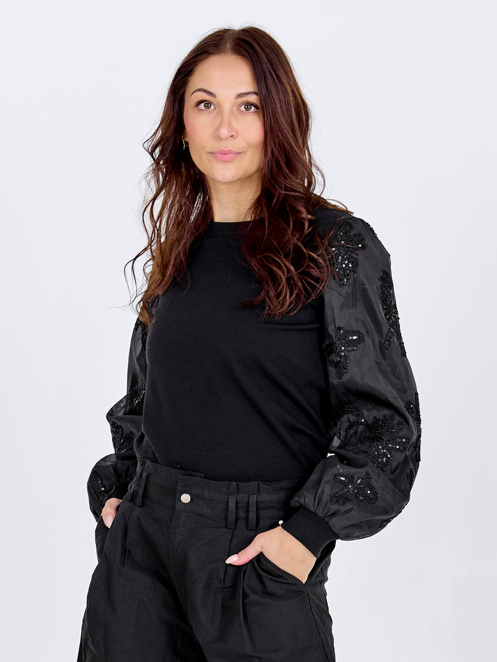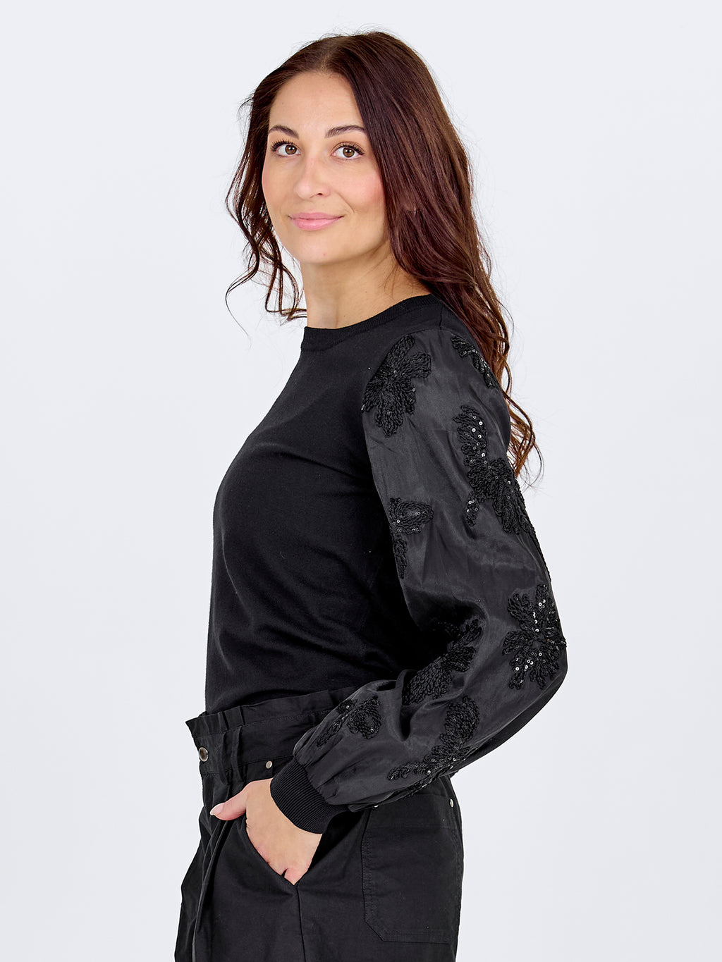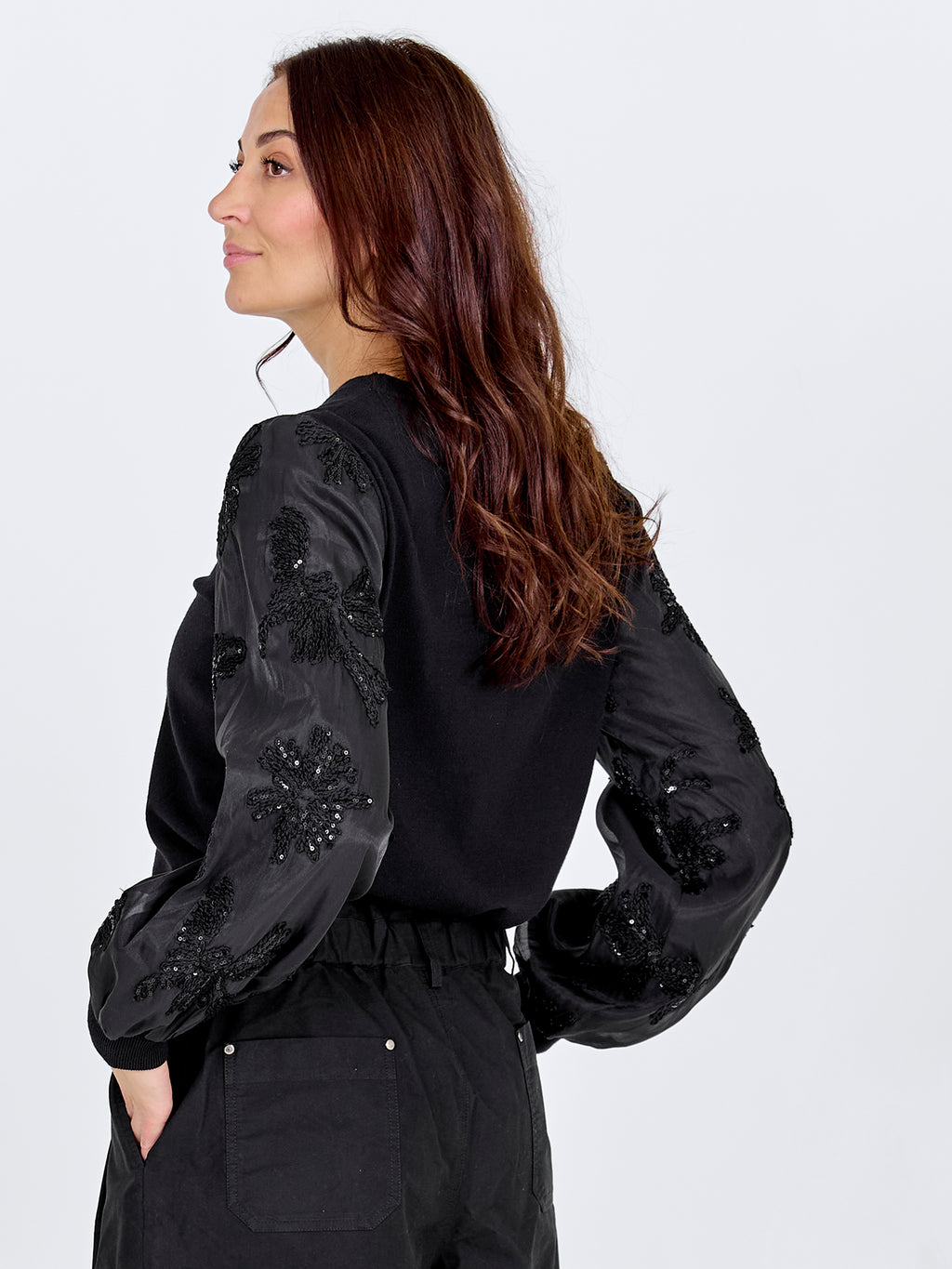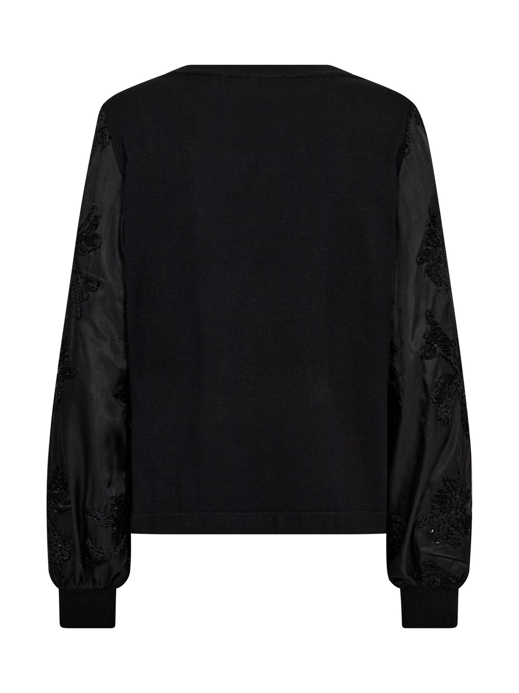 De blouse heeft een eenvoudige voorkant met een gebreid bovendeel dat een rustige en ontspannen uitstraling geeft. De mouwen zijn gemaakt van een licht, doorschijnend materiaal met geborduurde bloemen, wat de blouse een vrouwelijke uitstraling geeft. De achterkant is eenvoudig gehouden en laat de mouwen de aandacht trekken. Style de blouse met een eenvoudige broek of een rok voor een mooie alledaagse look die ook geschikt is voor meer formele gelegenheden.