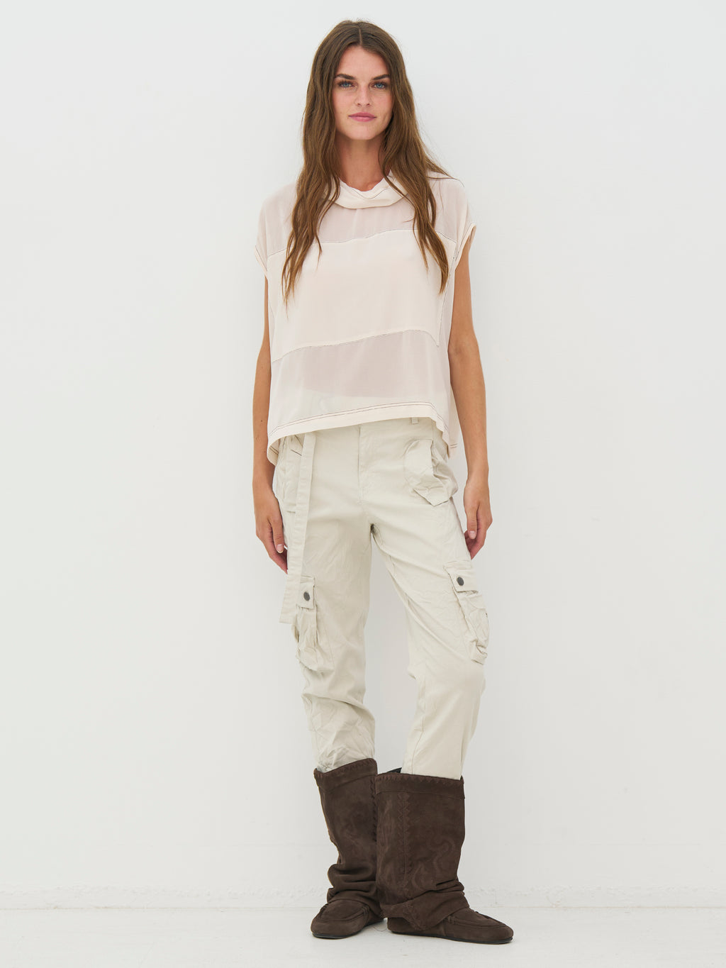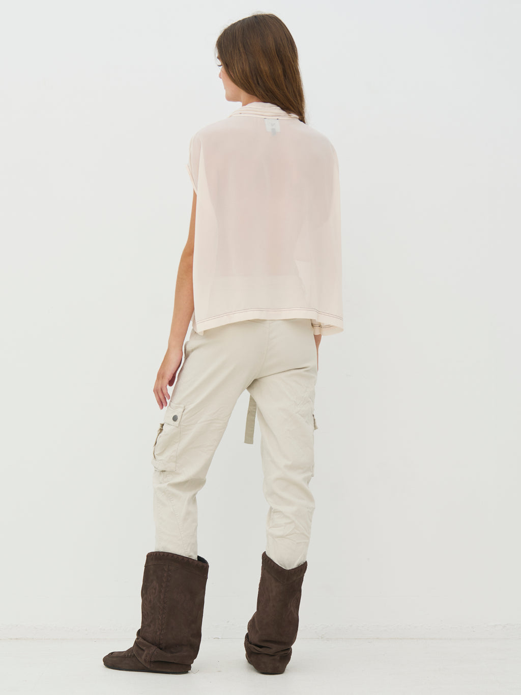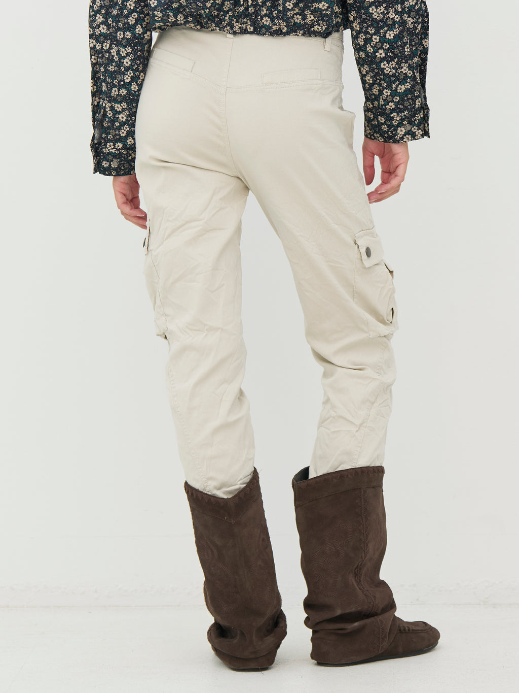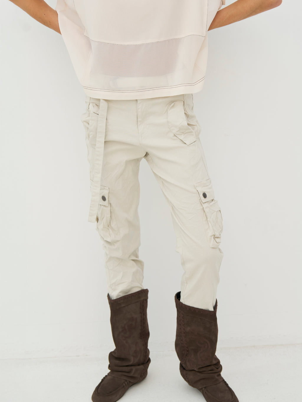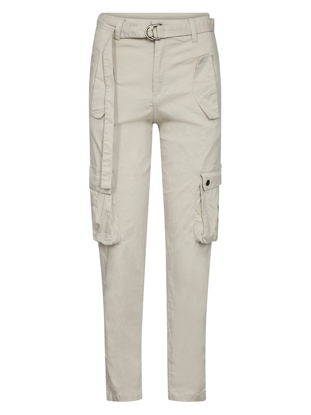 Deze broek heeft een opvallende en moderne uitstraling met een rechte pasvorm en decoratieve zakken die het een stoer tintje geven aan de look. De taille is afgewerkt met een riem en gesp, wat een stoere, stijlbewuste twist toevoegt. De broek valt mooi langs de benen en is gemakkelijk te combineren met zowel een eenvoudige top als een meer opvallend overhemd.