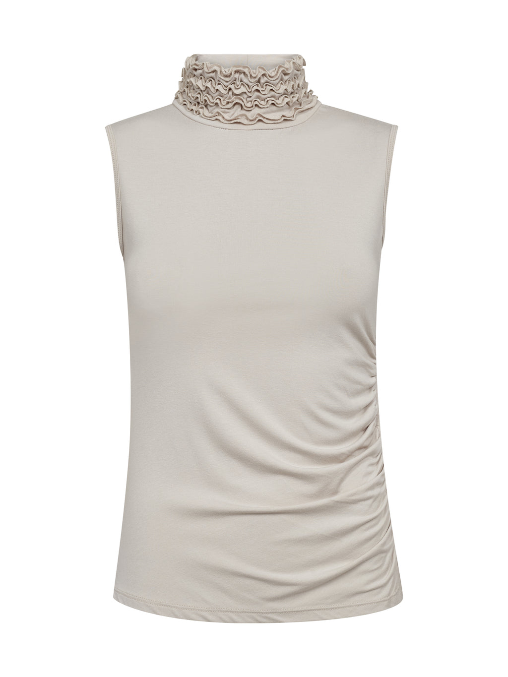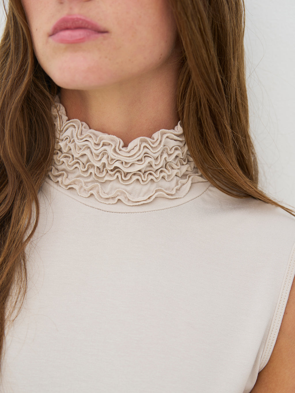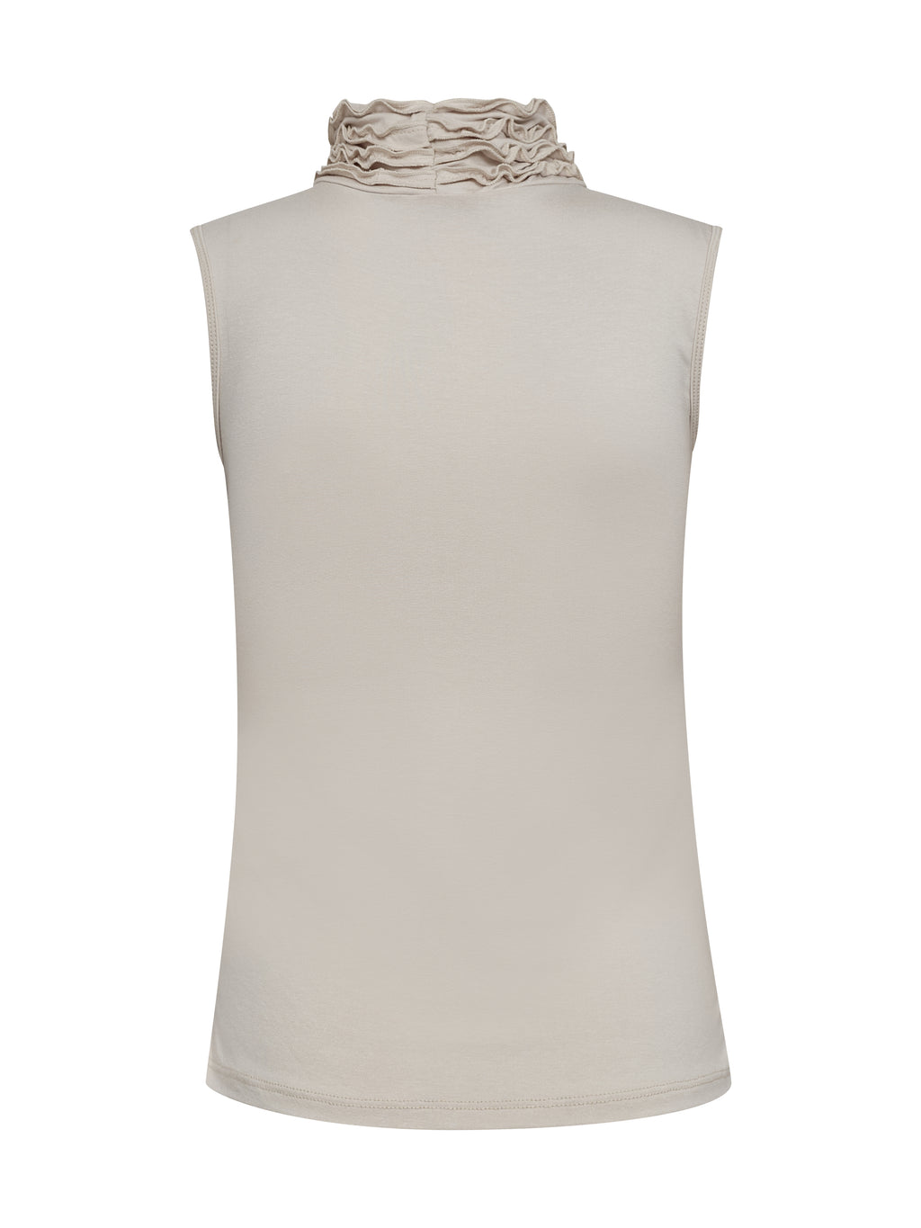 Deze top heeft een eenvoudige en vrouwelijke uitstraling met een nauwsluitende pasvorm en hoge hals, afgewerkt met fijne, zachte ruches. De voorkant is glad en rustig, terwijl de zijkant is verzameld met lichte plooien, wat vorm en beweging geeft. Style de top onder een jas of vest, of draag hem alleen met broek, shorts of een rok voor een elegant alledaags uiterlijk.