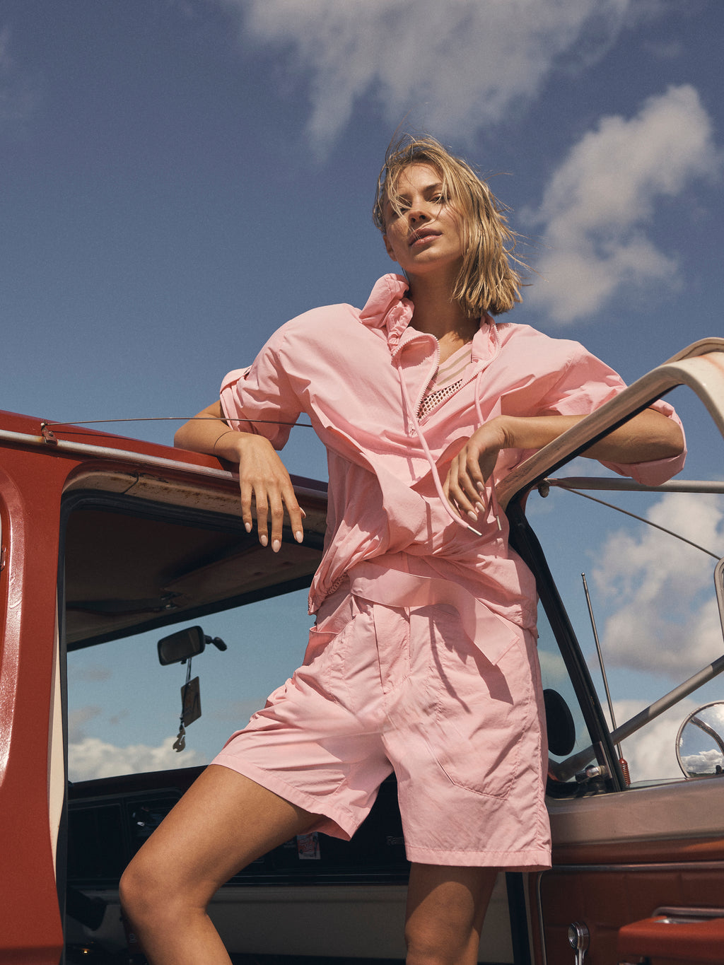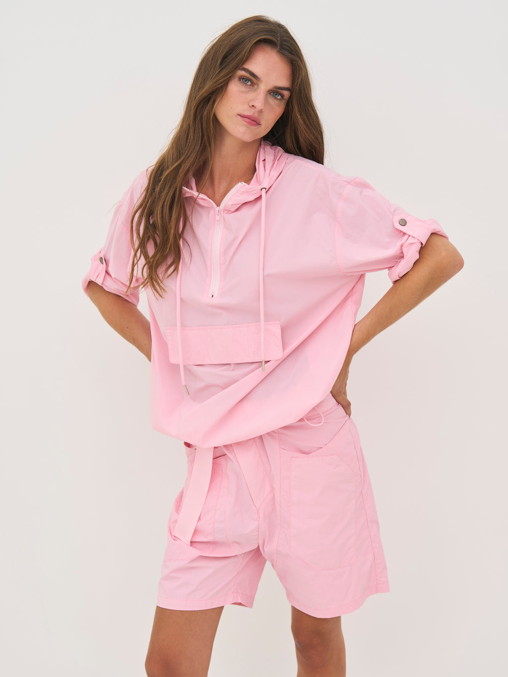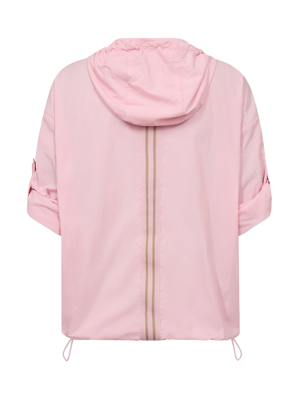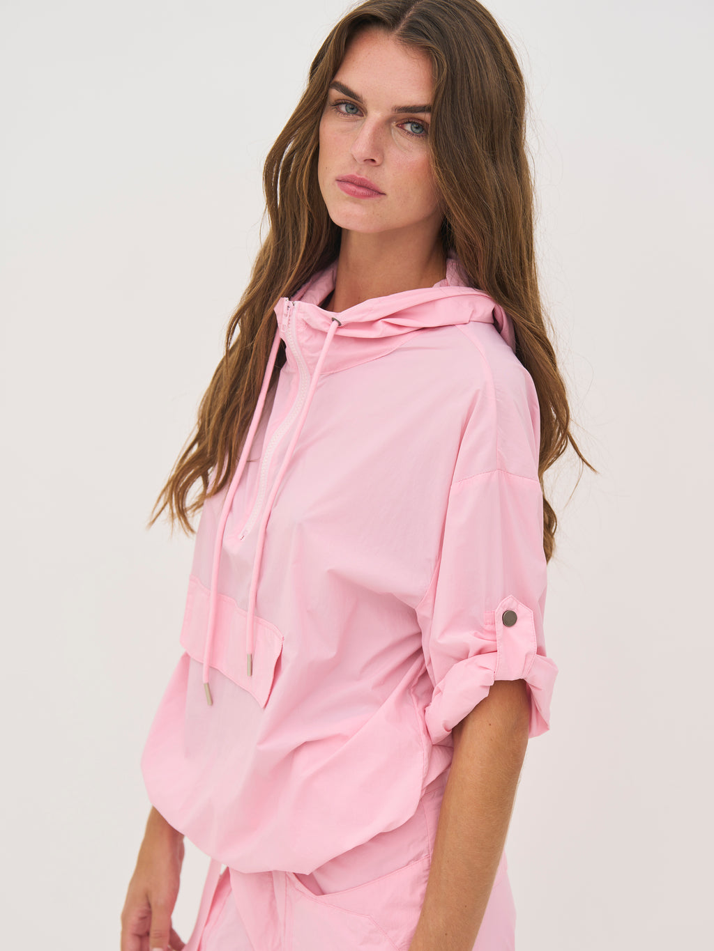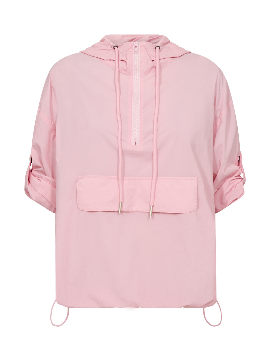 Deze blouse heeft een lichte en luchtige uitstraling, waardoor hij ideaal is voor laagjes tijdens overgangsperiodes. Het is ontworpen met een halve rits en capuchon met trekkoord, wat zorgt voor een sportief en functioneel tintje. De mouwen kunnen worden versteld en vastgemaakt met een lus en drukknoop, wat flexibiliteit geeft aan de uitstraling. Het elastische koord onderaan maakt het mogelijk om de pasvorm aan te passen, terwijl het gestreepte detail aan de achterkant voor een subtiel contrast zorgt.