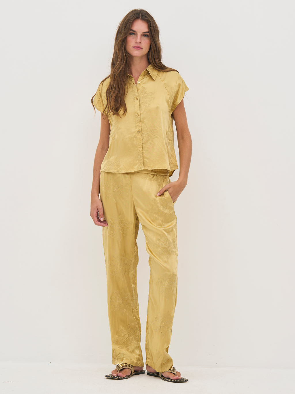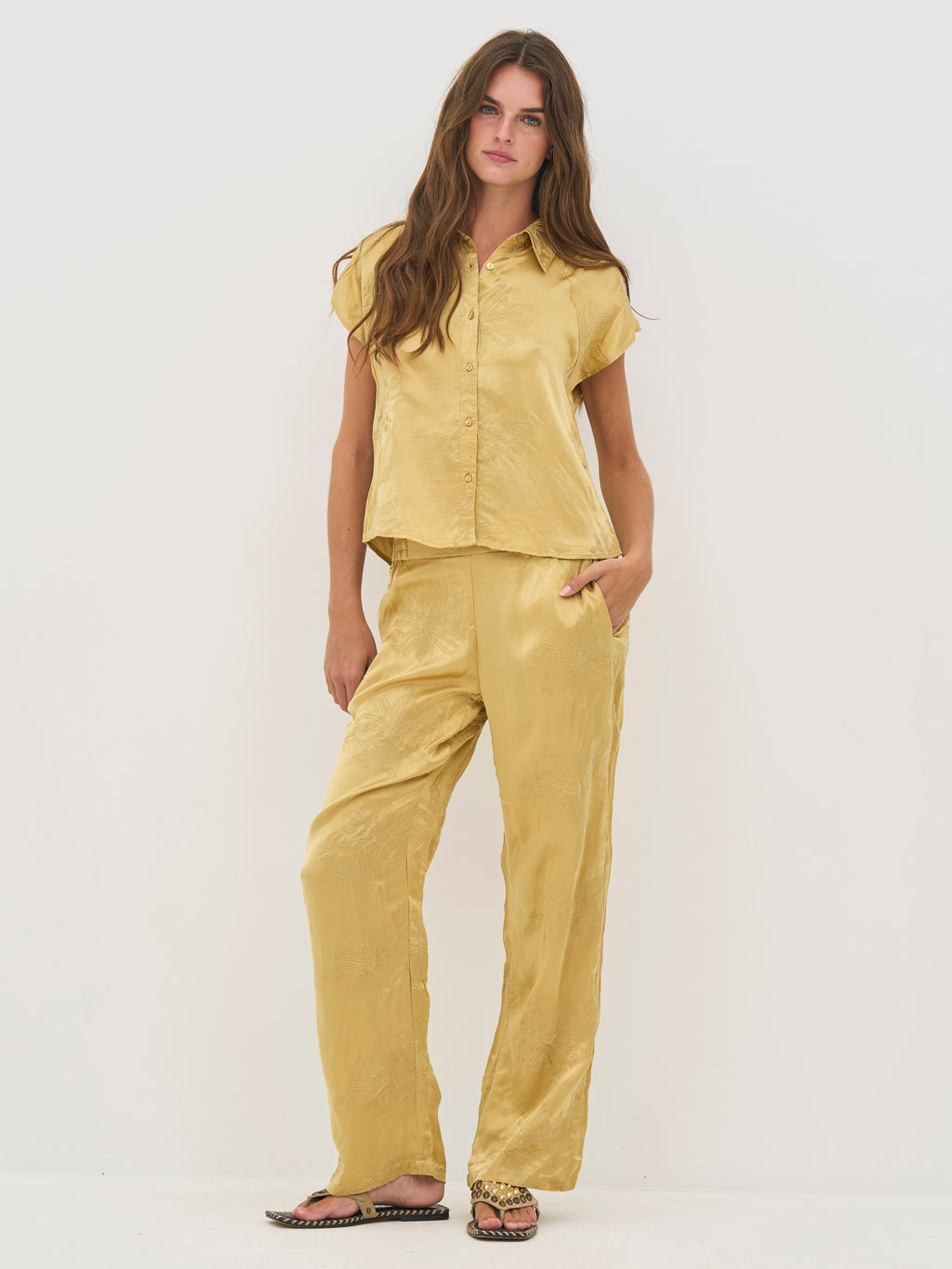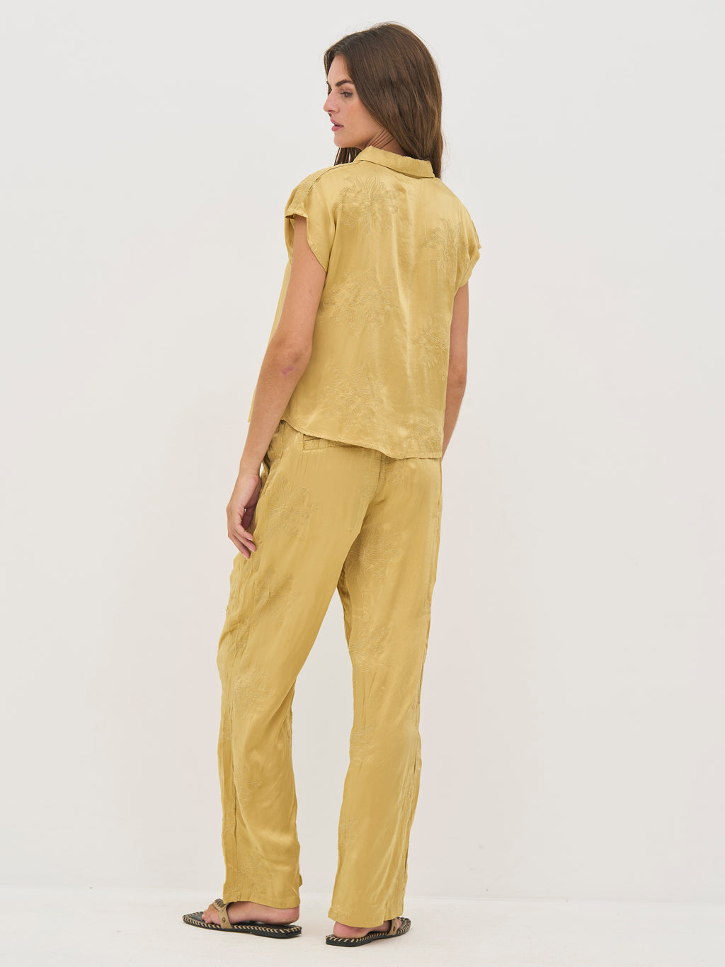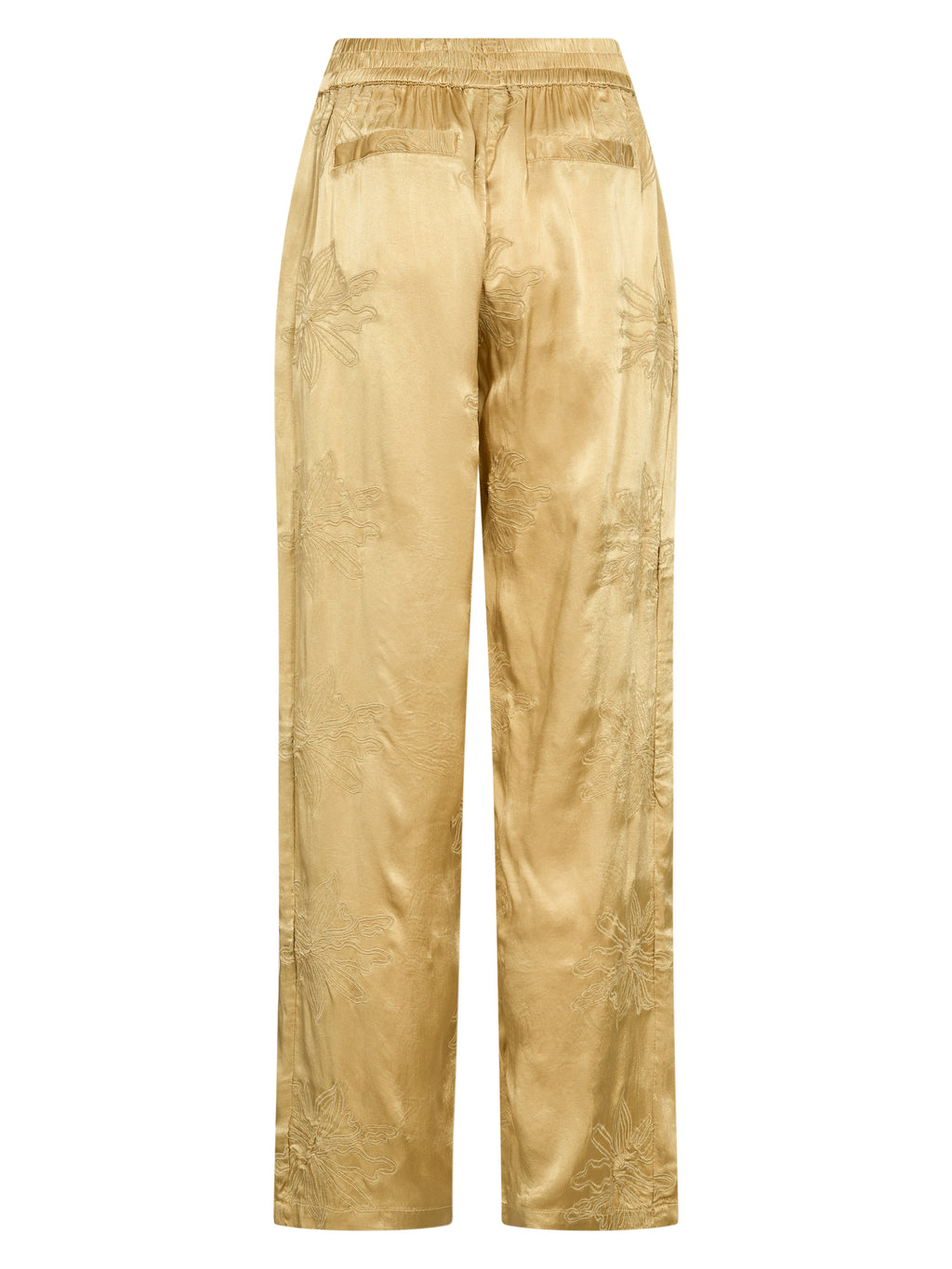 Deze broek is gemaakt van 100% viscose met een lichte glans, wat zorgt voor een elegant en vloeiend uiterlijk. De fijne, ton-sur-ton geborduurde details voegen een discrete en exclusieve uitstraling toe, terwijl de lange, rechte pijpen zorgen voor een rustige en stijlvolle silhouet. Elastiek aan de achterkant van de taille zorgt voor een comfortabele en flexibele pasvorm.