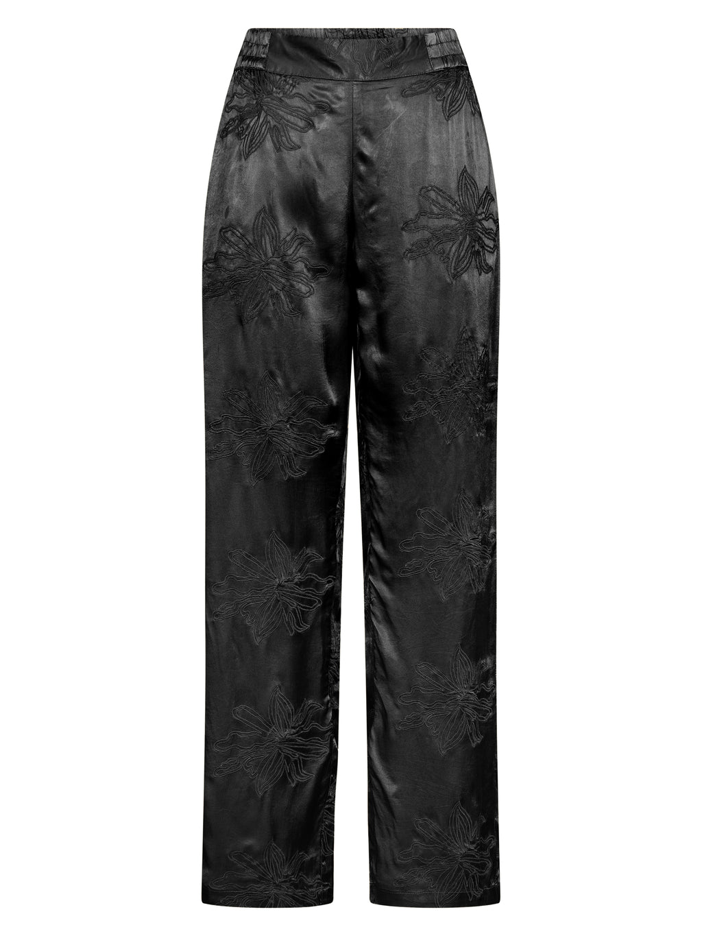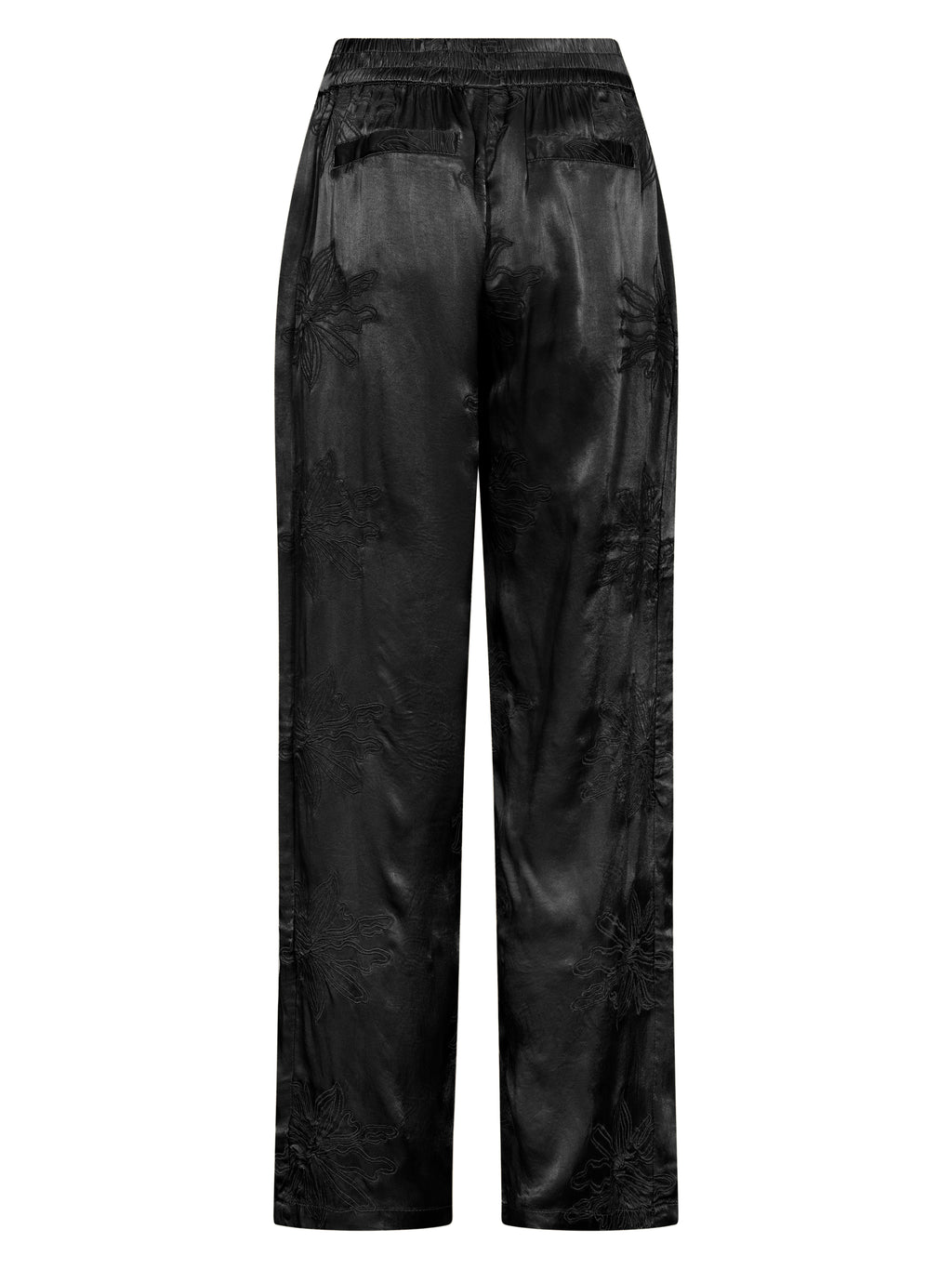Deze broek is gemaakt van 100% viscose met een lichte glans, wat zorgt voor een elegant en vloeiend uiterlijk. De fijne, ton-sur-ton geborduurde details voegen een discrete en exclusieve uitstraling toe, terwijl de lange, rechte pijpen zorgen voor een rustige en stijlvolle silhouet. Elastiek aan de achterkant van de taille zorgt voor een comfortabele en flexibele pasvorm.