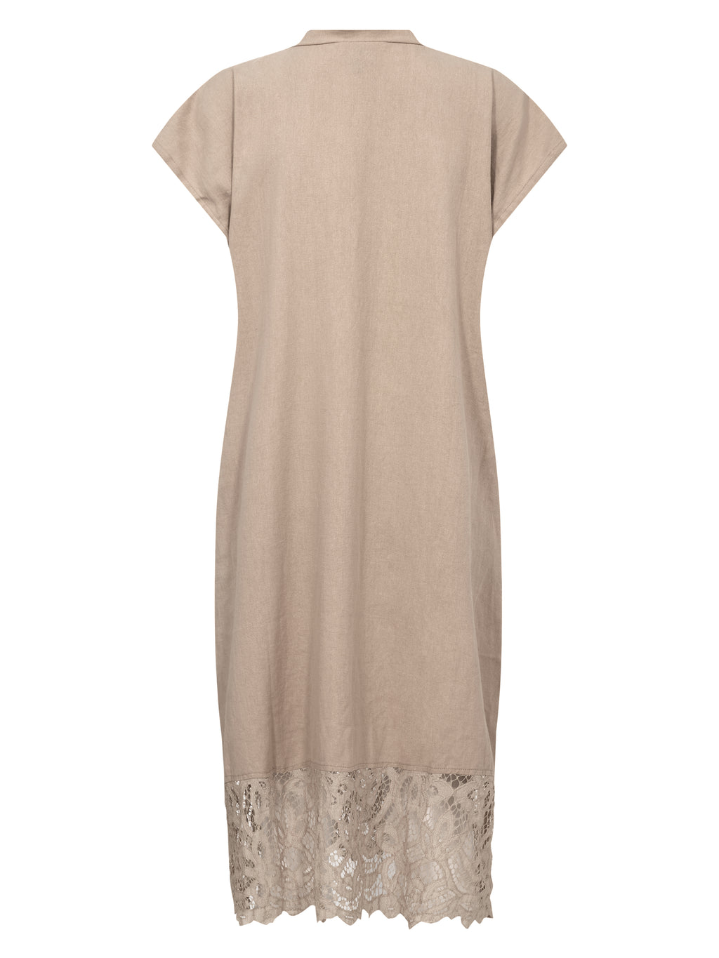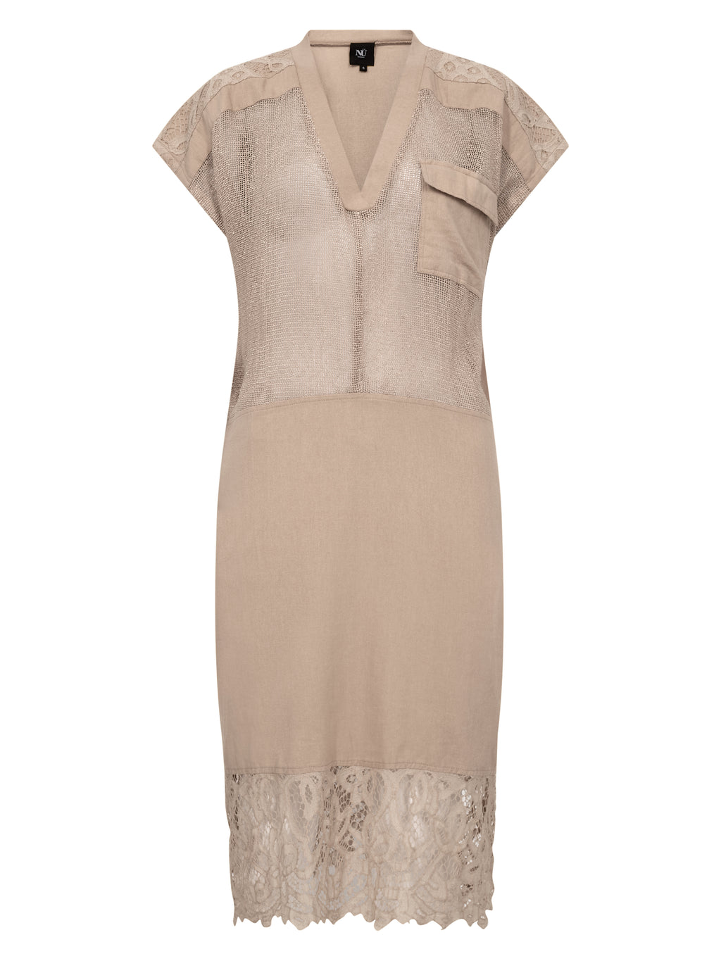 Een vrouwelijke jurk met een lichte en textuurrijke uitstraling. De zachte kwaliteit voelt comfortabel aan op de huid, terwijl de bouclé-detail aan de voorkant en fijne kant op schouders en boord een prachtig contrast creëren. De relaxte pasvorm en V-hals geven een moeiteloze uitstraling die gemakkelijk te stylen is. Draag het voor dagelijks gebruik of verhoog de uitstraling voor speciale gelegenheden met eenvoudige accessoires.