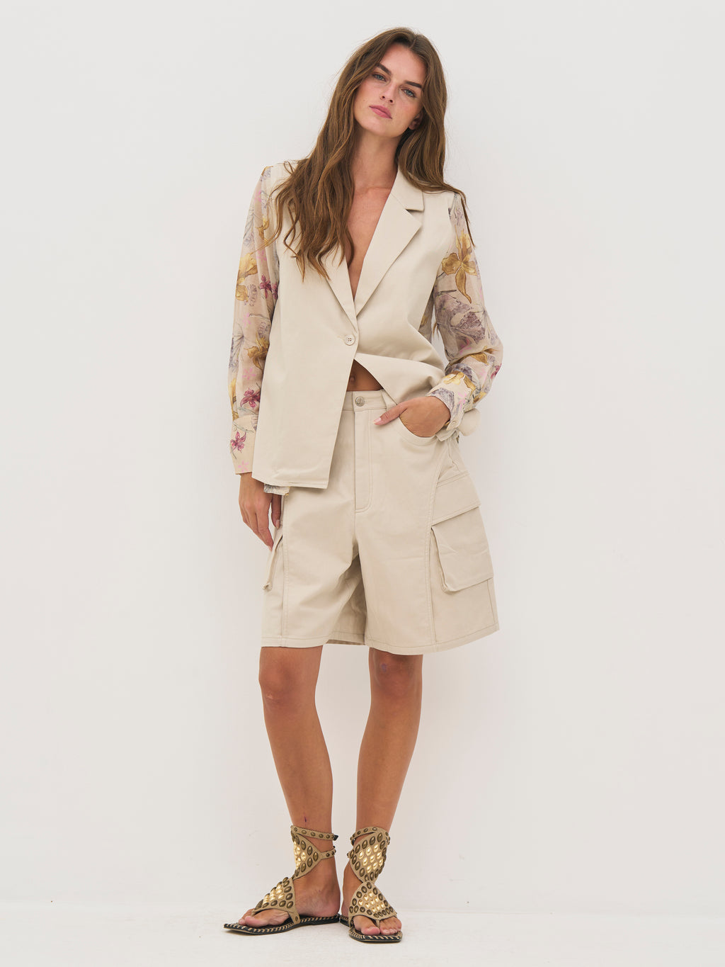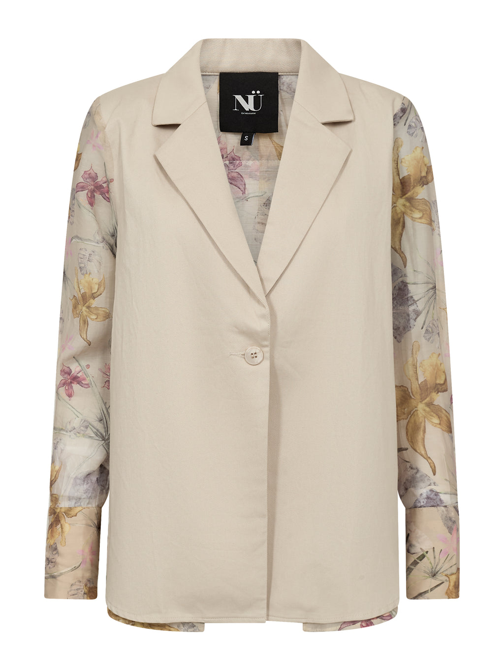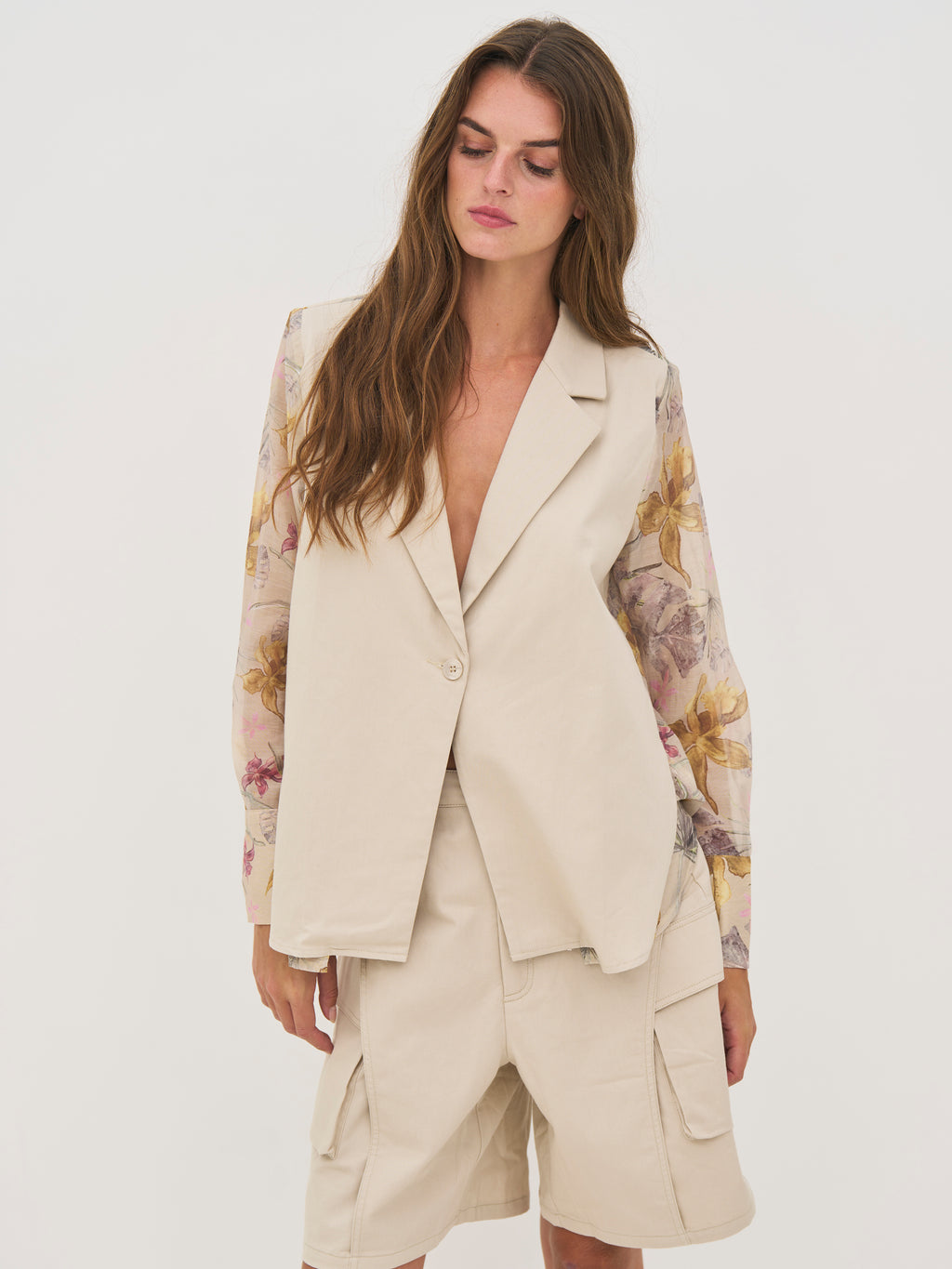 Deze blazer combineert een gestructureerde kwaliteit aan de voorkant met lichte, transparante details op de mouwen en de achterkant, wat een spannende en vrouwelijke uitstraling creëert. Het heeft een klassieke pasvorm met revers en een eenvoudige knoopsluiting, wat een nette en tijdloze uitstraling geeft. De zachte, lichte mouwen voegen contrast en beweging toe aan het verder eenvoudige ontwerp.