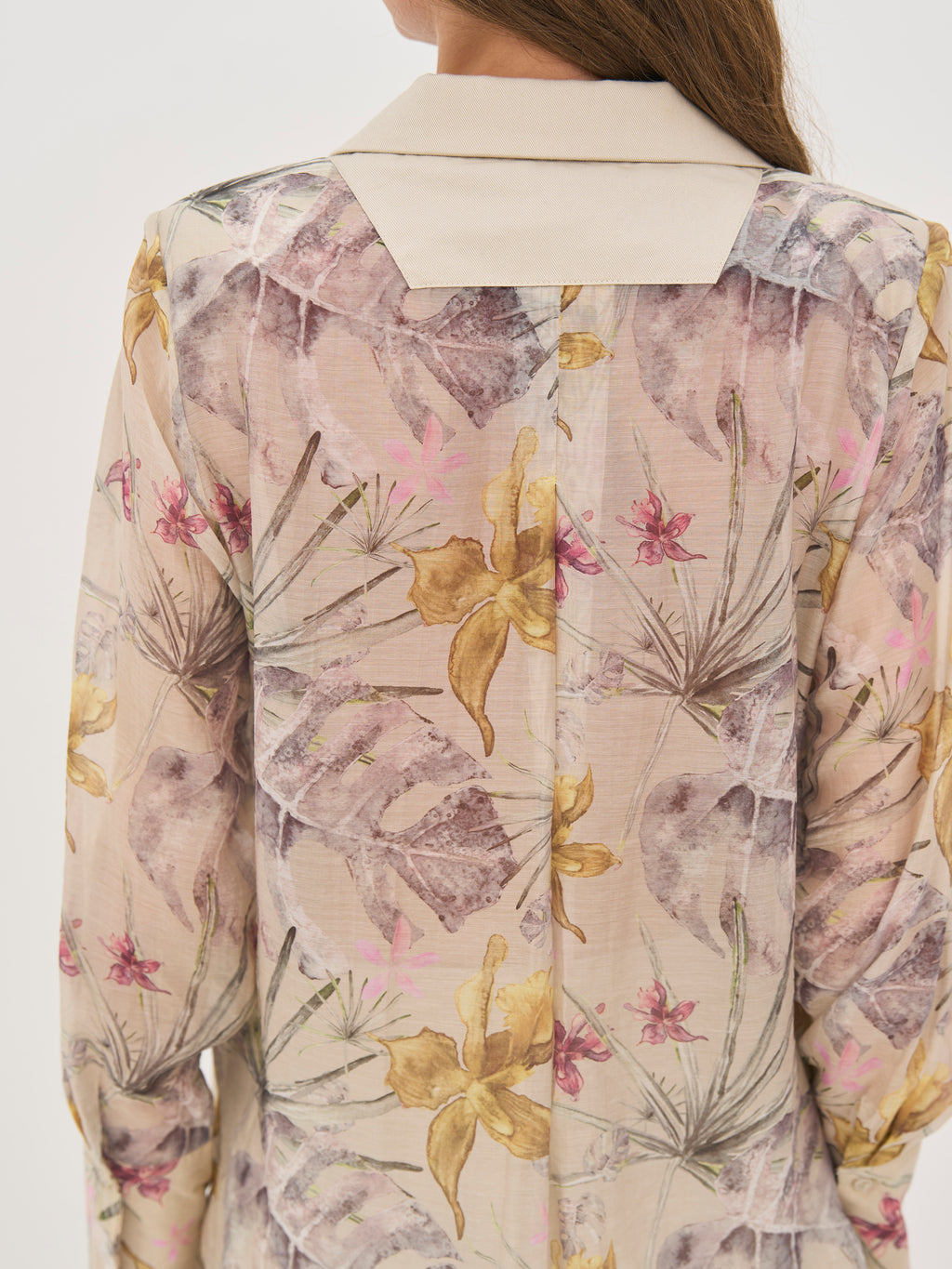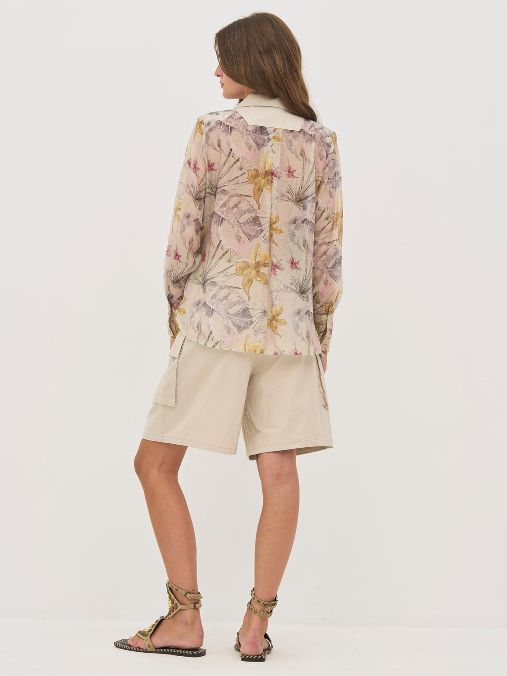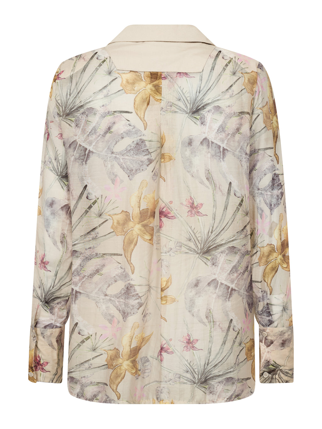 Deze blazer combineert een gestructureerde kwaliteit aan de voorkant met lichte, transparante details op de mouwen en de achterkant, wat een spannende en vrouwelijke uitstraling creëert. Het heeft een klassieke pasvorm met revers en een eenvoudige knoopsluiting, wat een nette en tijdloze uitstraling geeft. De zachte, lichte mouwen voegen contrast en beweging toe aan het verder eenvoudige ontwerp.