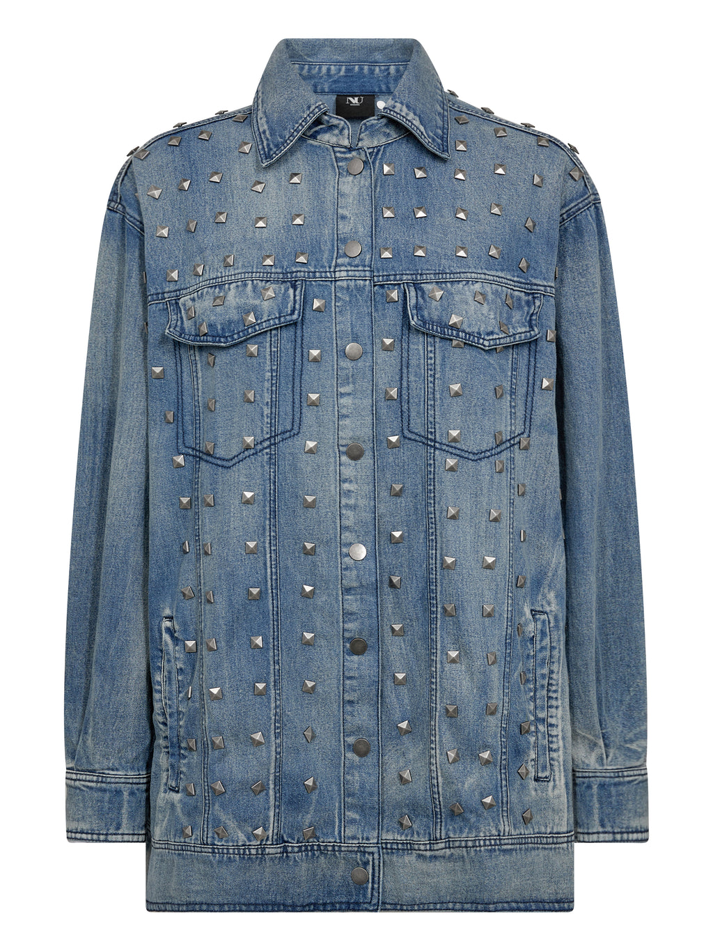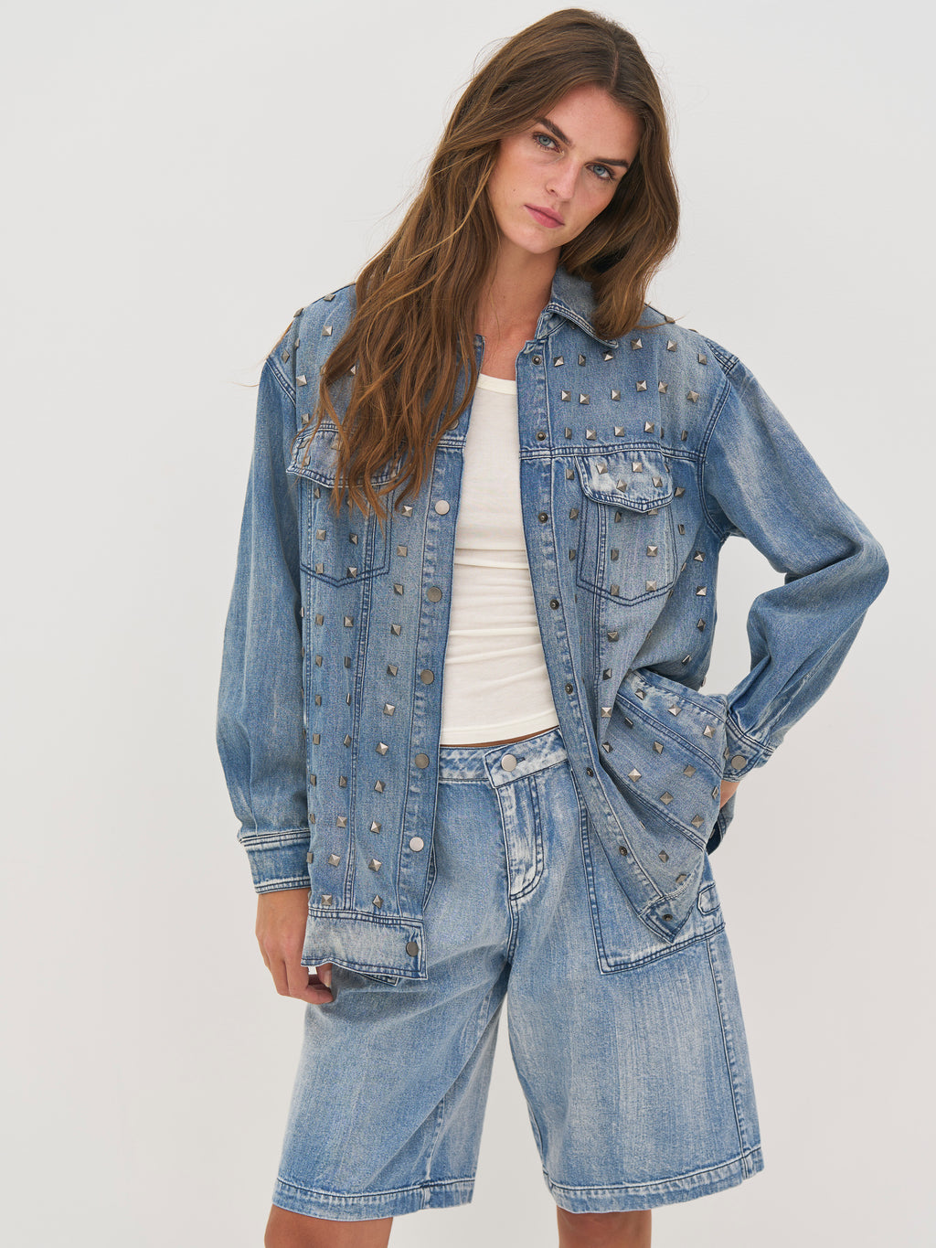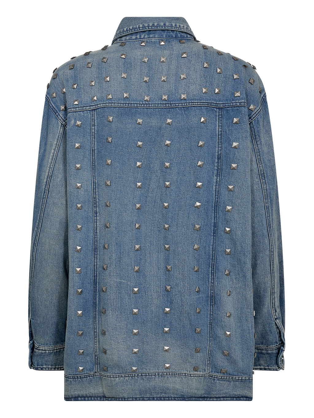Deze jas is gemaakt van katoendenim met een licht gewassen afwerking, wat een ruwe en relaxte uitstraling geeft. Hij is versierd met studs die een opvallende en edgy look geven. De oversized pasvorm maakt hem ideaal voor laagjes, terwijl de knoopsluiting aan de voorkant en de praktische zakken het functionele ontwerp compleet maken.