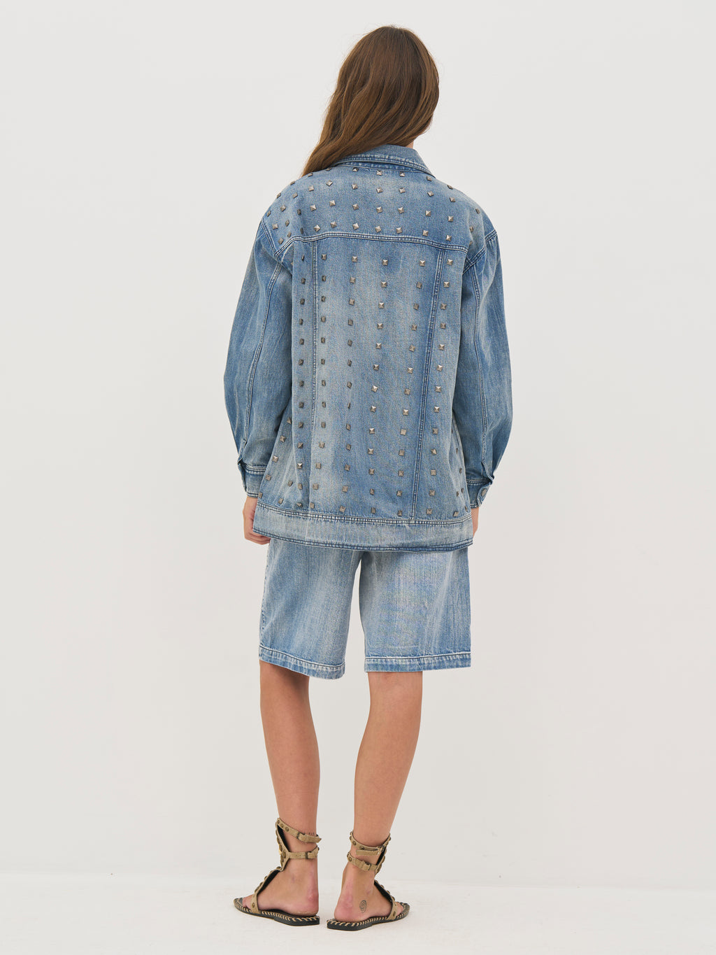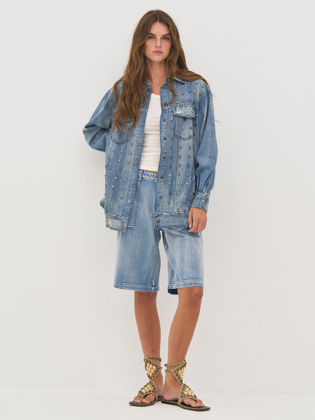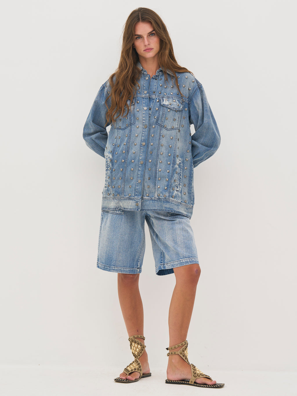 Deze jas is gemaakt van katoendenim met een licht gewassen afwerking, wat een ruwe en relaxte uitstraling geeft. Hij is versierd met studs die een opvallende en edgy look geven. De oversized pasvorm maakt hem ideaal voor laagjes, terwijl de knoopsluiting aan de voorkant en de praktische zakken het functionele ontwerp compleet maken.