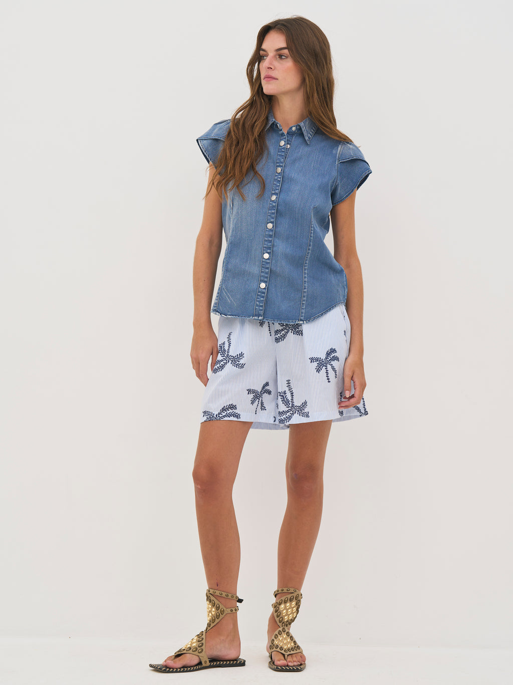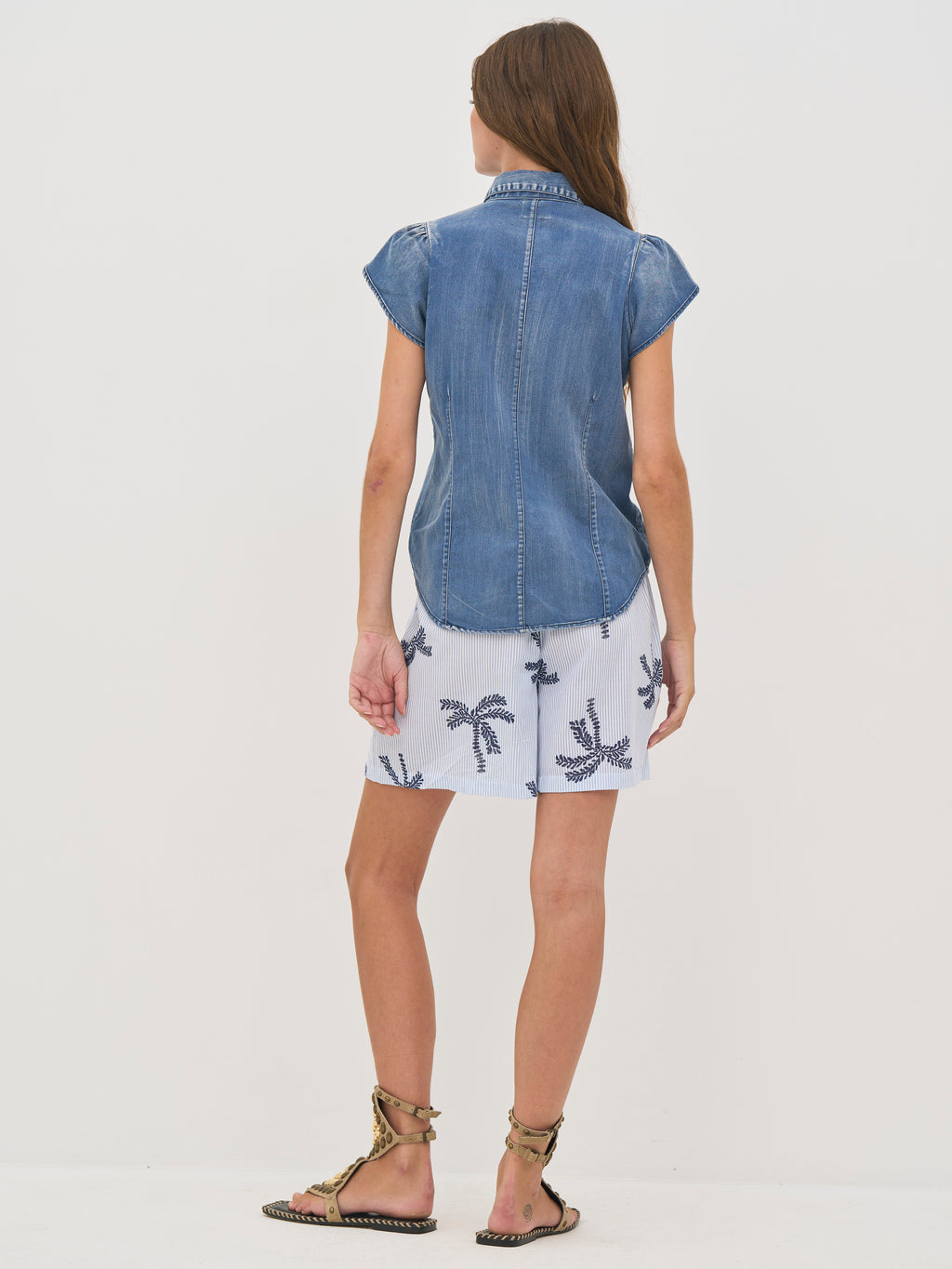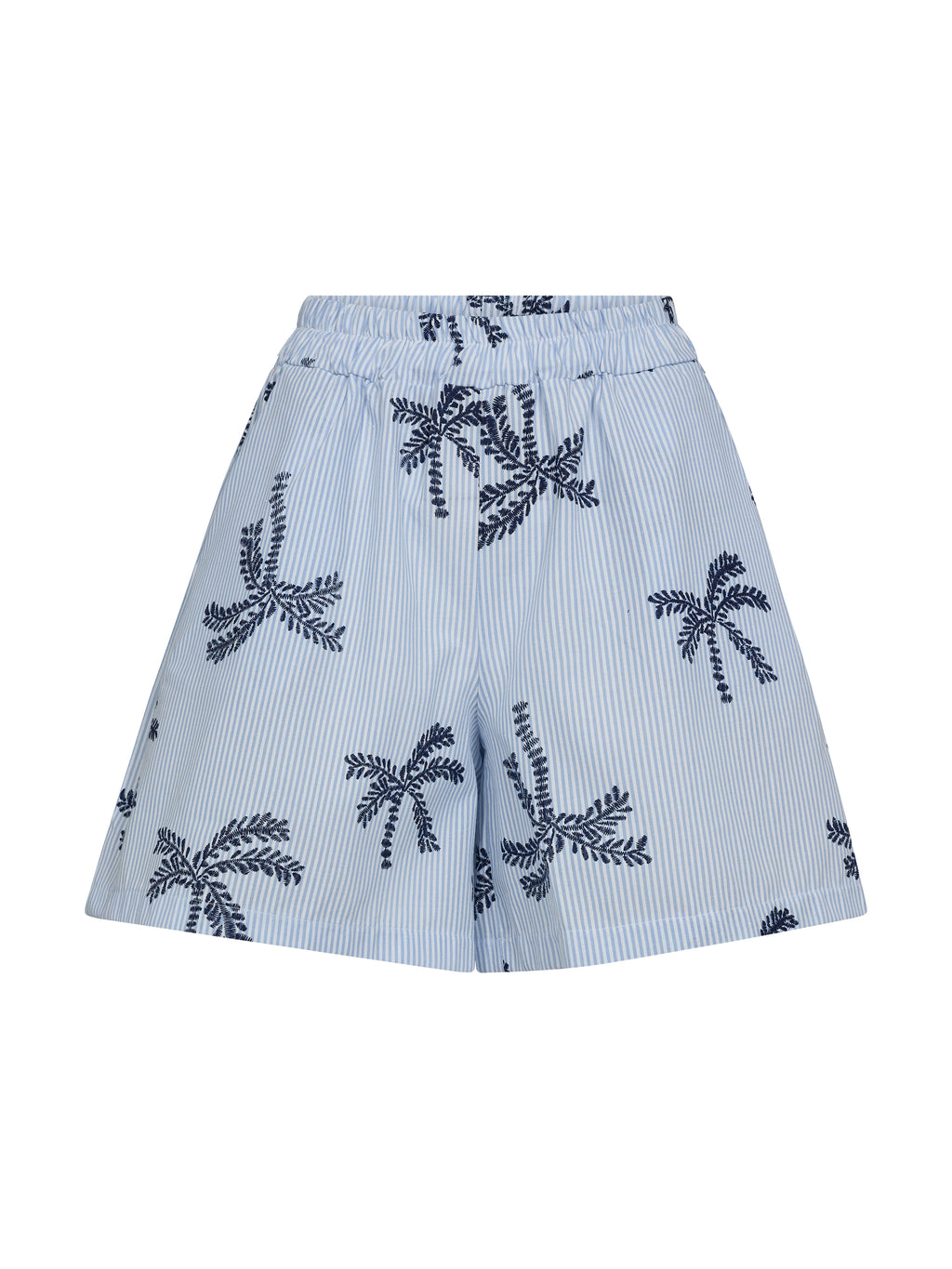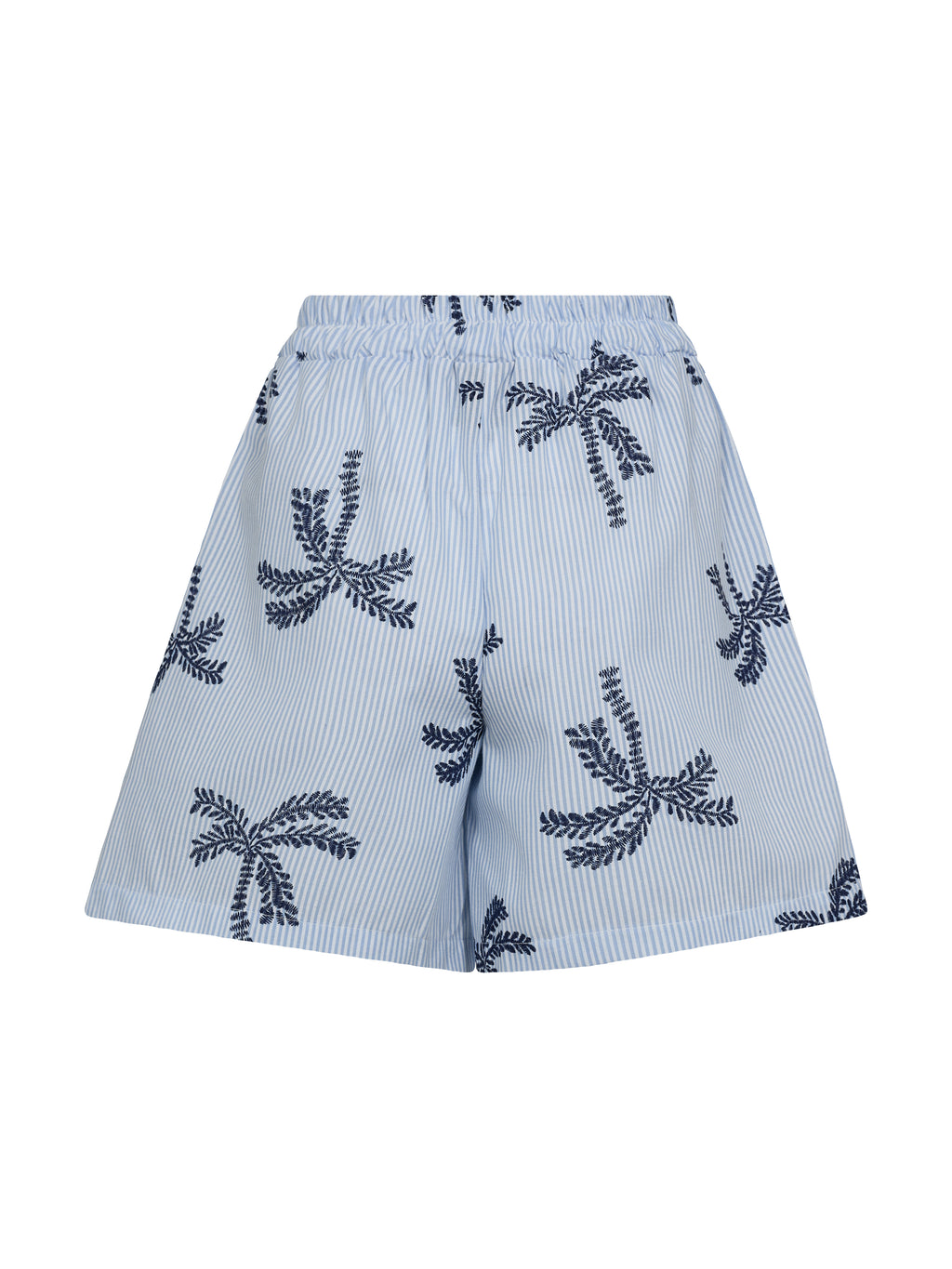 Deze shorts zijn gemaakt van een zachte katoenmix, die zorgt voor een lichte en comfortabele sensatie. Ze hebben een relaxte pasvorm met elastiek in de taille voor een flexibele en comfortabele pasvorm. Het fijne gestreepte patroon gecombineerd met geborduurde palmdetails geeft een zomerse en relaxte uitstraling.