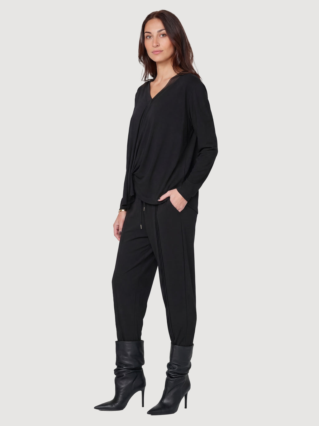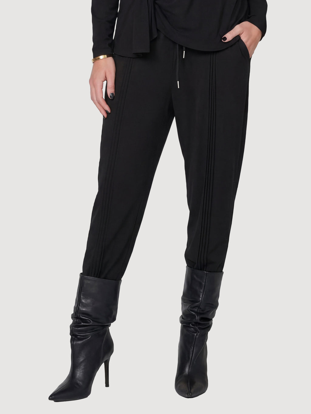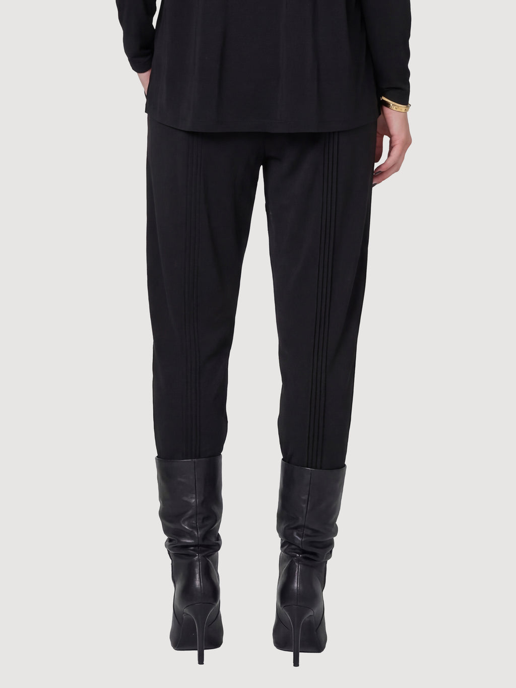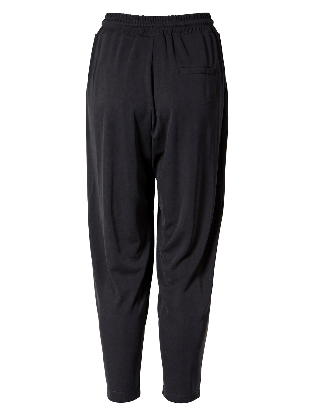 Deze broek combineert een relaxte uitstraling met fijne, doorlopende details langs de benen. Ze hebben een elastische taille met trekkoord, wat zorgt voor een flexibele en comfortabele pasvorm, terwijl het lichte materiaal zacht valt en goede bewegingsvrijheid biedt.